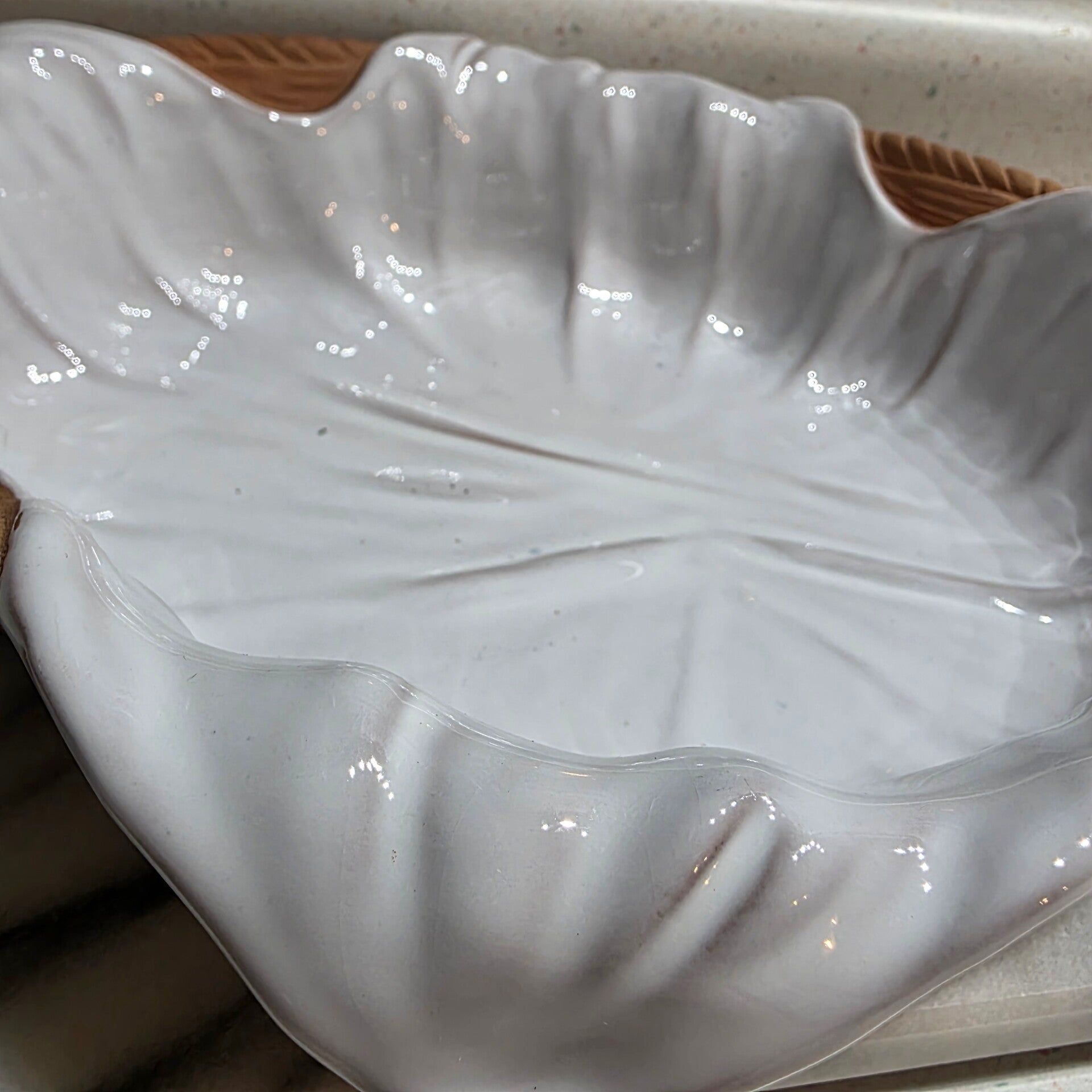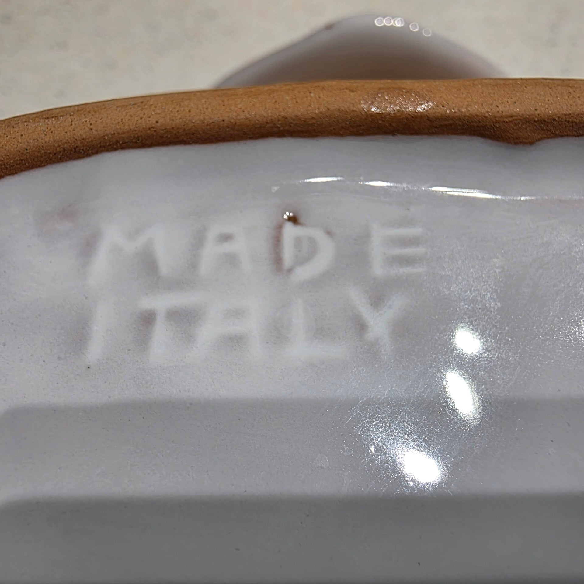 Perfect condition with small glaze spot from manufacturer. Measures 12" x 8.5" x 2 " and has no chips or cracks.