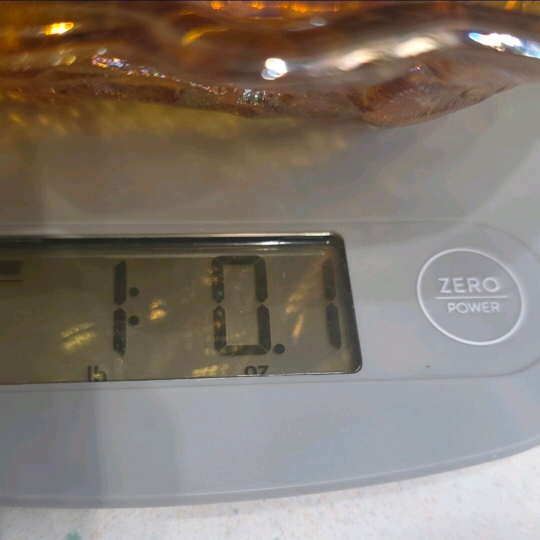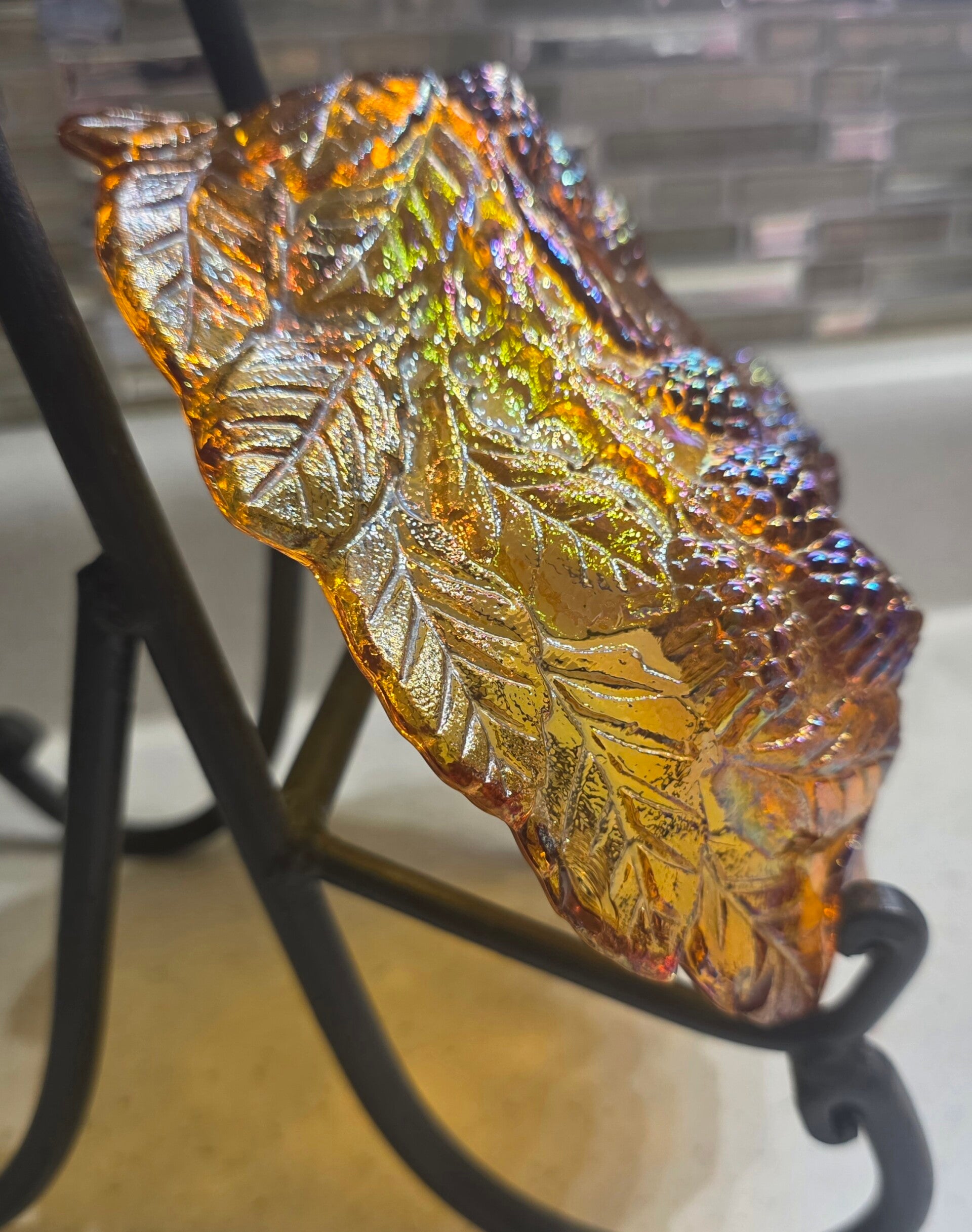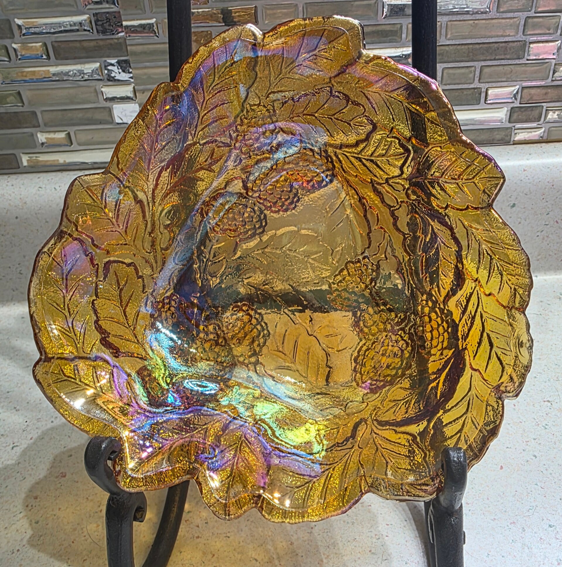 This Gold Iridescent Carnival Glass Decorative Bowl with a Leaf and Berry Pattern is a stunning piece that will add a touch of nature-inspired elegance to any space. This piece reflects light and just glistens! The bowl features a pressed glass design with a glossy finish, making it perfect for all occasions. The leaf and berry pattern adds a festive and decorative touch, while the gold and iridescent color gives it a luxurious and eye-catching appeal. Whether used as a standalone piece or as part of a set, this bowl is sure to enhance the beauty of any home décor. Measures 7" x 7" x 2" and weighs just over 1 lb. Like new with no chips or cracks. Just beautiful!