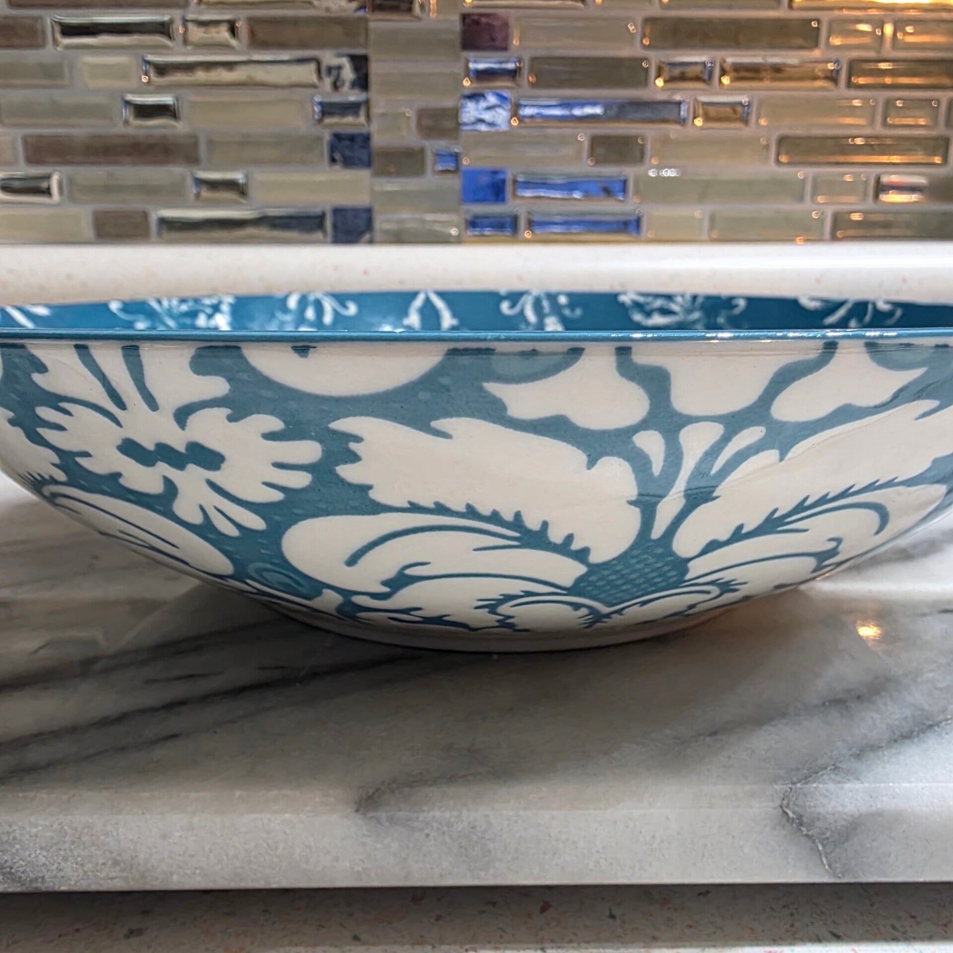 The Certified International Teal/White Porcelain Round Serving Bowls are a stylish addition to any kitchen or dining table. With a floral damask pattern in blue and white, these serving bowls are both functional and visually appealing. Made of porcelain with a shiny finish, these bowls are microwave and dishwasher safe for easy cleaning and use. Perfect for adults looking to add a touch of elegance to their food presentation, these round serving bowls are a must-have for any home. Perfect condition with no chips or cracks.