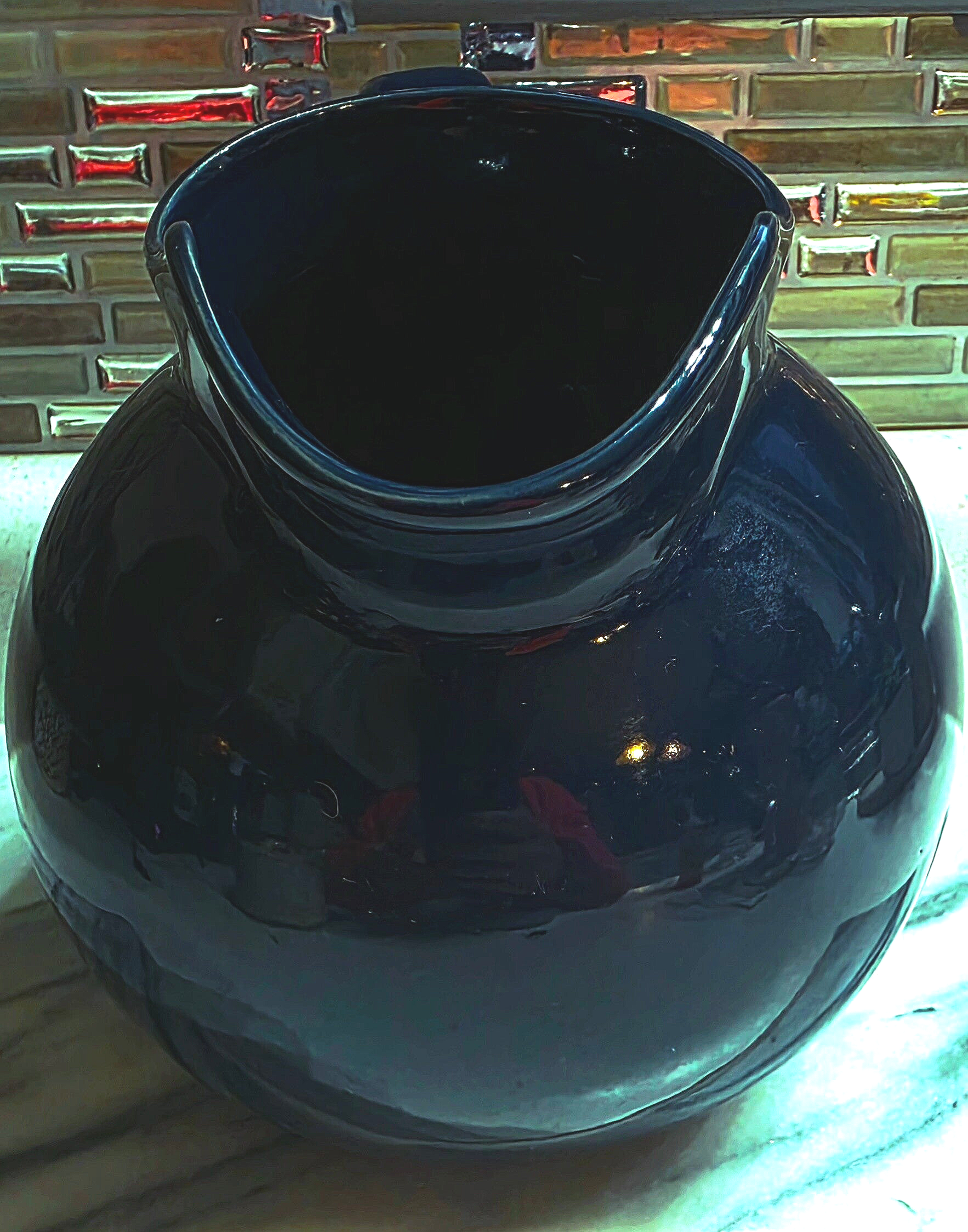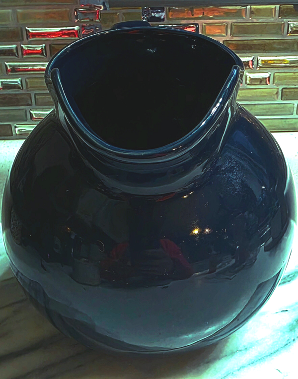 The home Dark Blue Tilted Ice Lip Ball Pitcher is a round ceramic pitcher with a solid dark blue color and glossy finish. It is microwave and dishwasher safe, making it convenient for everyday use. The pitcher features handles for easy lifting and has a printed backstamp. Perfect for serving drinks or as decorative cookware, this pitcher is a stylish addition to any kitchen or dining room. This piece looks identical to the Hall Pottery pitcher in this color! Great condition with no chips or cracks. Measures approximately 7.5" tall.