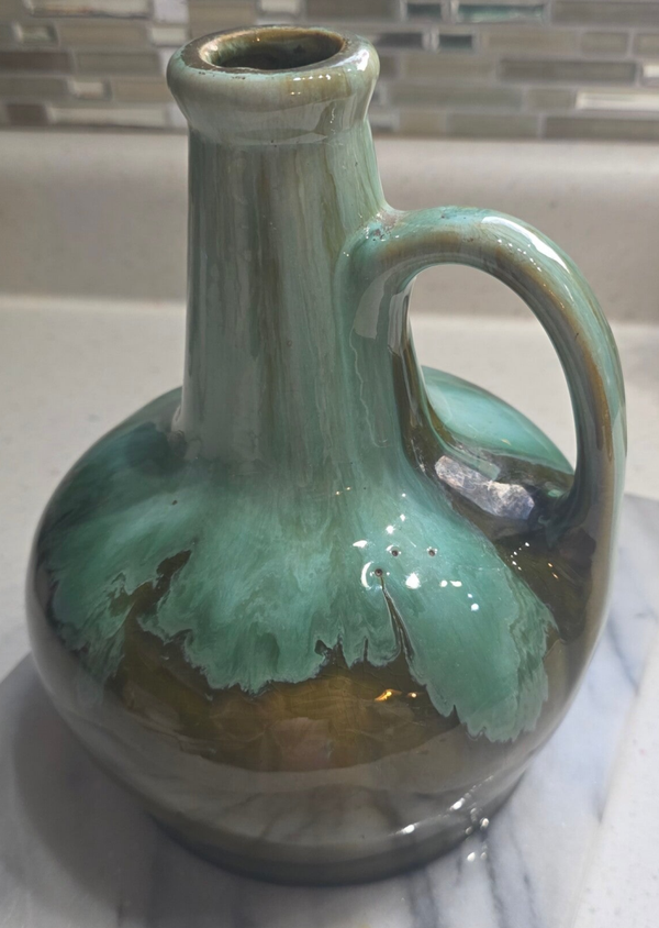 Musical decanters, like this one, were a popular novelty item during the mid-20th century. These ceramic vessels often featured a musical mechanism that would play a tune when the decanter was tilted or opened. The "Green Onyx" glaze refers to a specific type of mottled green finish that McCoy used, giving the pottery a unique, stone-like appearance. These pieces are collected for their decorative charm and the nostalgic appeal of their musical function.