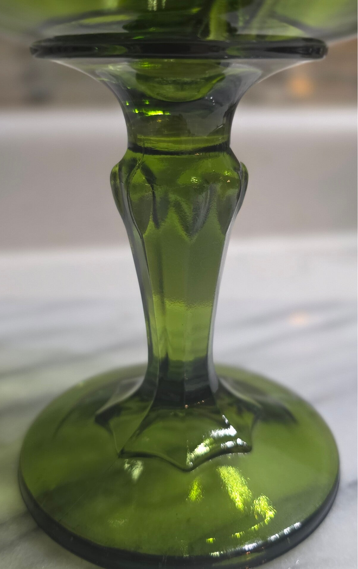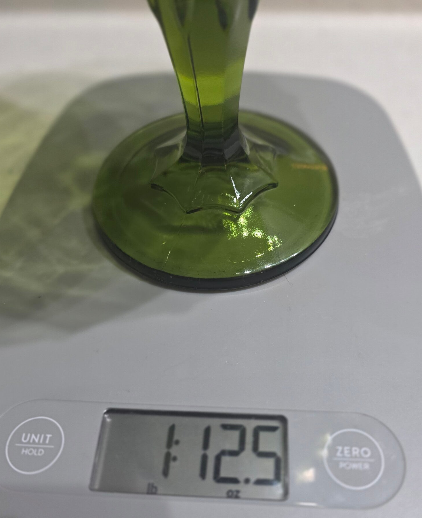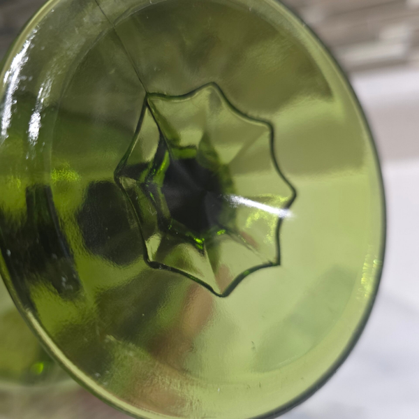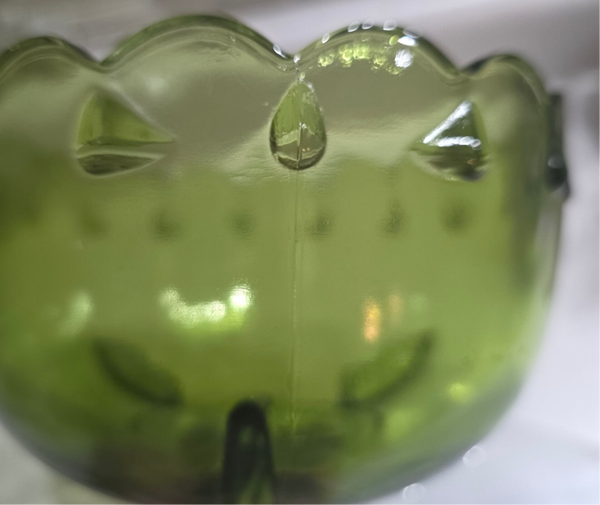 The Indiana Glass Green Compote Dish is a one-piece, round bowl made of pressed glass with a teardrop pattern and scalloped edge. It is a decorative and glossy finish bowl, perfect for all occasions. The item weighs 1 lb 12.5 oz and has no visible signs of regular use. Measures 7.5" tall and 5.5" wide at largest area. No chips or cracks.