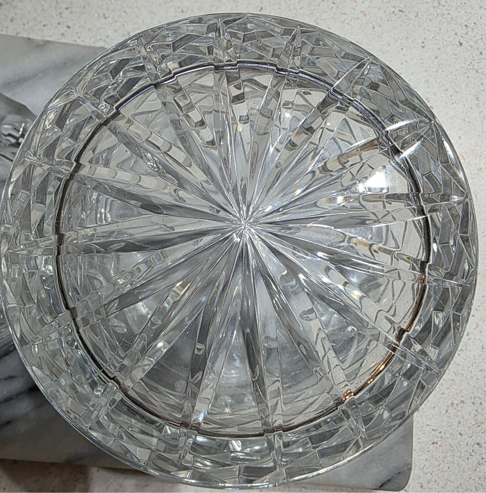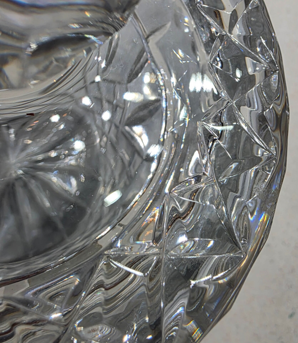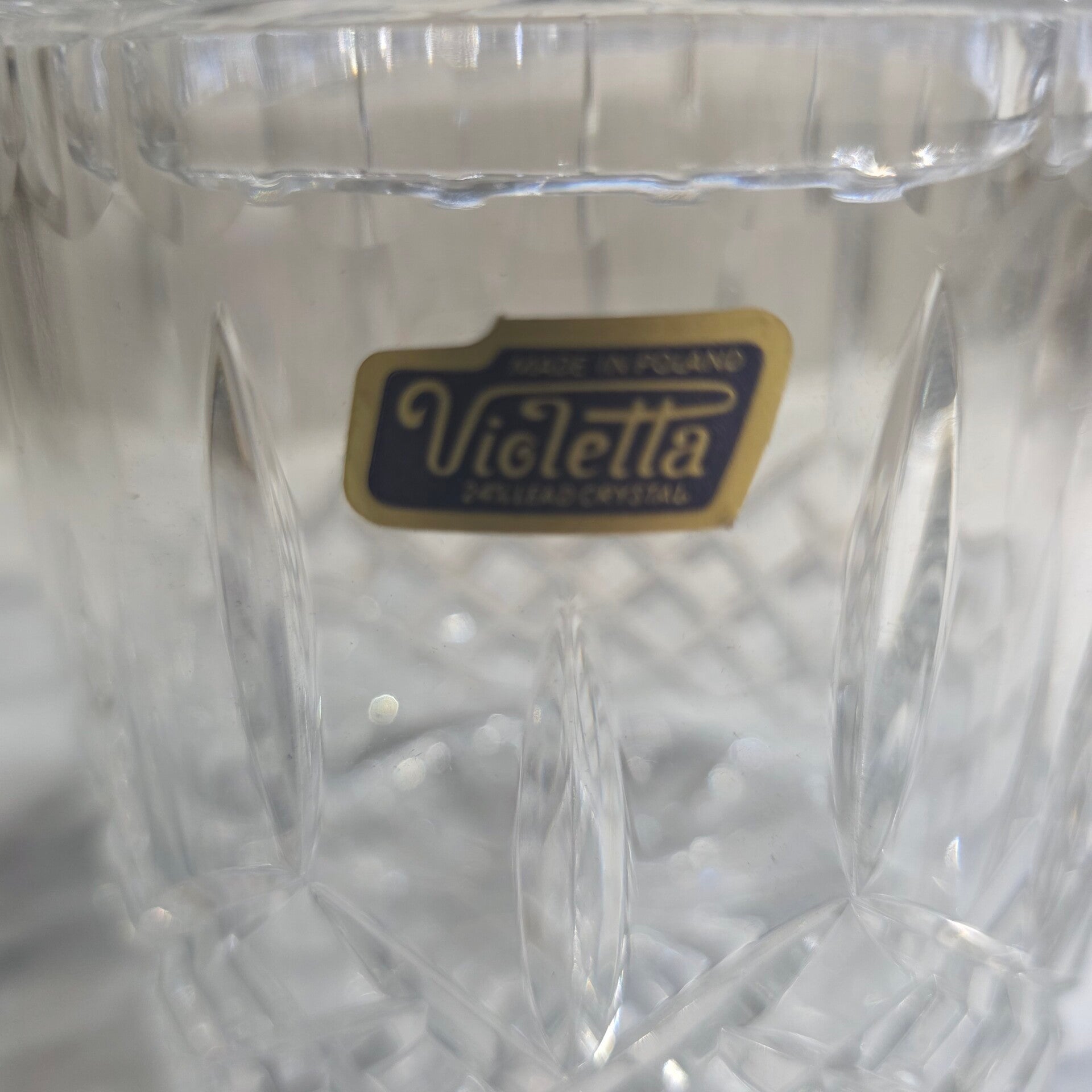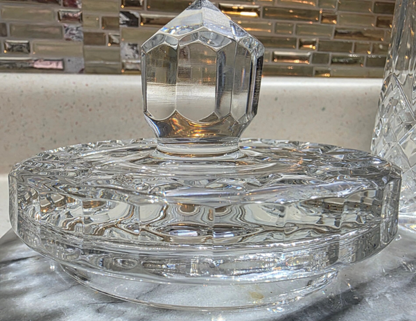 The Violetta 24% Lead Crystal Hand-Cut Glass Jar with Lid is a beautifully crafted piece made in Poland. Featuring a geometric pattern, this medium-sized round jar is clear in color and made of crystal. This elegant piece is perfect for decorative purposes and adds a touch of sophistication to any space with its intricate design and high-quality craftsmanship. This piece weighs in at a whopping 3lbs 14.7oz.!! No visible signs of wear and no chips or cracks. This piece also gorgeously reflects light for added brilliance.