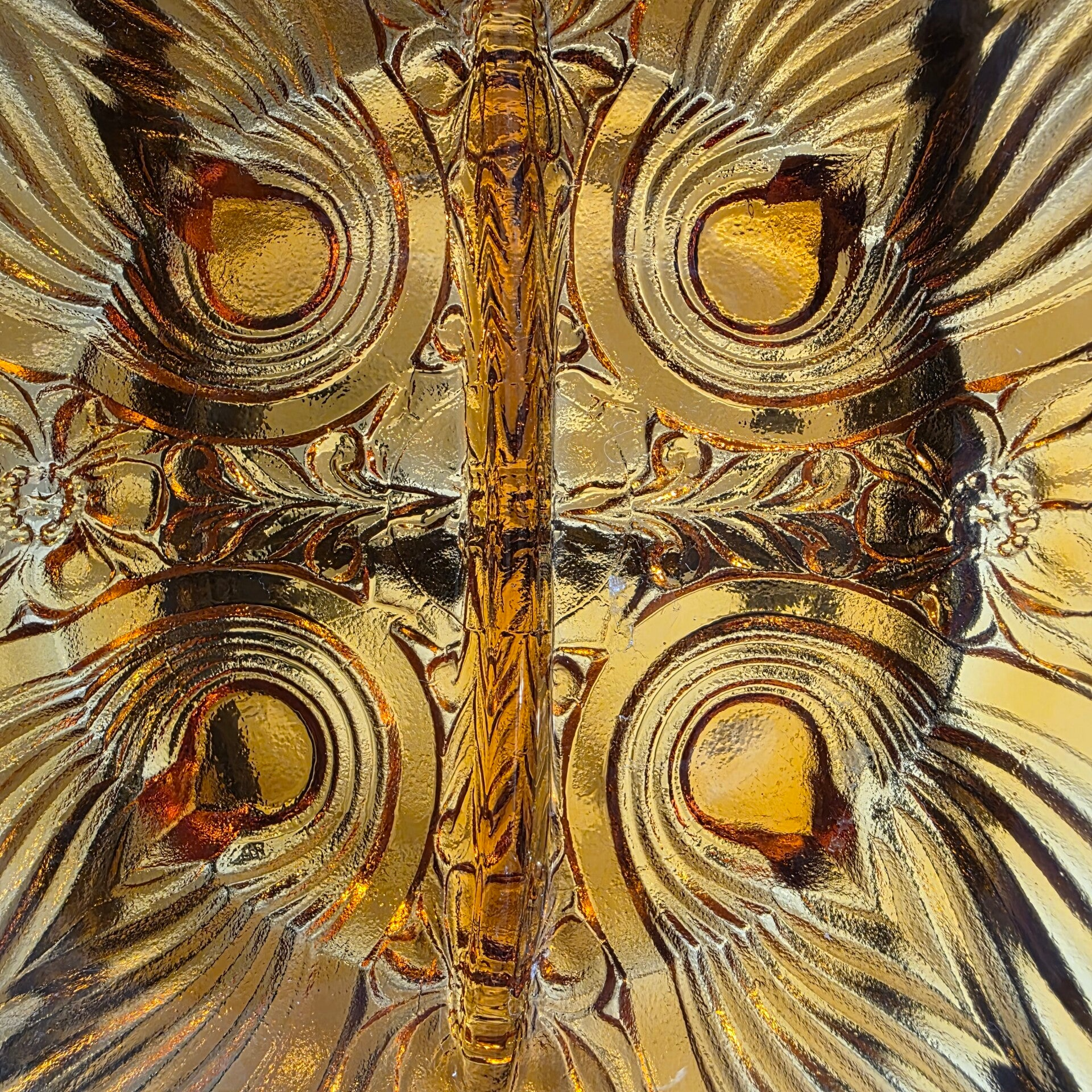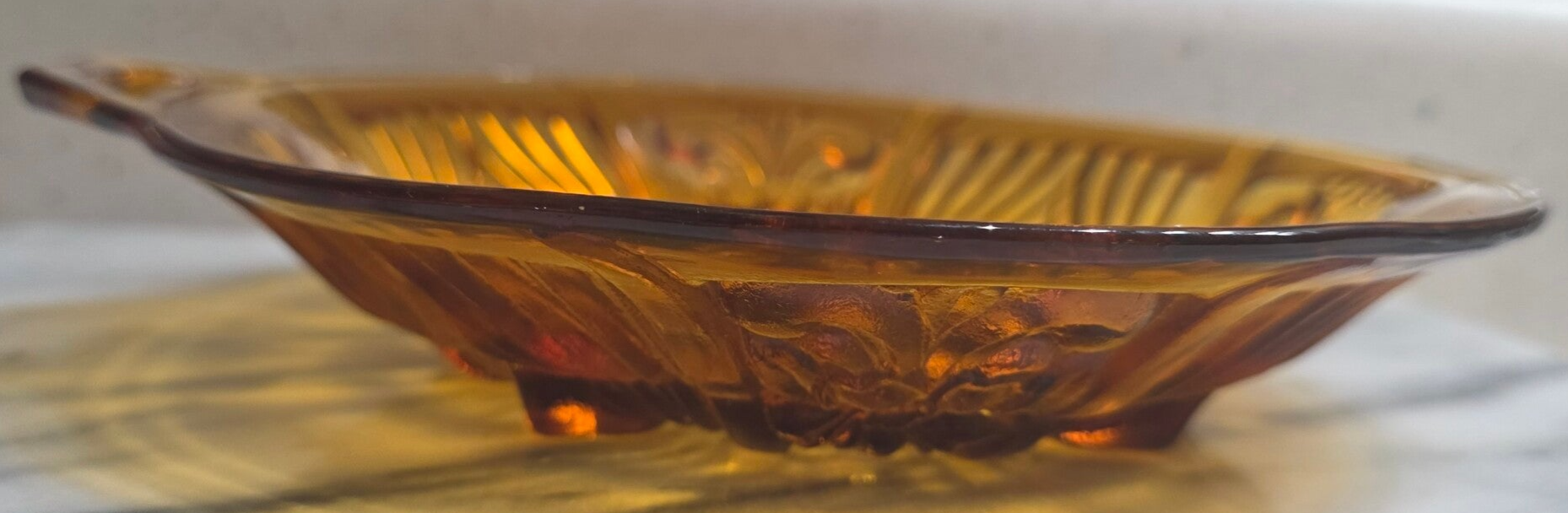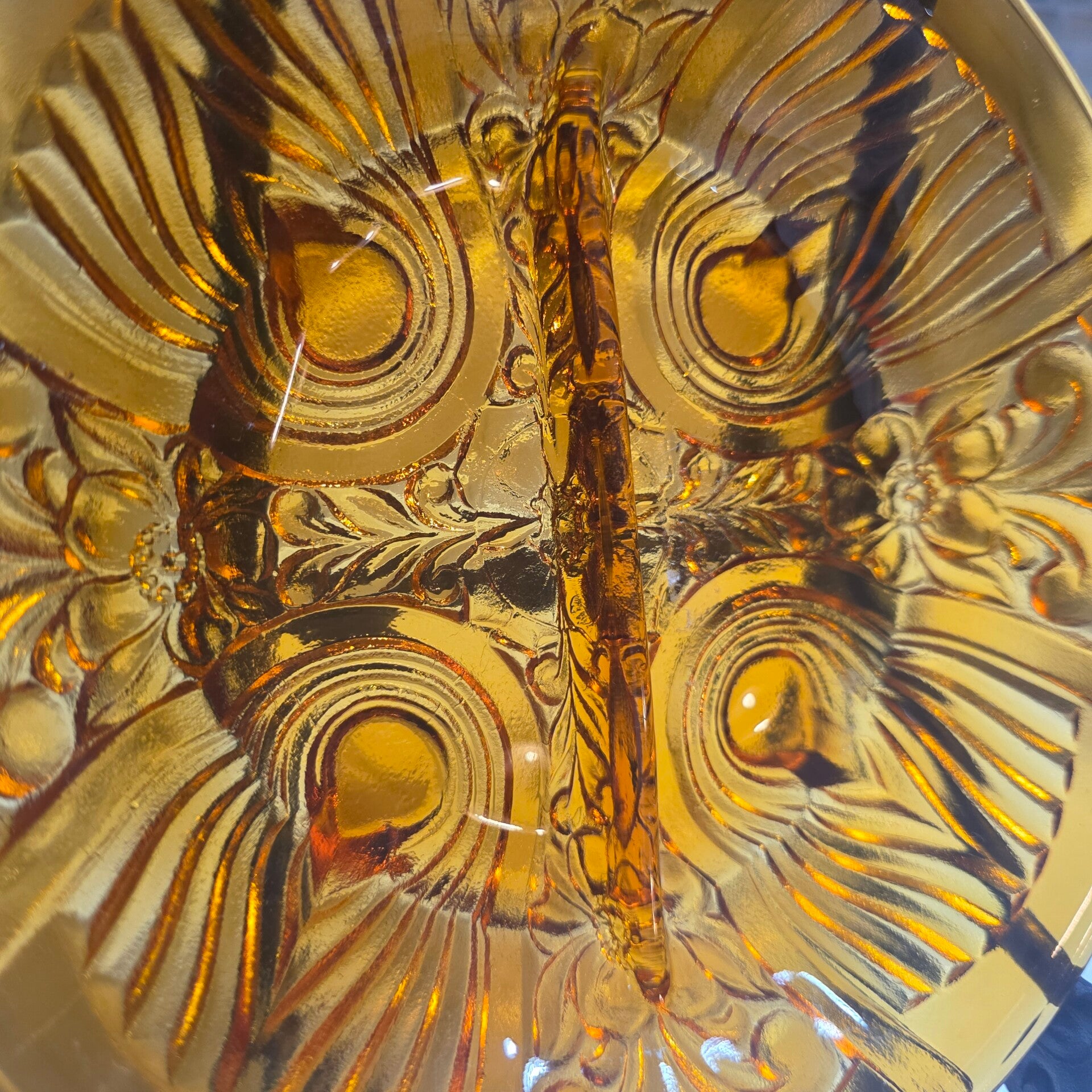 Vintage amber carnival glass divided serving dish with Killarney Pattern