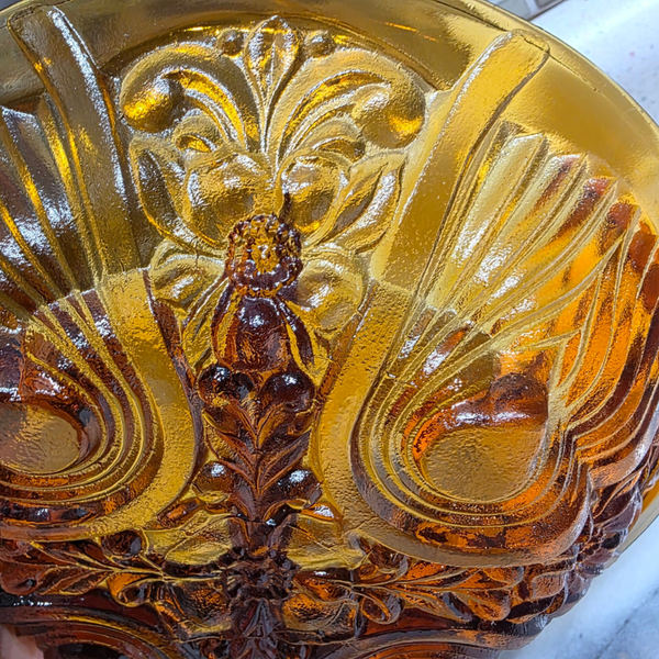 Carnival glass, also known as "footsie" or "taffeta" glass, is a type of iridescent pressed glass that was produced from the early 20th century until the 1930s. The distinctive shimmering, rainbow-like surface is achieved by applying metallic salts to the glass while it is still hot, which then creates a unique iridescent effect when fired in a kiln.