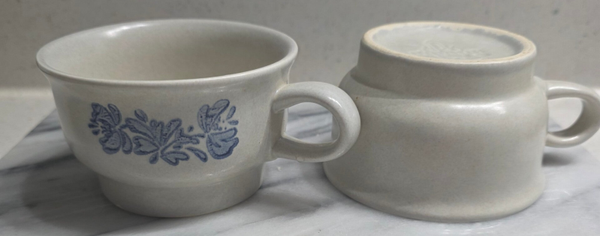 The Pfaltzgraff Yorktowne Blue Tea Cups set of 2 is a beautifully crafted ceramic bowl with a floral pattern in white and blue colors. Made in the USA, this round bowl showcases the brand's signature impression backstamp and a glossy finish. This two-piece set is perfect for serving tea or coffee in style, adding a touch of floral theme to your table setting. The art pottery production style and technique make this bowl a charming and unique piece for any adult's department in need of decorative cookware or serveware.