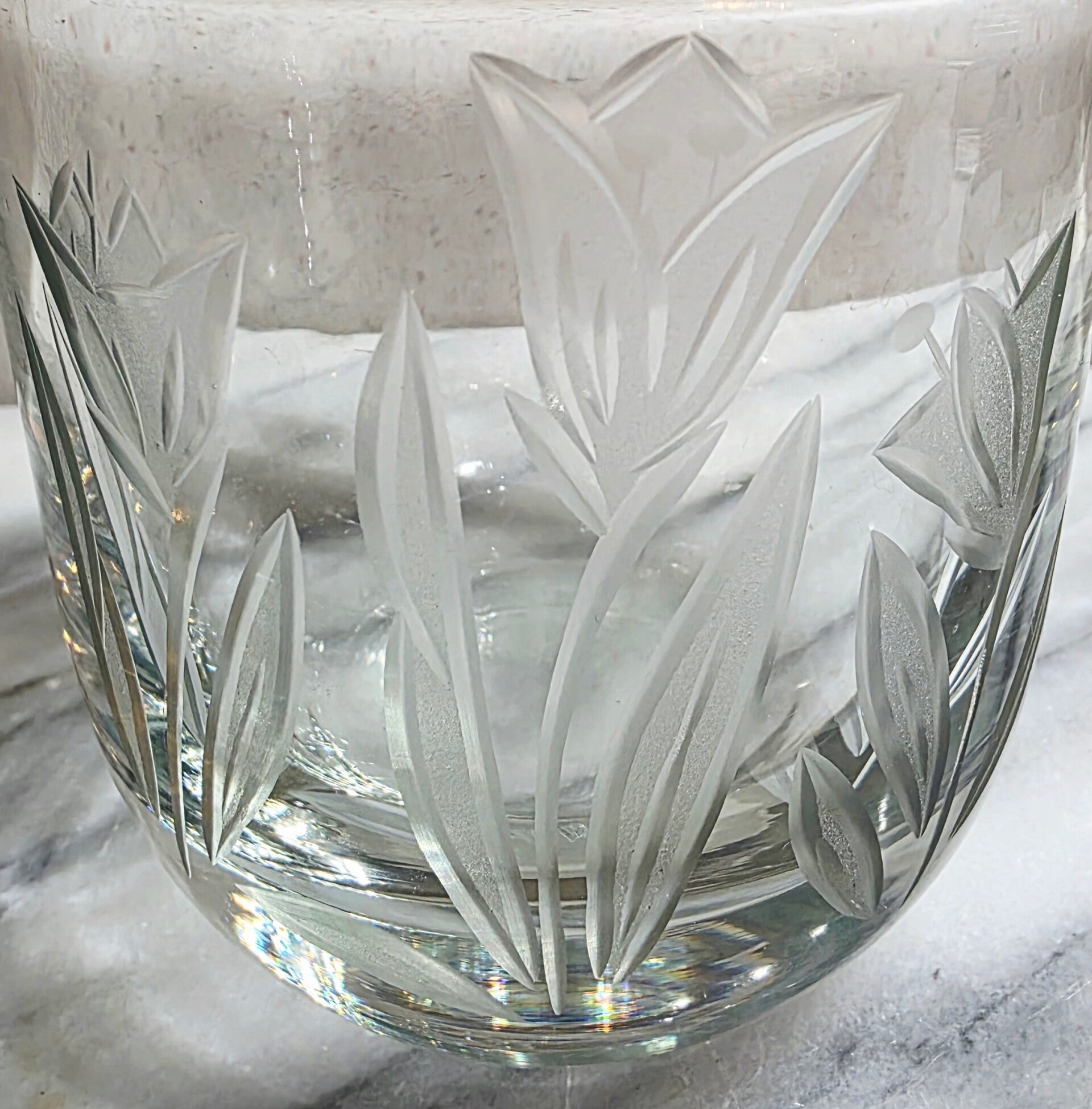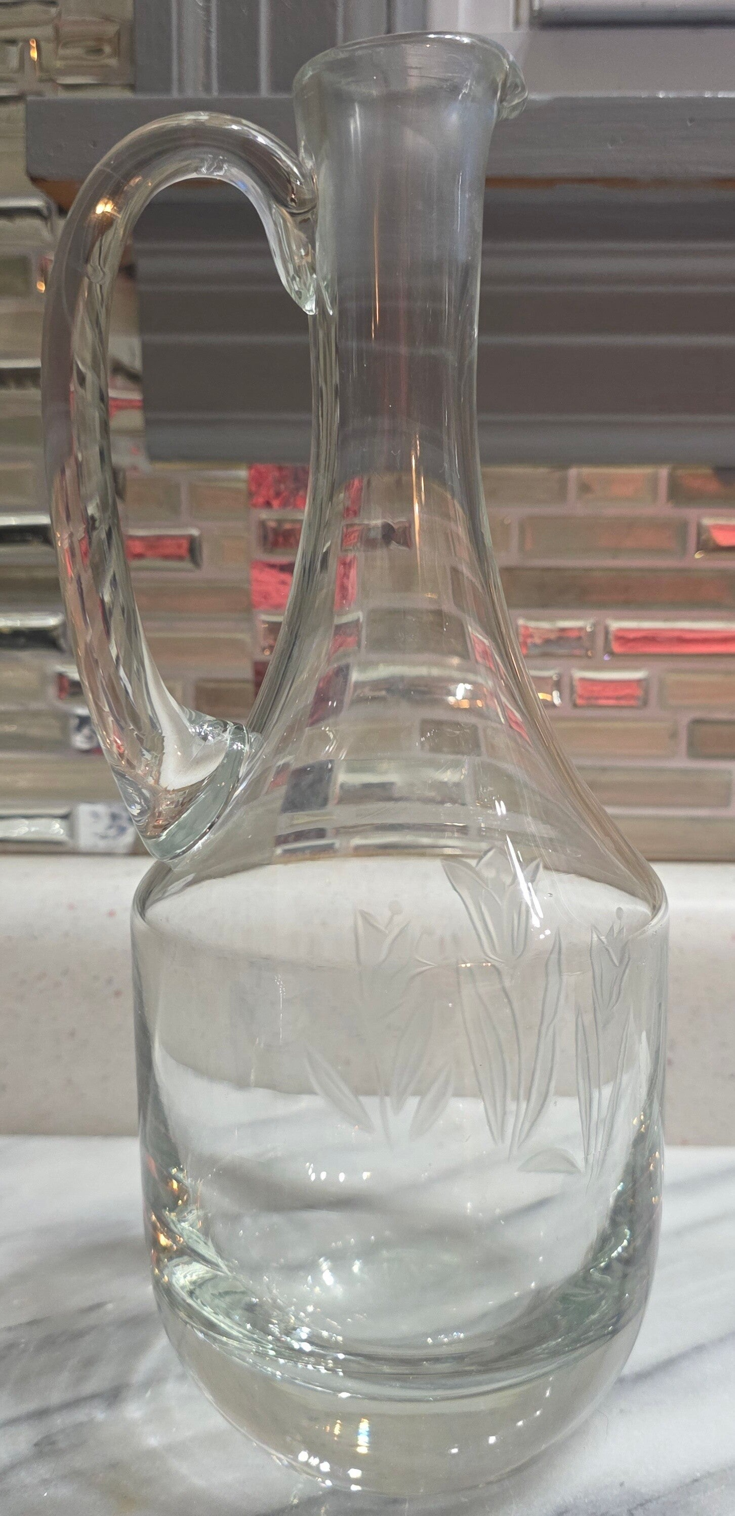 This hand-blown cut glass pitcher with a floral etched design and handle is a unique and elegant piece. The clear glass with a glossy finish gives it a sophisticated look, perfect for serving beverages or as a stylish centerpiece on a dining table. This pitcher is a beautiful addition to any collection or for everyday use.