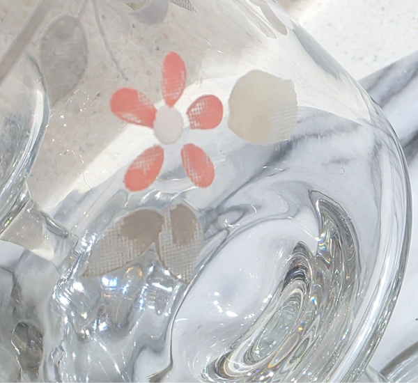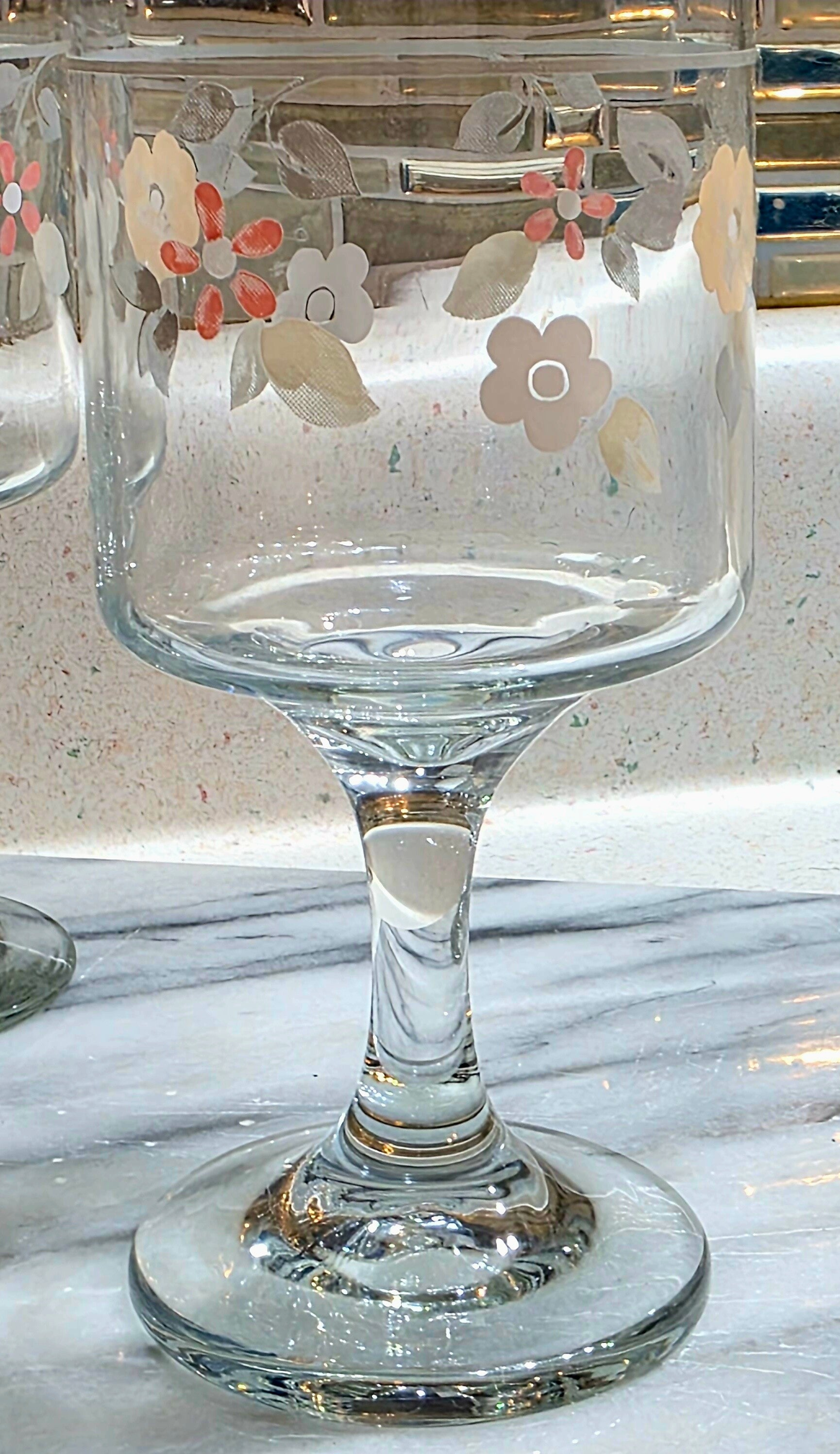 This Pfaltzgraff Wyndham Wine Goblet set of 4 features a floral pattern in a clear, yellow, peach, and beige color scheme. These 8oz wine glasses are round in shape, decorated with a glossy finish, and suitable for all occasions. The set is perfect for those who appreciate elegant and stylish drinkware for their gatherings or everyday use. Made of glass, these unmarked goblets bring a touch of sophistication to any table setting.