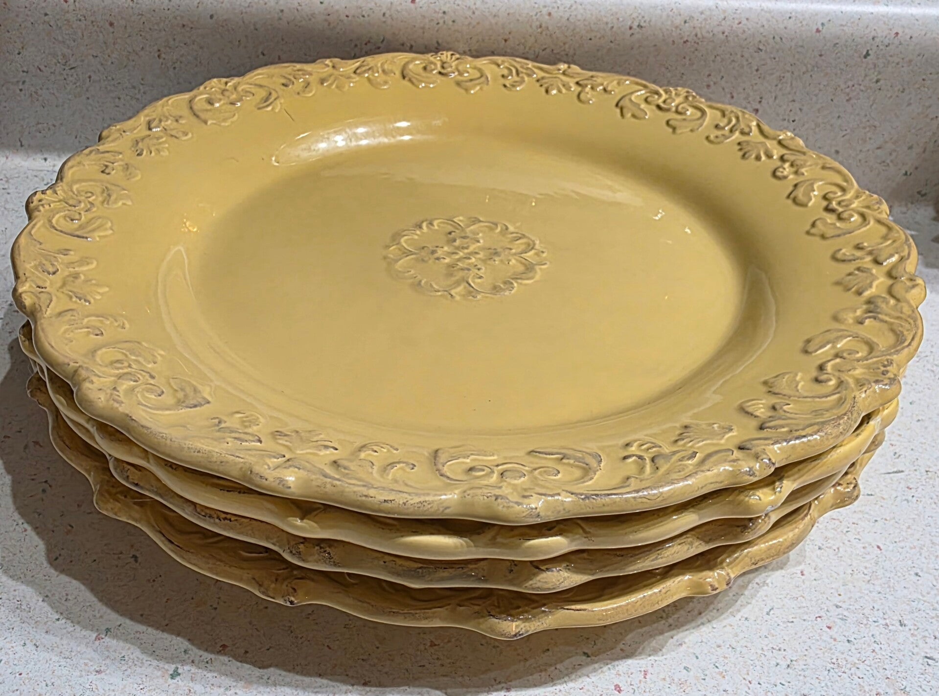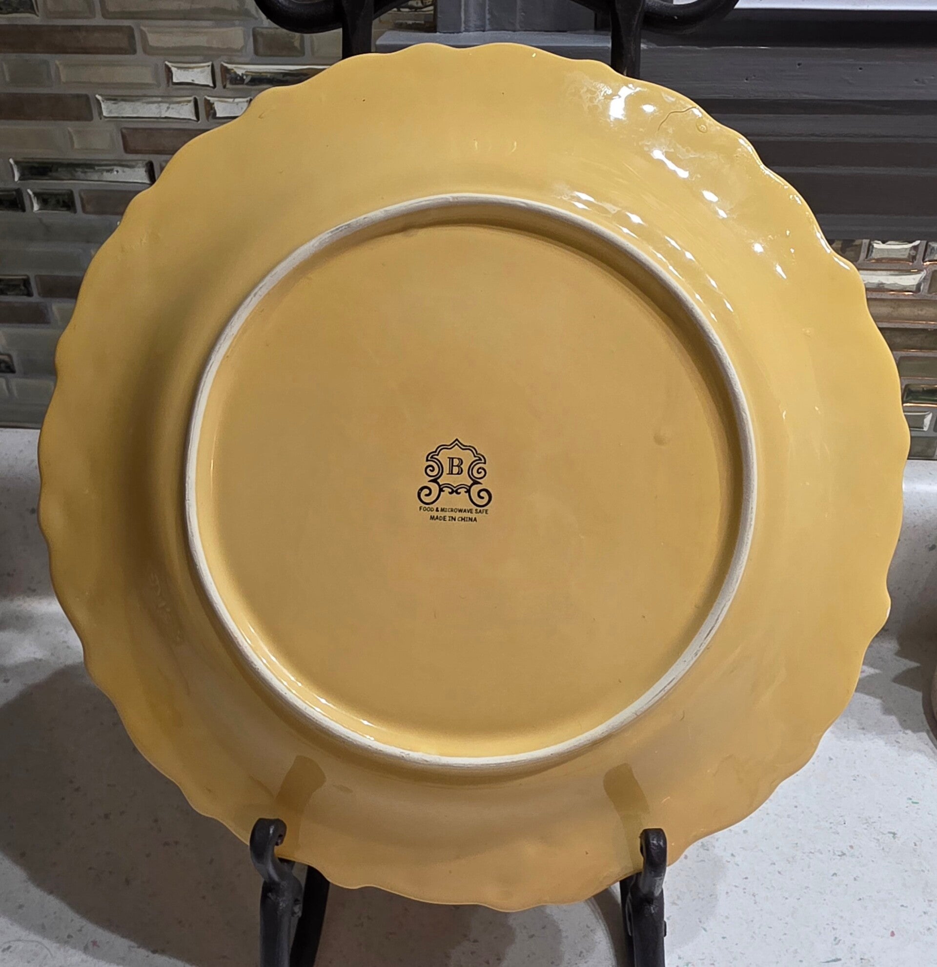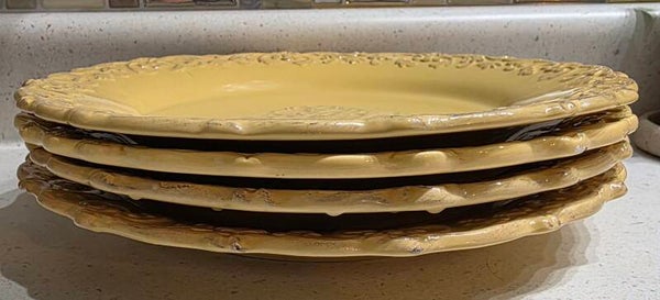 The Barreveld French Country Provincial Mustard Yellow Plate is a vibrant and stylish addition to any kitchen or dining table. The yellow color adds a pop of brightness, while the French Country style gives it a rustic and charming look. Perfect for serving meals in style and adding a touch of elegance to your dining experience. Show signs of regular use with one small chip underneath one plate.