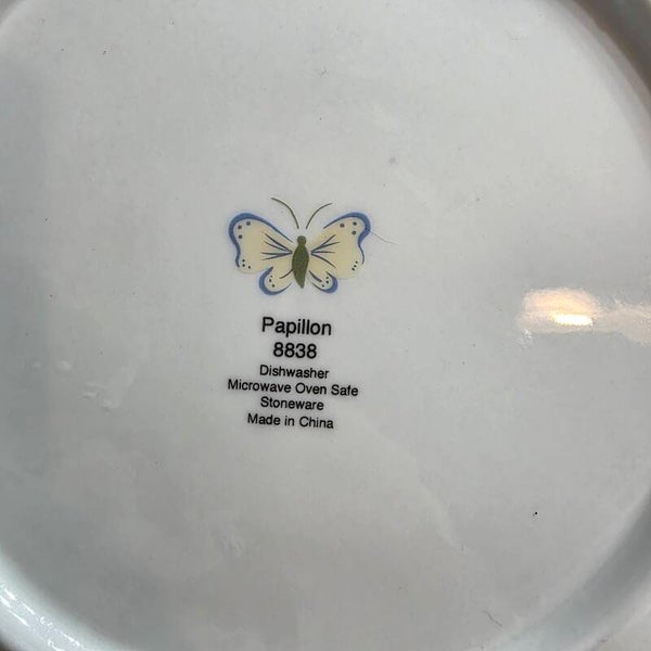 The Vintage SANGO Papillon 8838 Stoneware Salad Plate Set of 4 features a beautiful Papillon pattern in a multicolor design on stoneware plates. This set includes four salad plates, perfect for serving salads or desserts in a stylish and unique way. Made by the brand Sango, these plates are durable and have a decorative design that adds a touch of charm to any dining table. Like new with no chips or cracks.