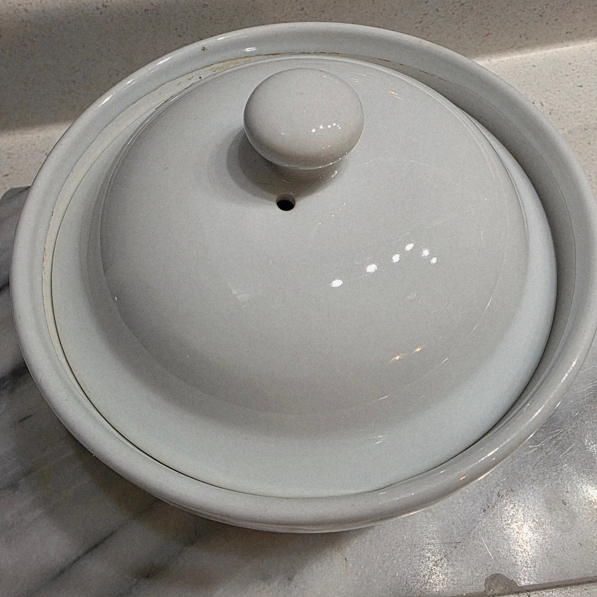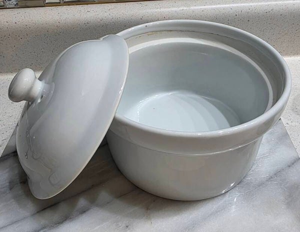 The VTG BIA Cordon Bleu 2qt Casserole Dish with Vented Lid is a vintage piece of decorative cookware perfect for serving meals in style. Made of porcelain with a glossy white finish, this oval-shaped covered dish features a floral pattern and the original Cordon Bleu brand backstamp. With a single compartment and vented lid, this casserole dish is ideal for baking and serving a variety of dishes with a touch of vintage charm.