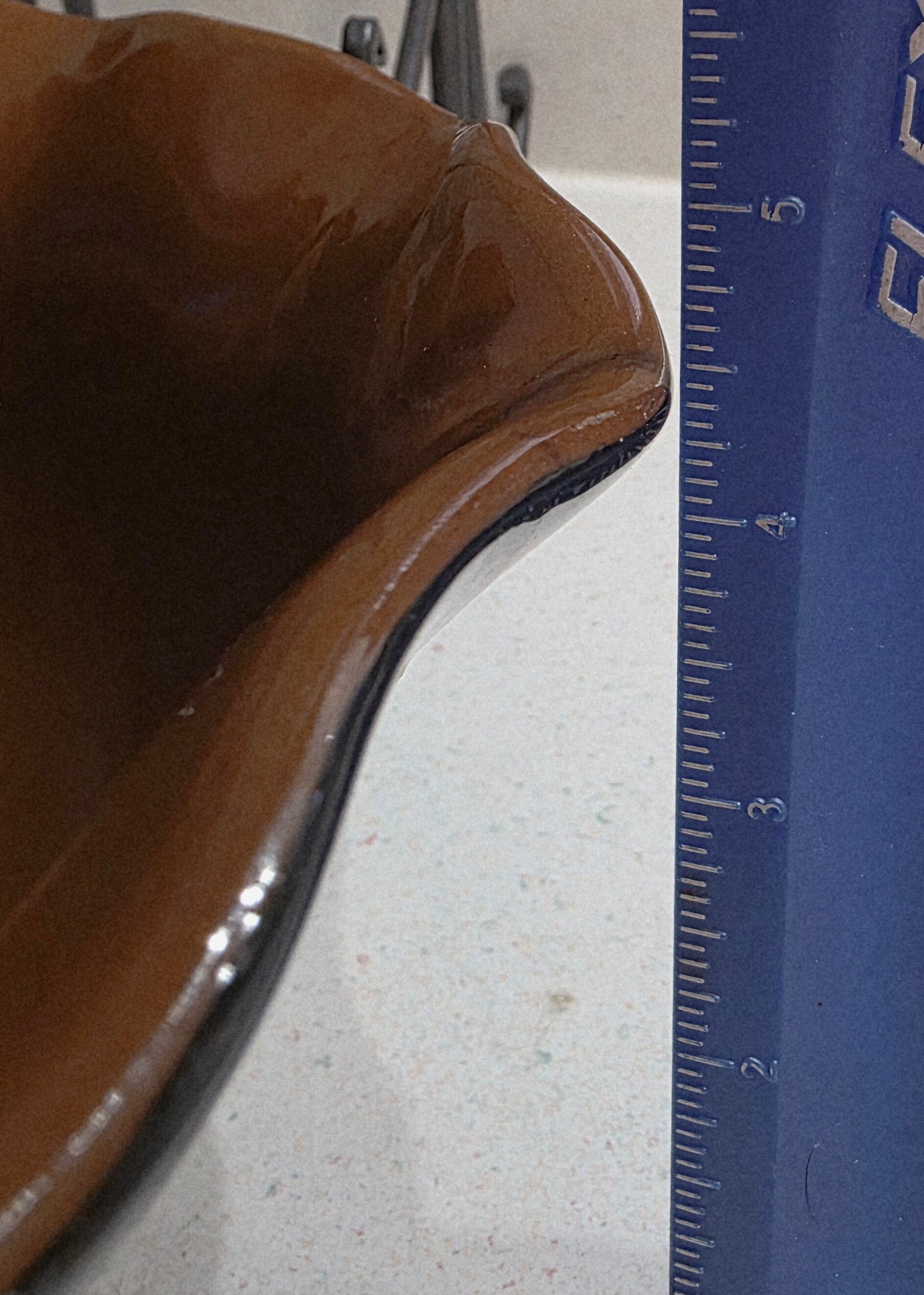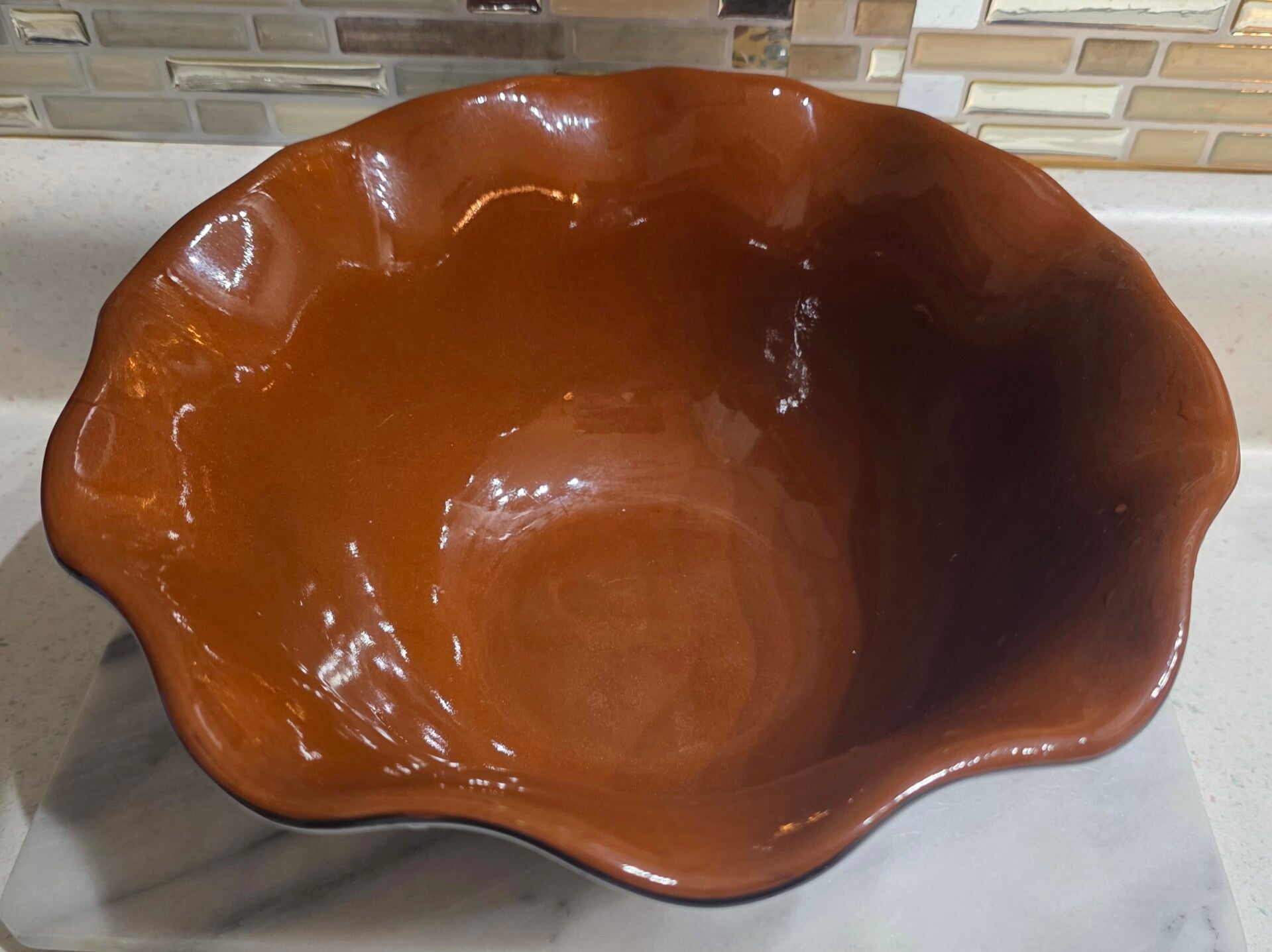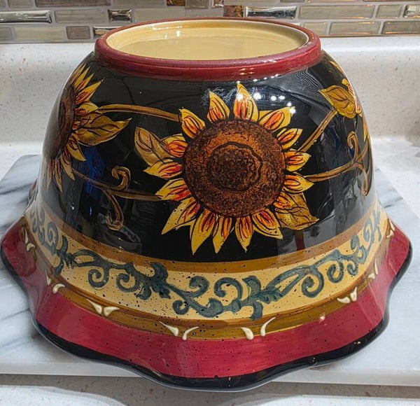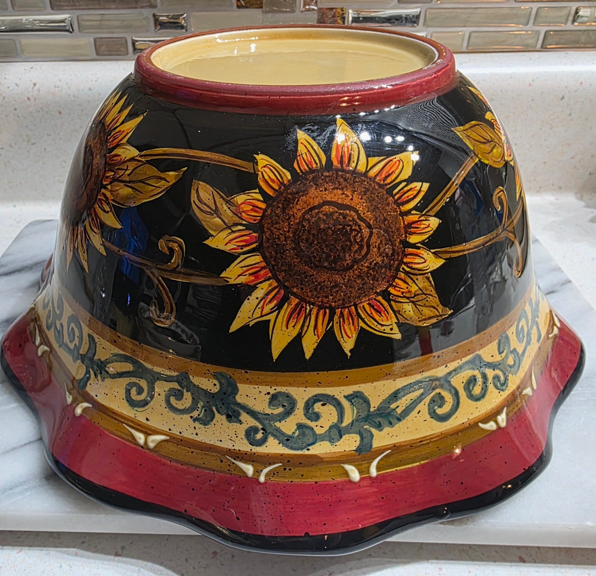 The discontinued Pier One Terra Cotta hand-painted sunflower serving dish is a charming and unique piece of decorative cookware. Made of terracotta and hand-painted with intricate sunflowers, this dish is perfect for serving salads or snacks with a touch of rustic elegance. With the brand's reputation for quality products, this discontinued item ensures a collectible and timeless addition to any home decor.