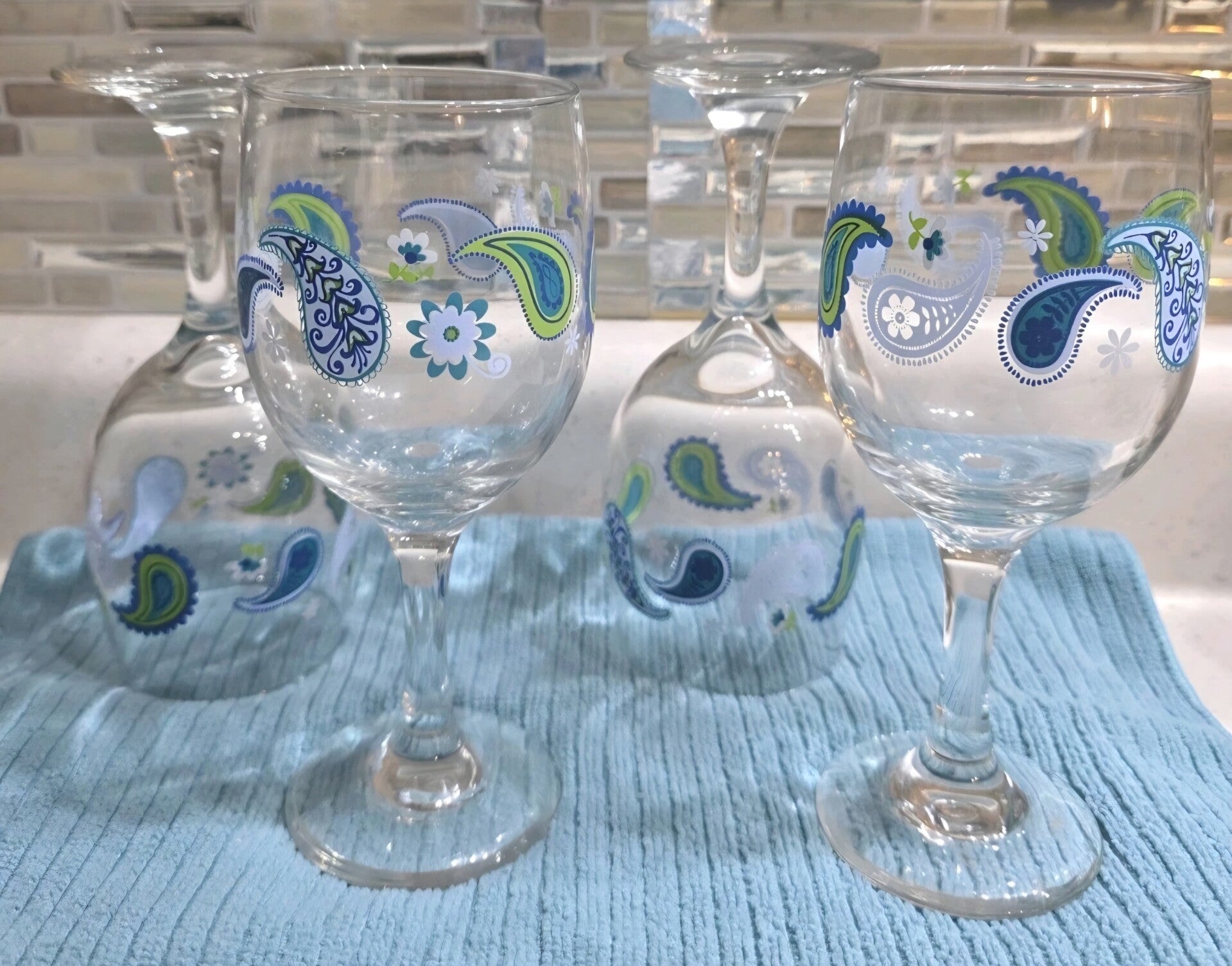 Set of 4 Decorated Wine Glasses Paisley Floral Blue Green & Whte