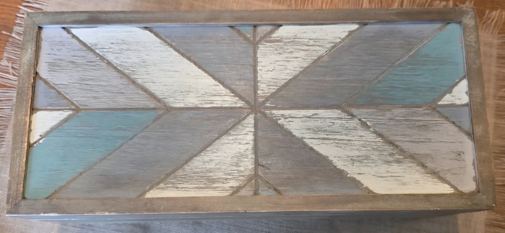 The At home Geometric Pattern Wood Storage Box is a stylish and functional addition to any home décor. This rectangular box features a unique geometric pattern in brown, blue, white, and gray colors, adding a touch of art deco style to your space. With dimensions of 12 inches in length, 10 inches in width, and 6 inches in height, this medium-sized storage box is perfect for organizing small items while also being a decorative piece. The free-standing design and lid feature make it a practical and visually appealing option for storing and displaying items in your home.