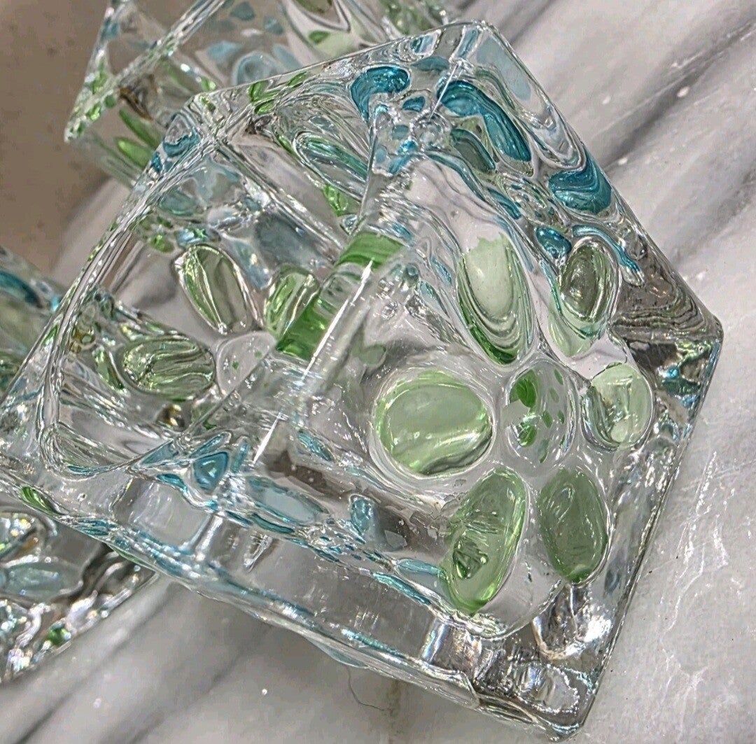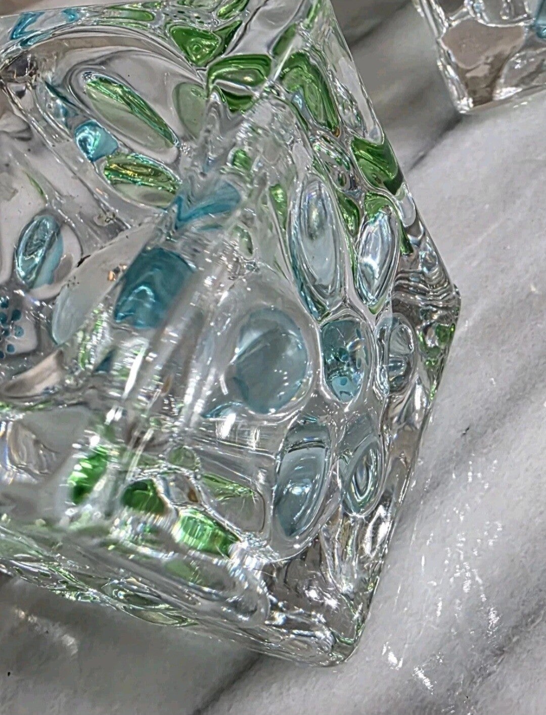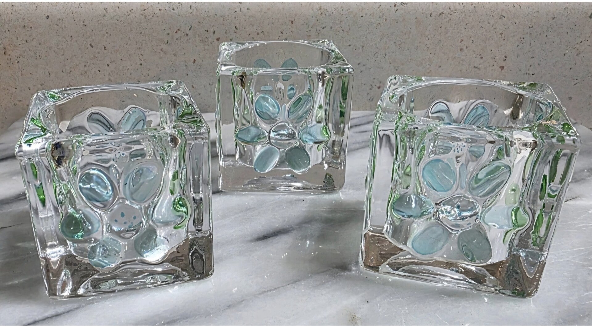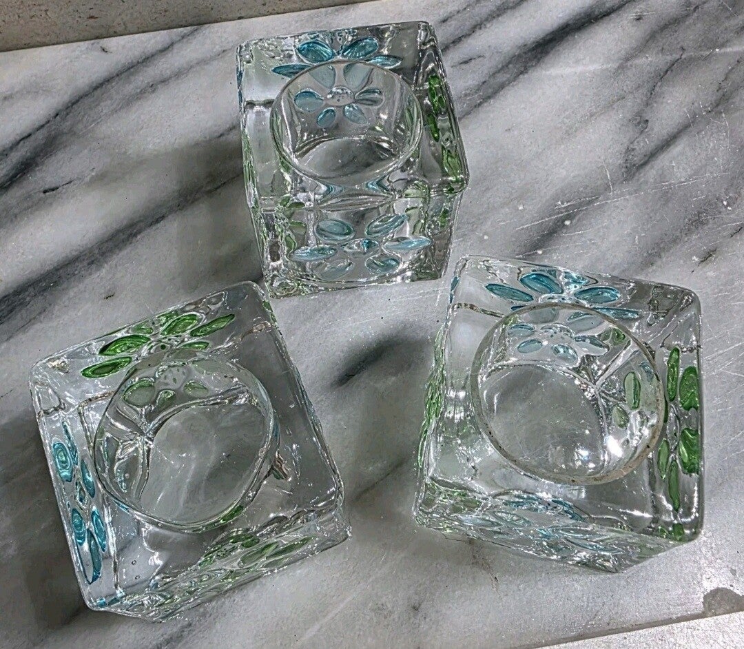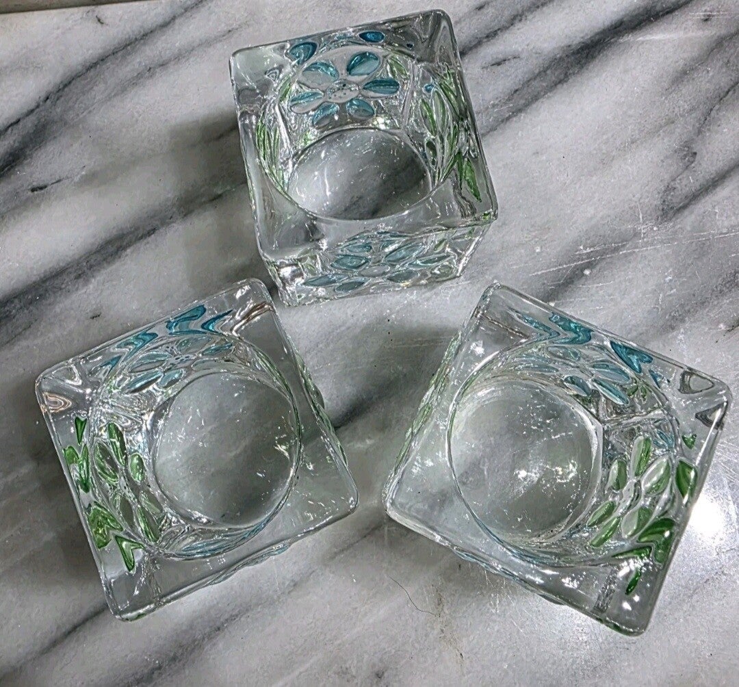 This set of 3 cube tea light candle holders is made of heavy glass with brilliant blue and green colored flowers. Suitable for tea lights or votives, these candle holders are unmarked and perfect for adding ambiance to your home decor.
