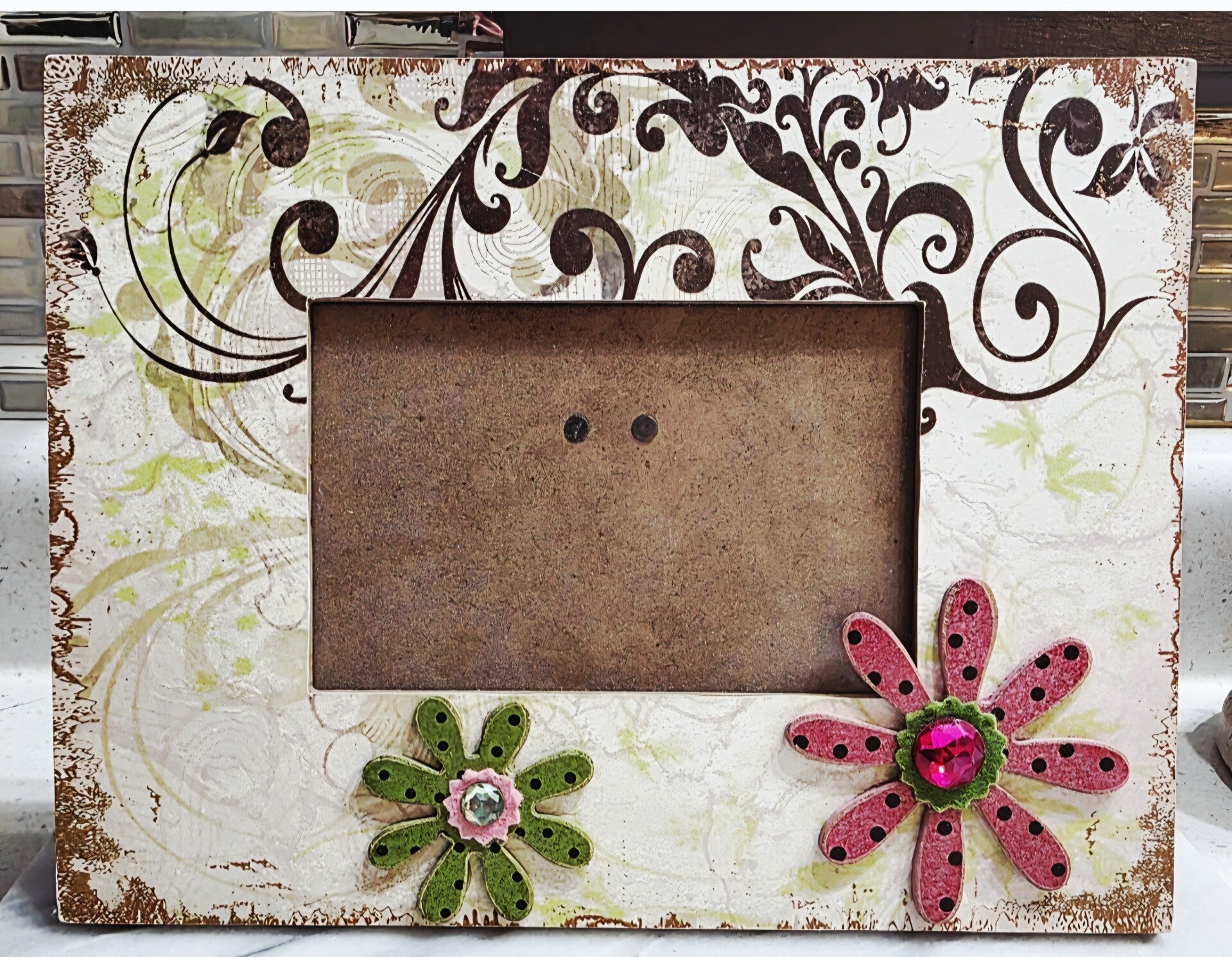 Decorative Floral White Pink Wood 4x6 Photo Frame Gem Accents