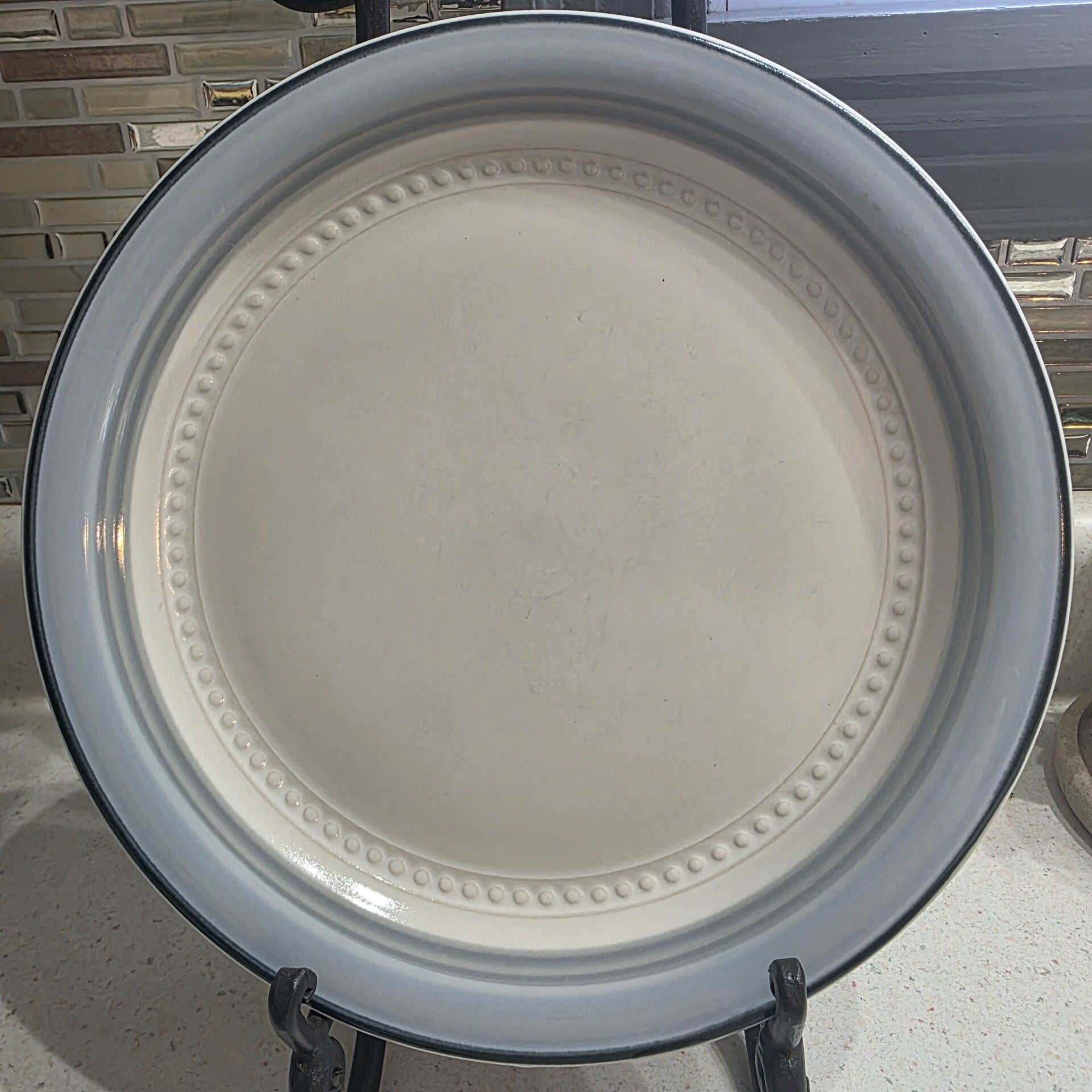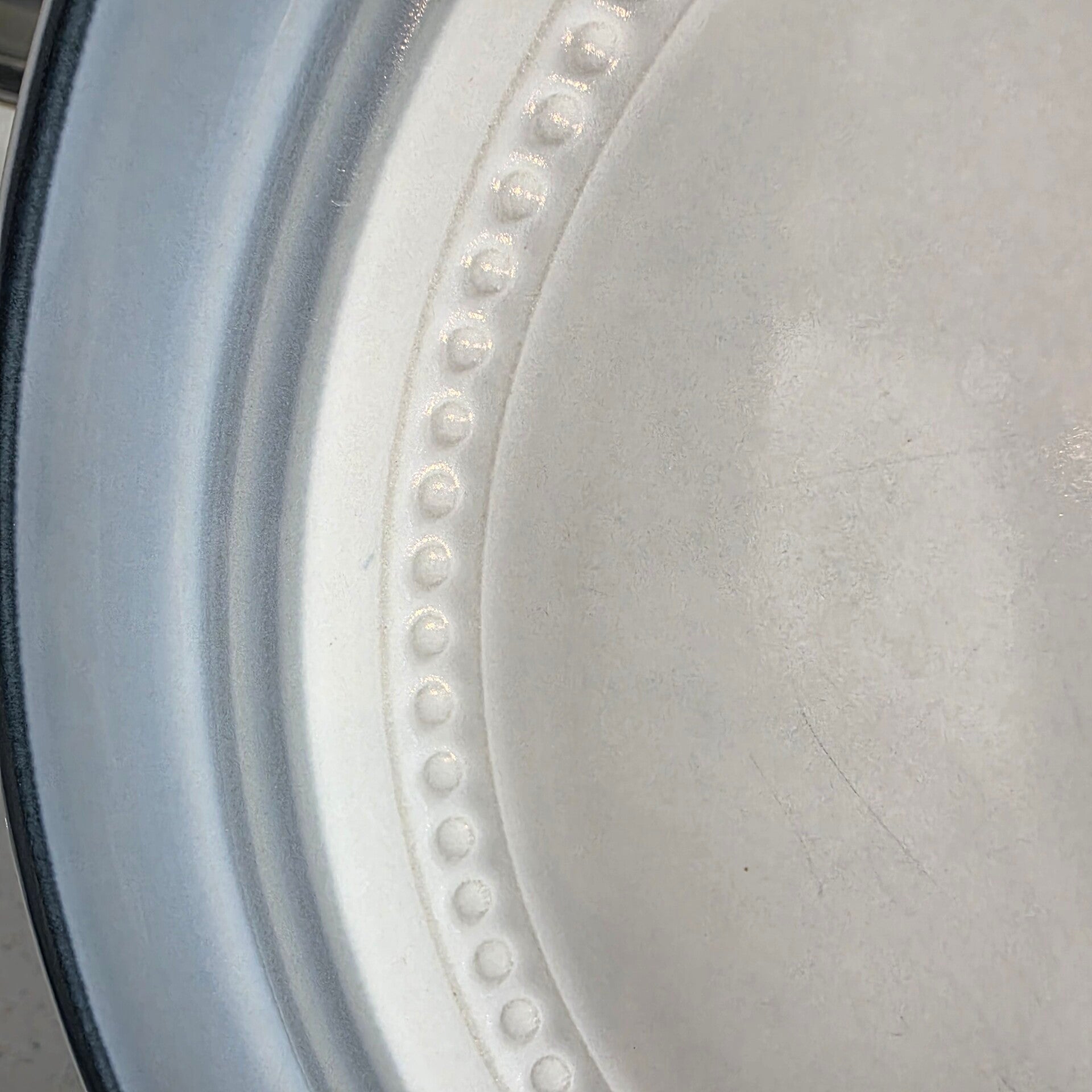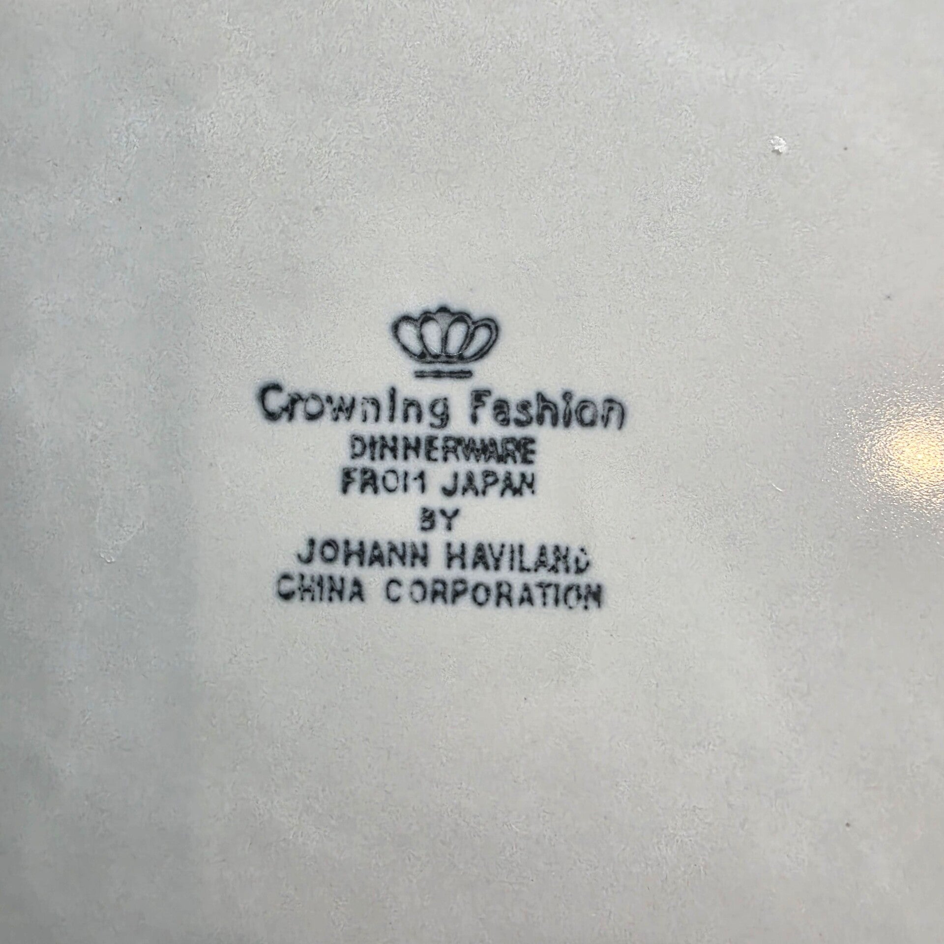 The product is a round dinner plate from Japan, featuring a beaded rim design in white and gray porcelain. It is part of the Crowning Fashion product line by Johann Haviland, known for its glossy finish and pottery production technique. Perfect condition with no chips or cracks.
