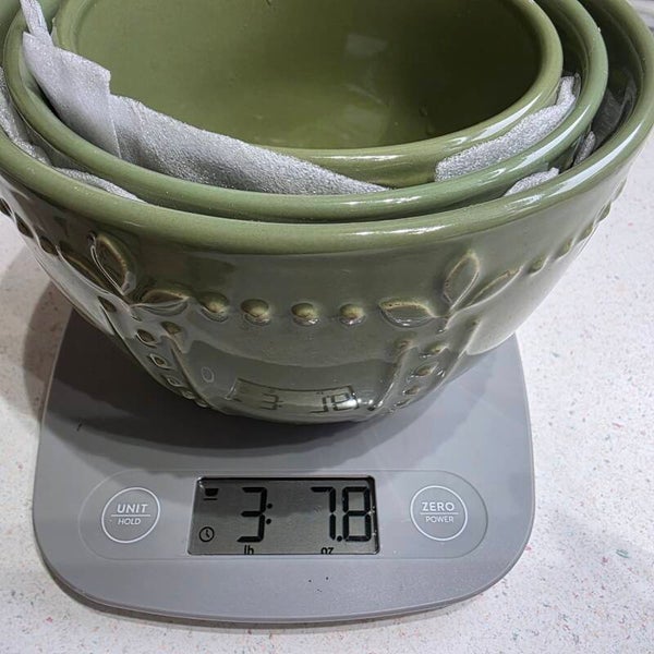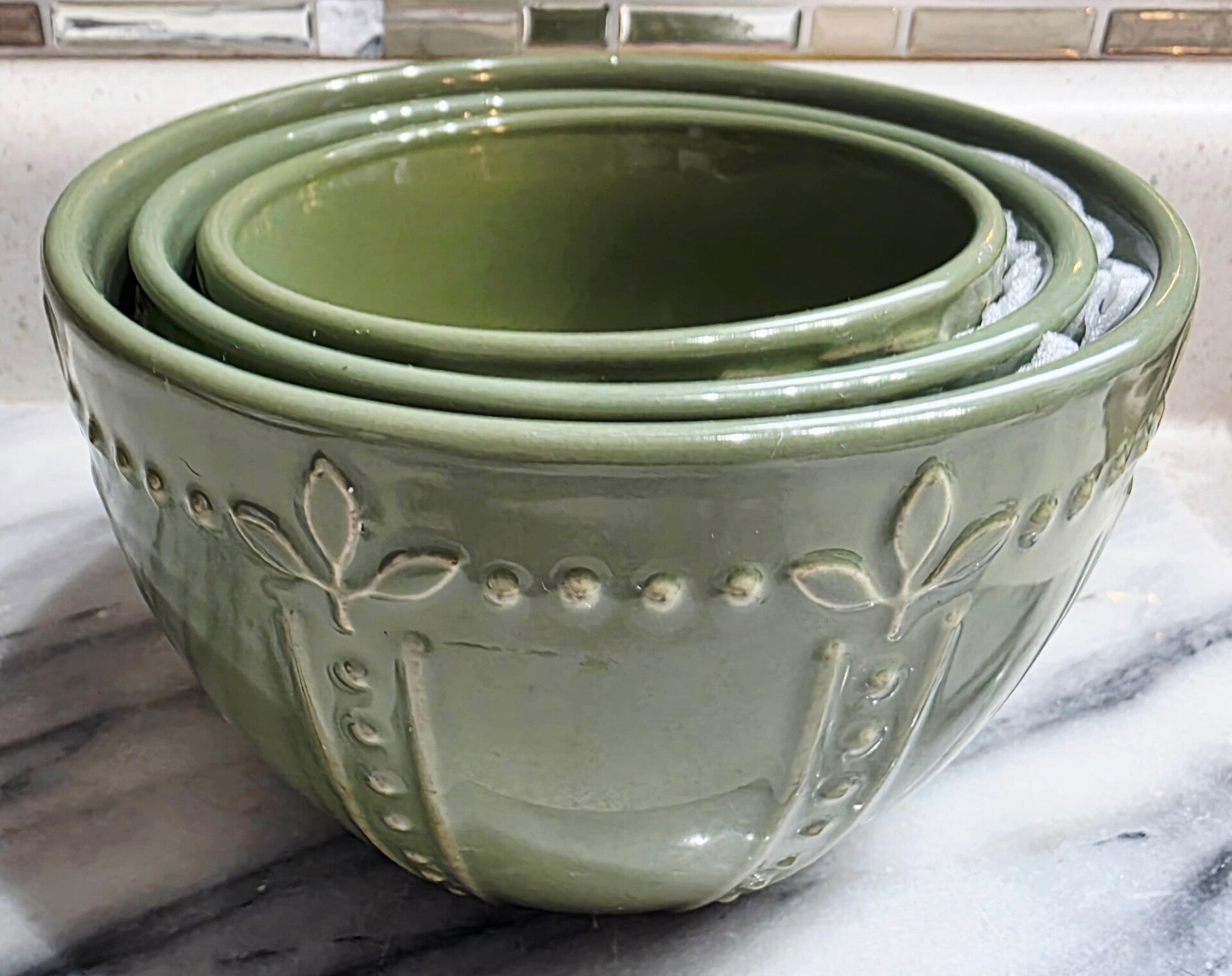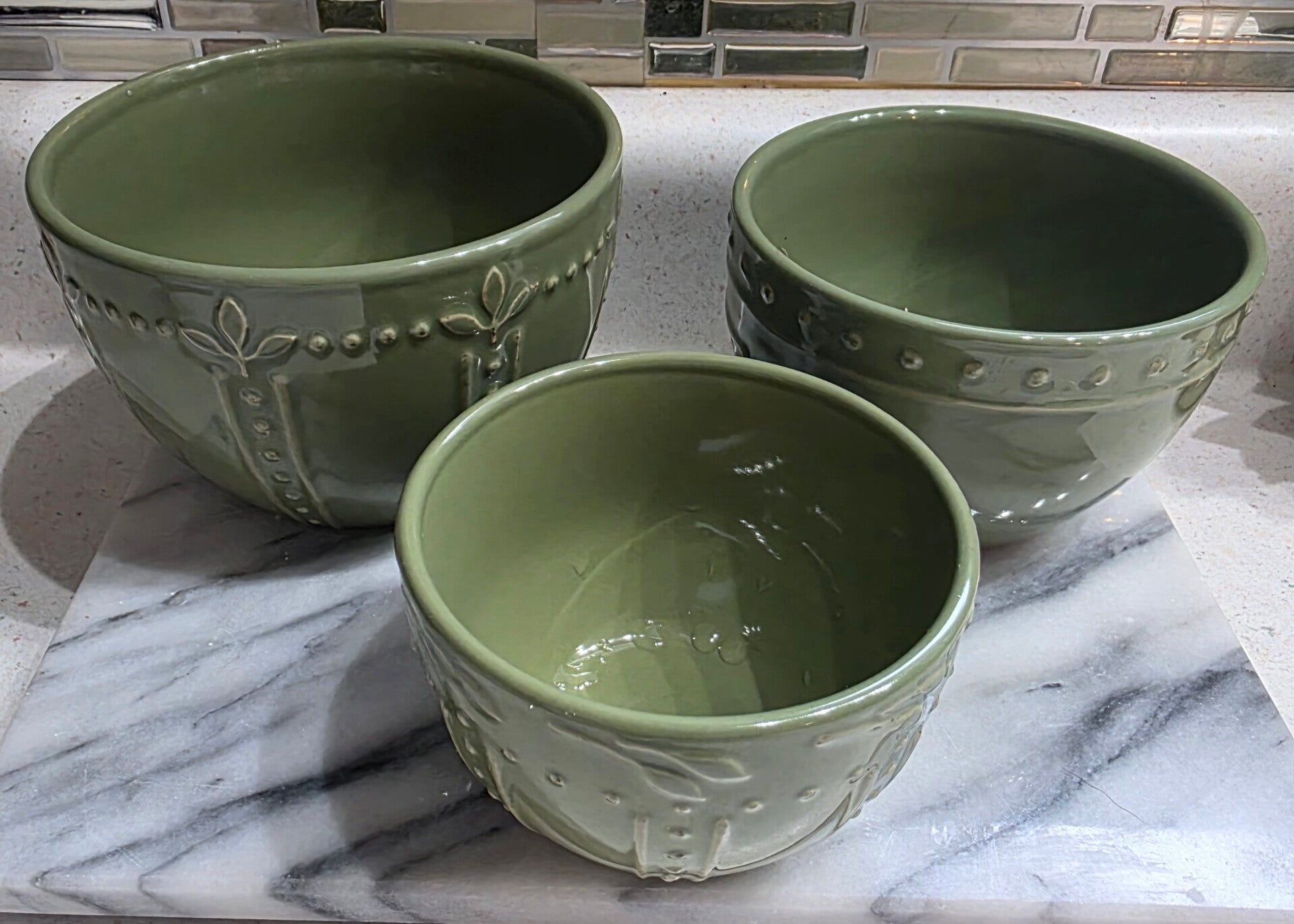 Durable stoneware with embossed leaf design. Discontinued color with stackable design. Includes 6", 7" and 10" bowls. New with no chips or cracks.