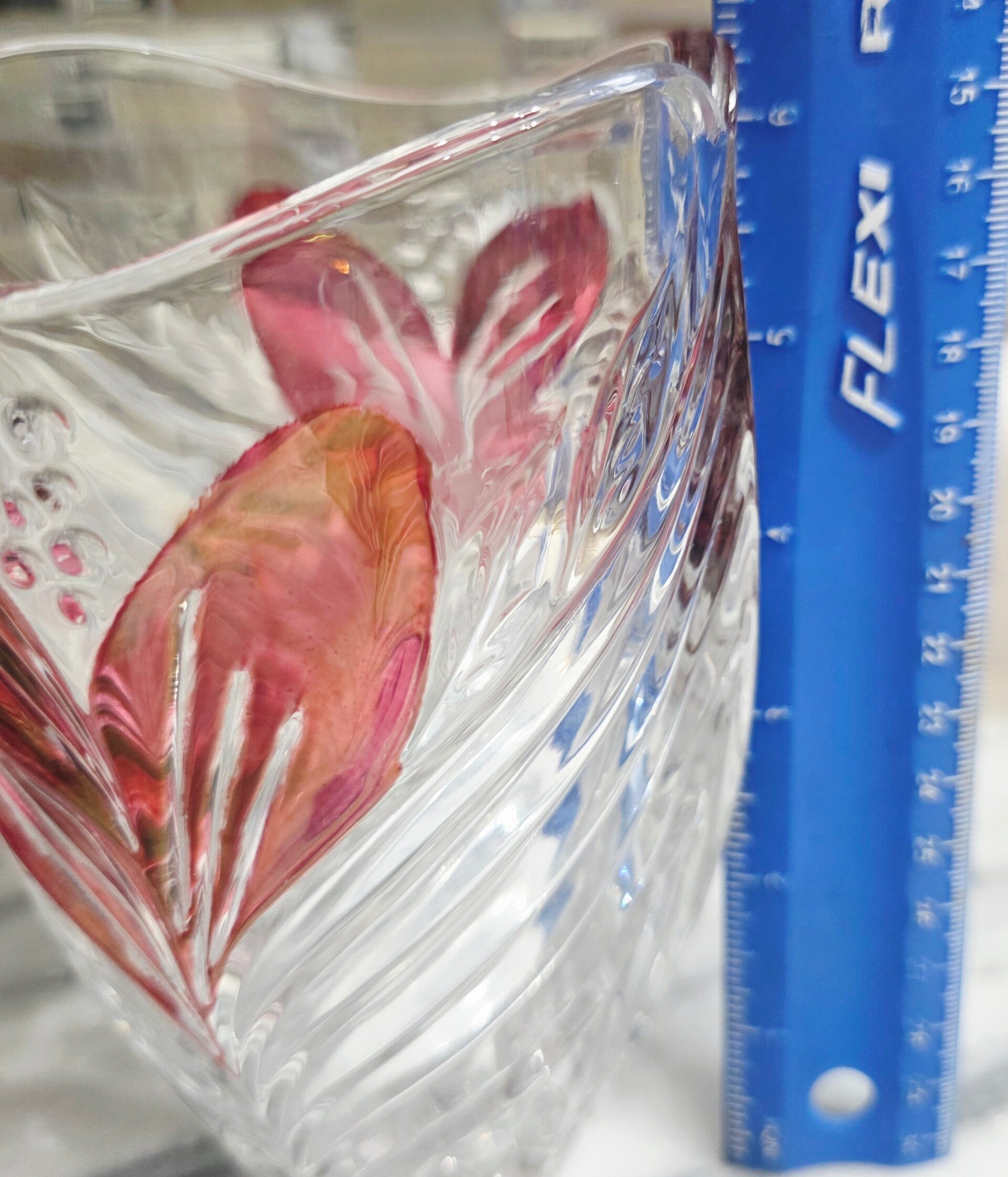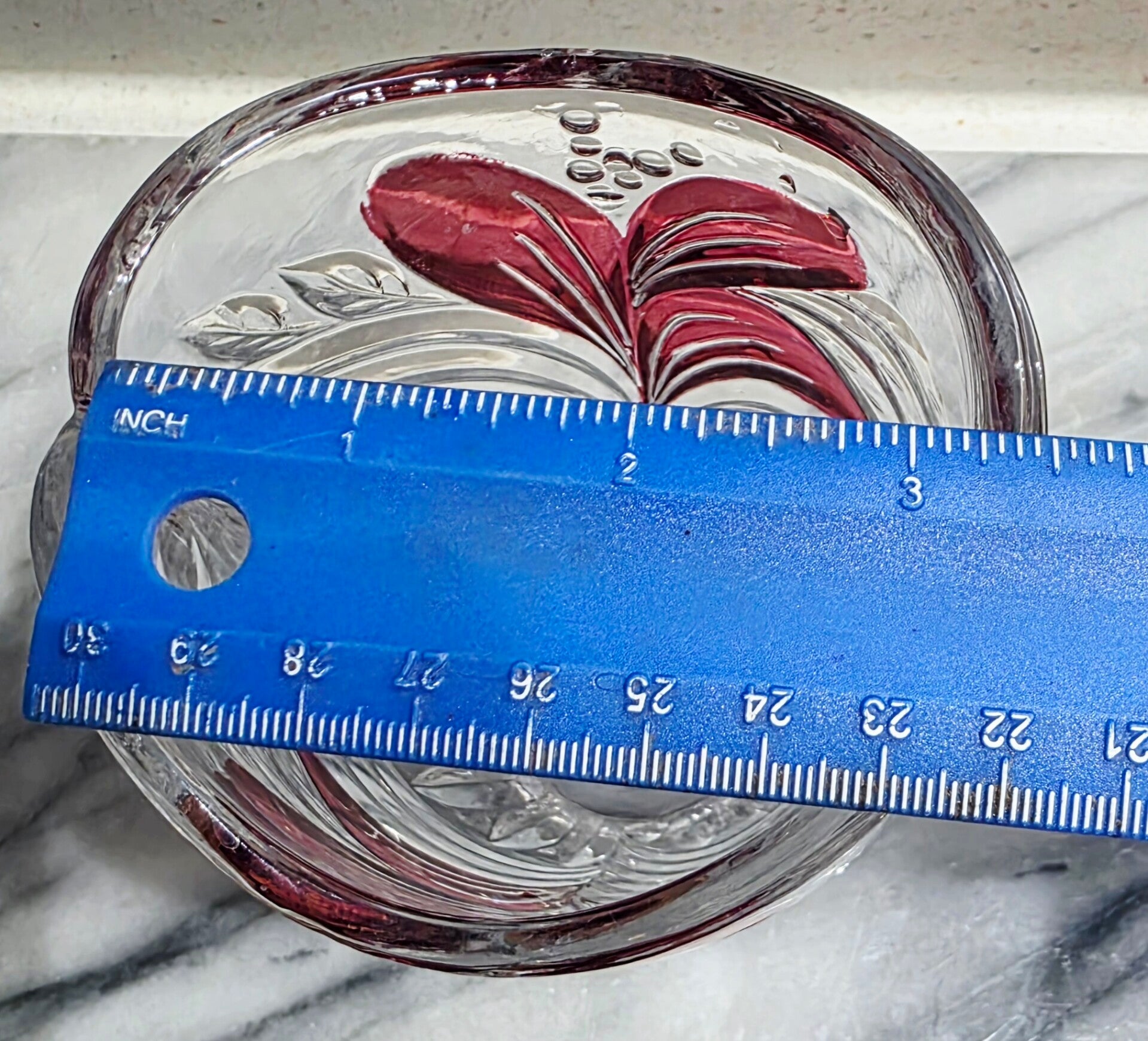 Design: Ruby red floral or leaf pattern, sometimes described as "cut to clear" or "red flash"