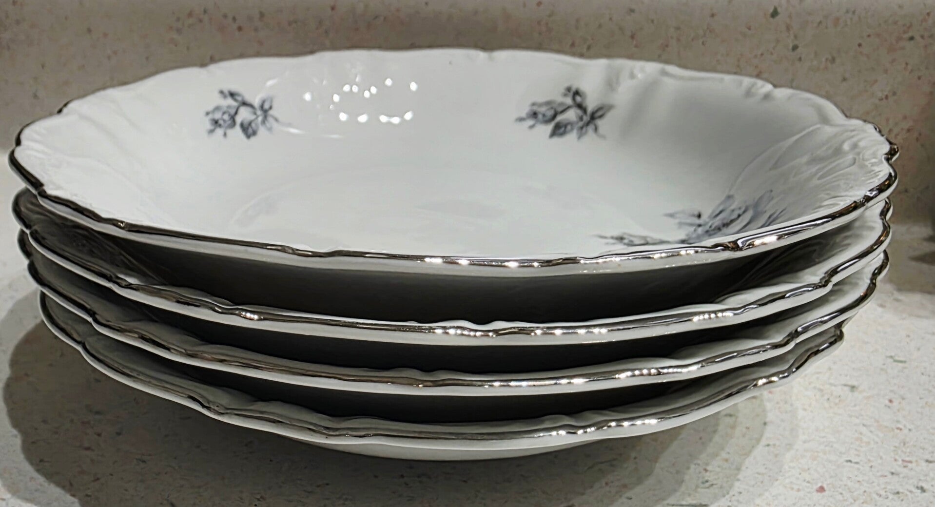 Stunning bowls crafted in Bavaria/Germany of high-quality porcelain. The pattern features gray roses positioned off the edge of the plate and includes a distinctive embossed scroll edge and silver trim. The primary design is presented in a black and white or gray-toned floral motif.
