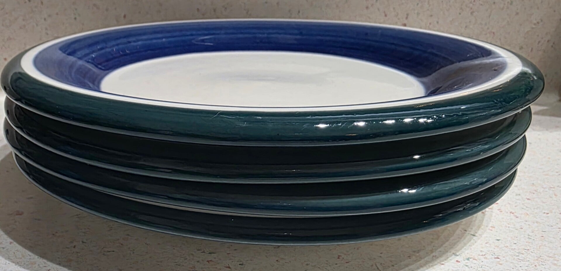 Features a distinctive white center, a wide cobalt blue hand-painted band, and a subtle green edge. Made of high-quality stoneware/ceramic. This specific pattern was produced between approximately 2000 and 2002 and is now discontinued.
