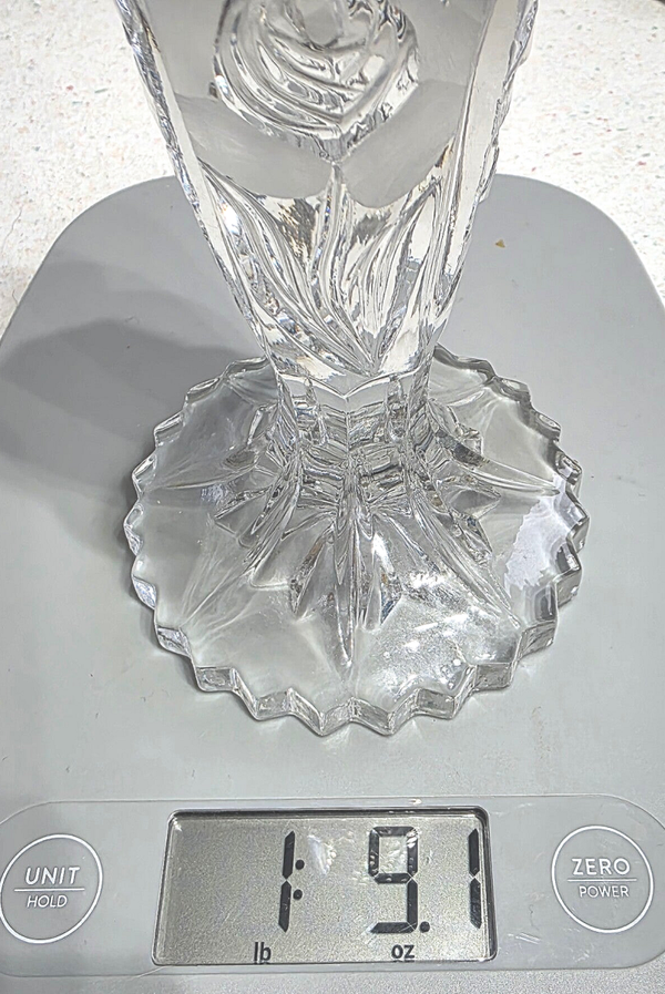 This Vintage Lead Crystal Pinwheel 8" Candlestick Holder with an Etched Rose is a stunning piece of decorative pottery and glassware. Made of clear glass with a glossy finish, this candlestick features a pressed glass production technique and is suitable for taper/dinner candles. The intricate star pattern and etched rose design add a touch of elegance to any room, making it a perfect addition to a vintage-inspired decor.