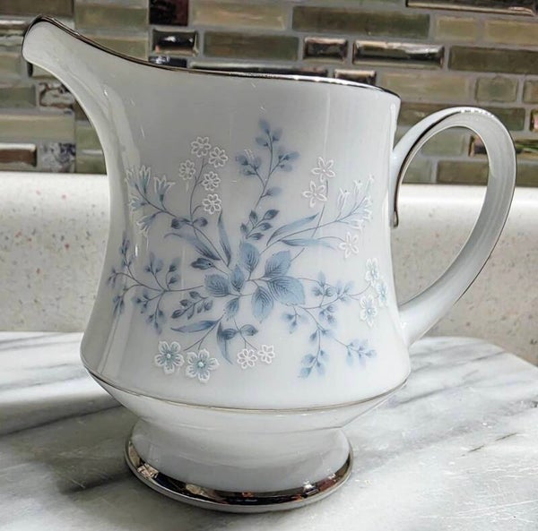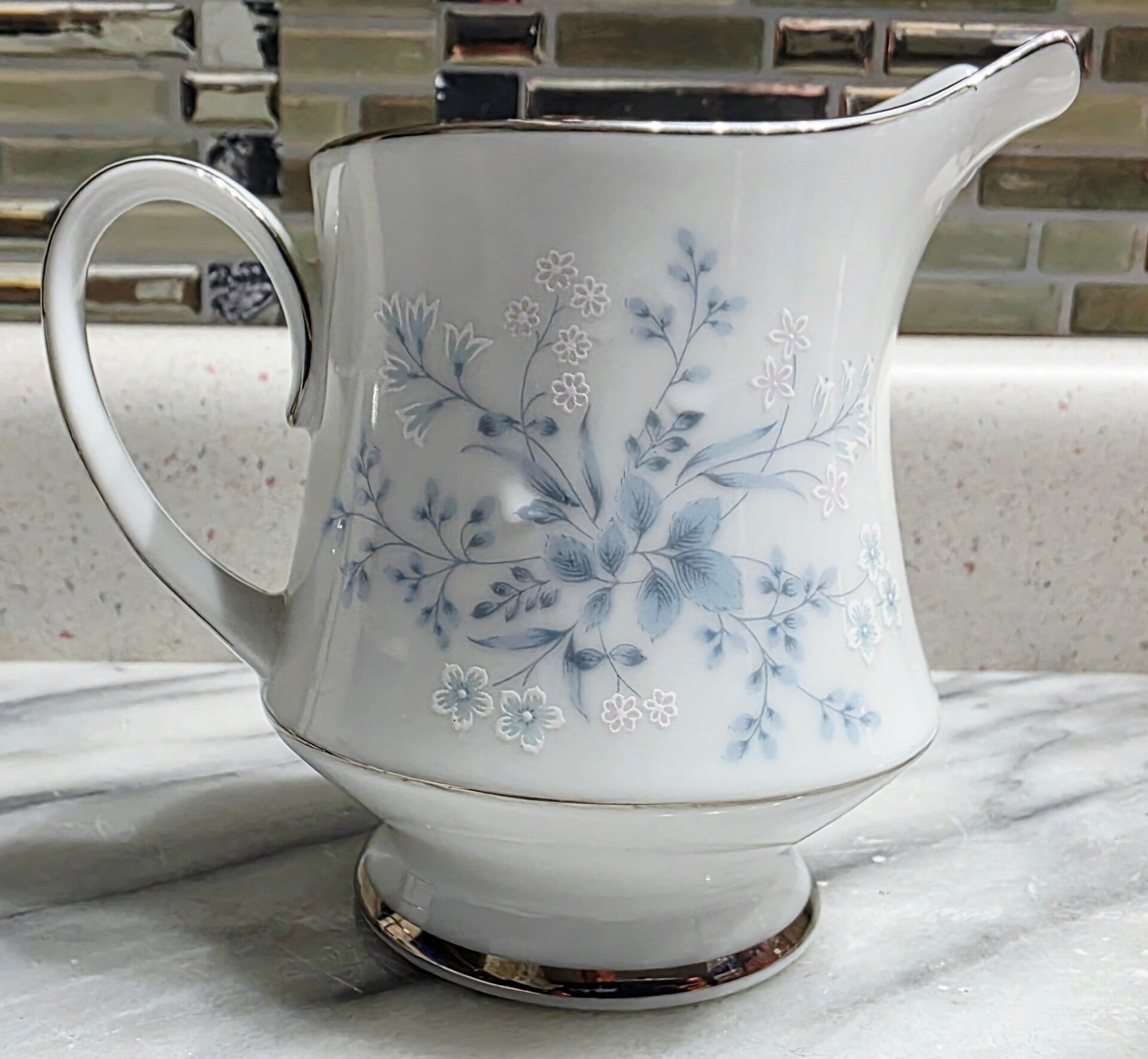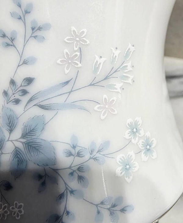Features blue floral patterns (forget-me-nots) on white porcelain with platinum trim. The pattern was active from 1977 to 1996 and is now discontinued. Holds approximately 8 ounces. Produced in locations including Japan, the Philippines, and Sri Lanka. Like new!! No discolorations, chips, or cracks.