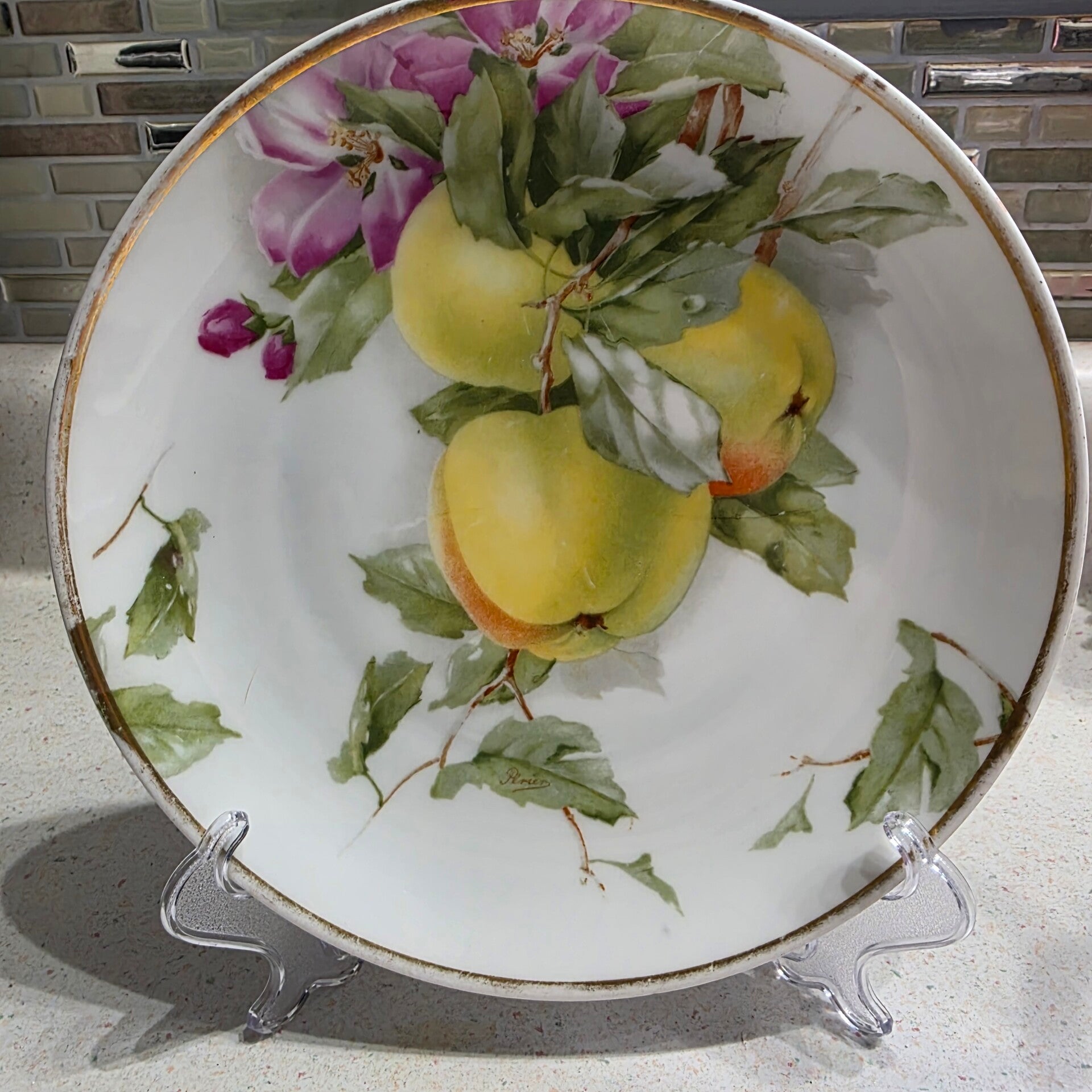 Hand-painted with a vibrant apple and blossom motif. Produced in Germany. Fine porcelain with a gold-trimmed edge. Measuring approximately 8.5 inches in diameter. Has some gold loss as shown in photos but otherwise great condition with no chips or cracks.