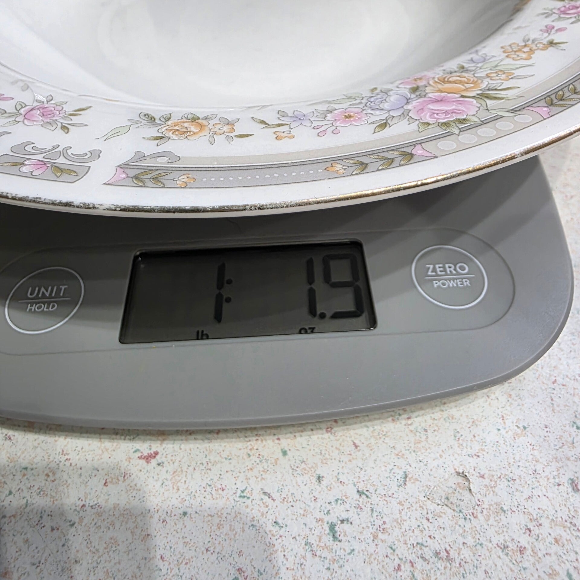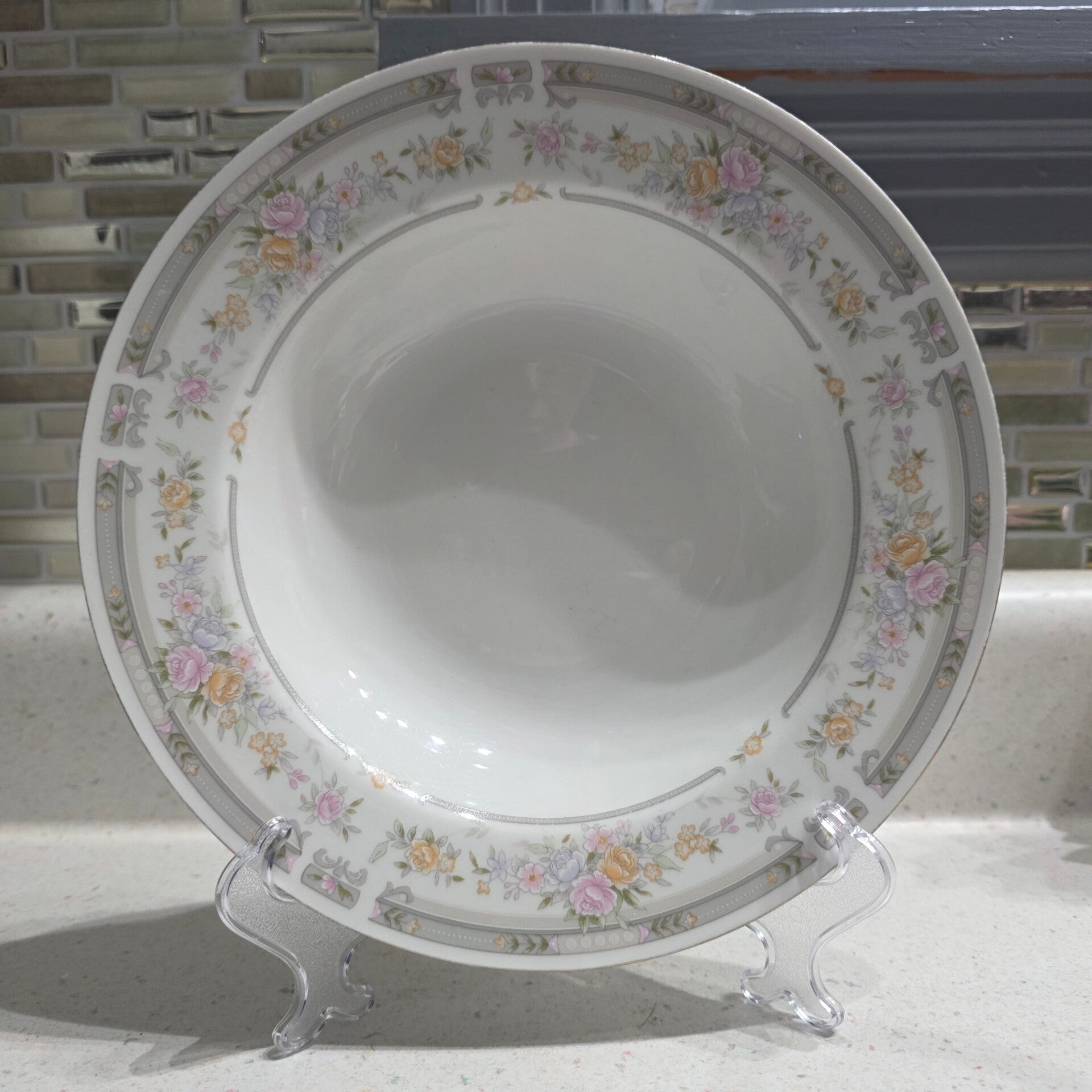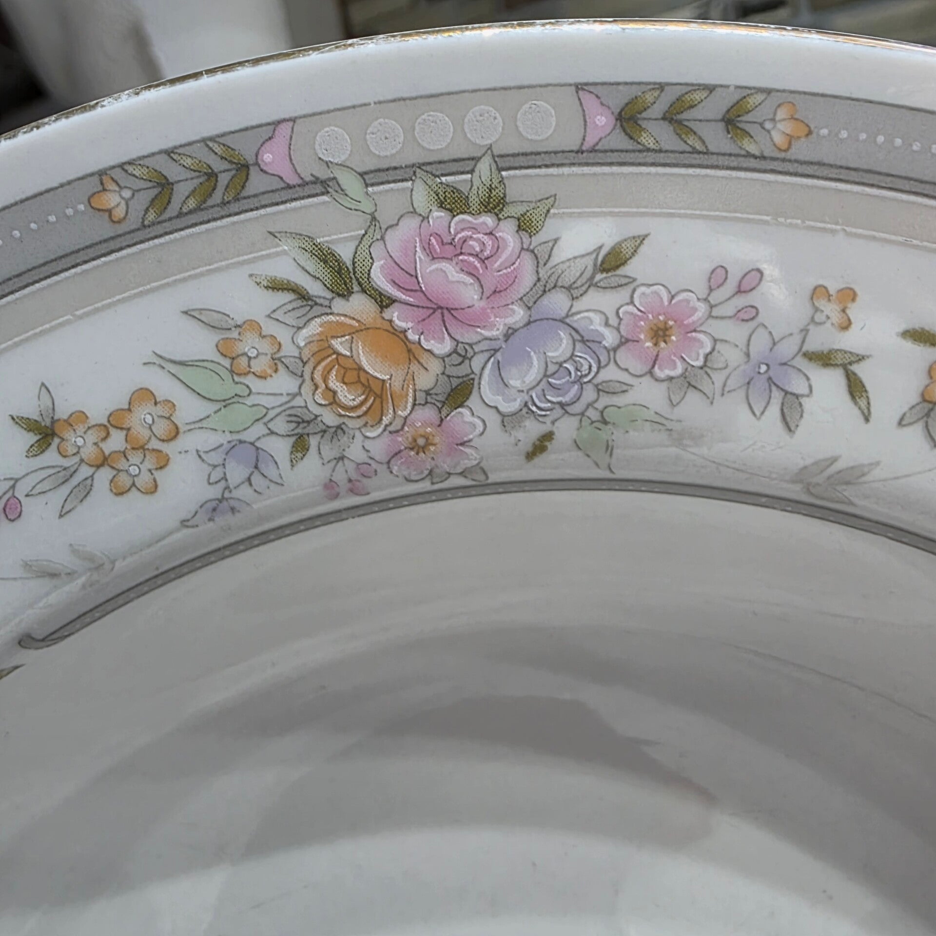 Just beautiful!! Features a delicate pink and yellow floral design with a gray band. Discontinued piece, approximately 8 1/4 to 9 inches in diameter, finished with a gold trim. Very sturdy, weighing over 1lb each. Great condition with no chips or cracks.