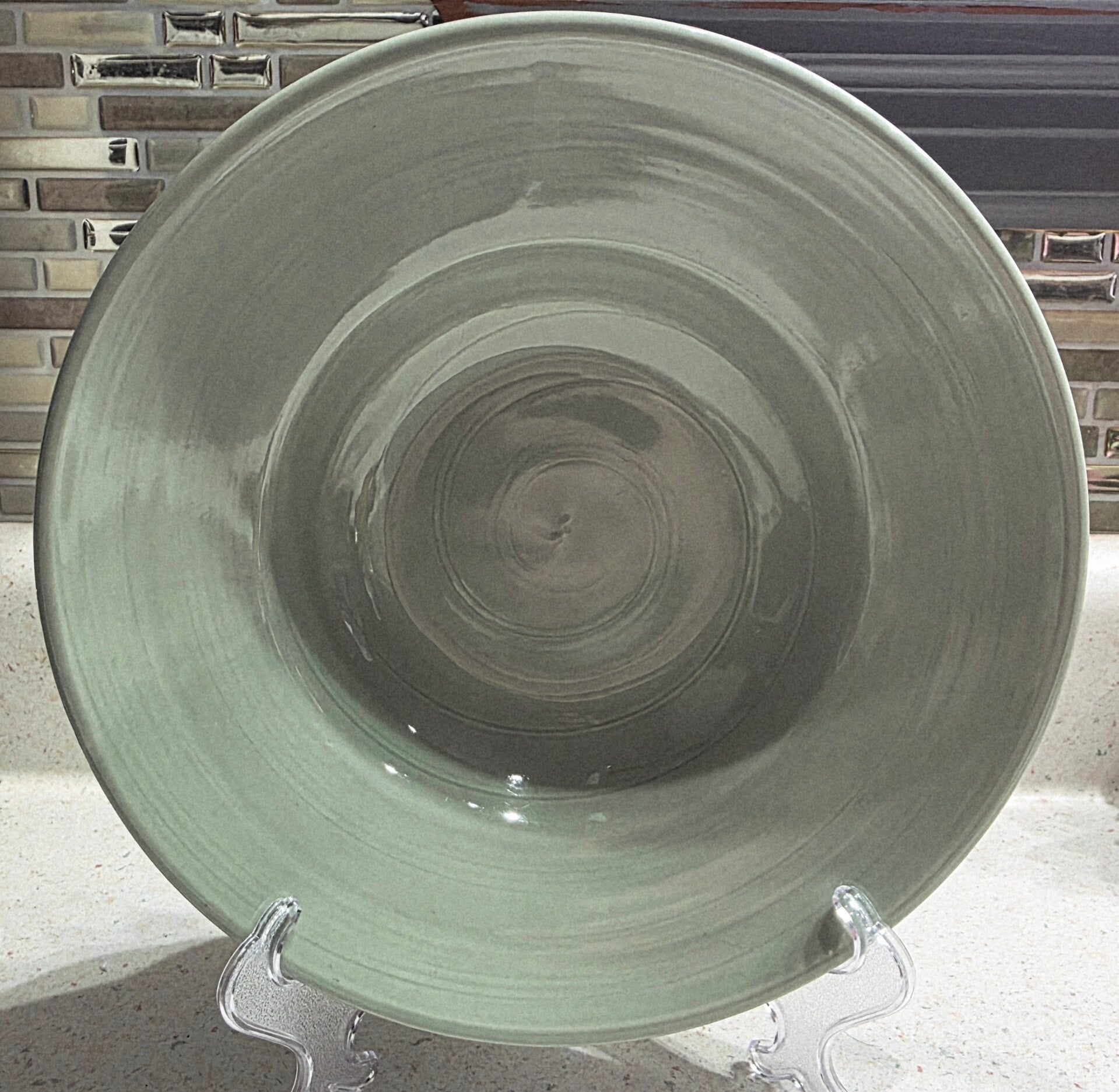 Features a distinctive glazed finish with a subtle swirl pattern. Made of durable high quality glazed stoneware construction. Wide rim profile with a rustic, handcrafted appearance. Designed to be both microwave and dishwasher safe for convenient daily use. Measures approximately 8.5 inches in diameter. Discontinued piece. Very heavy, weighing nearly 2lbs each.
