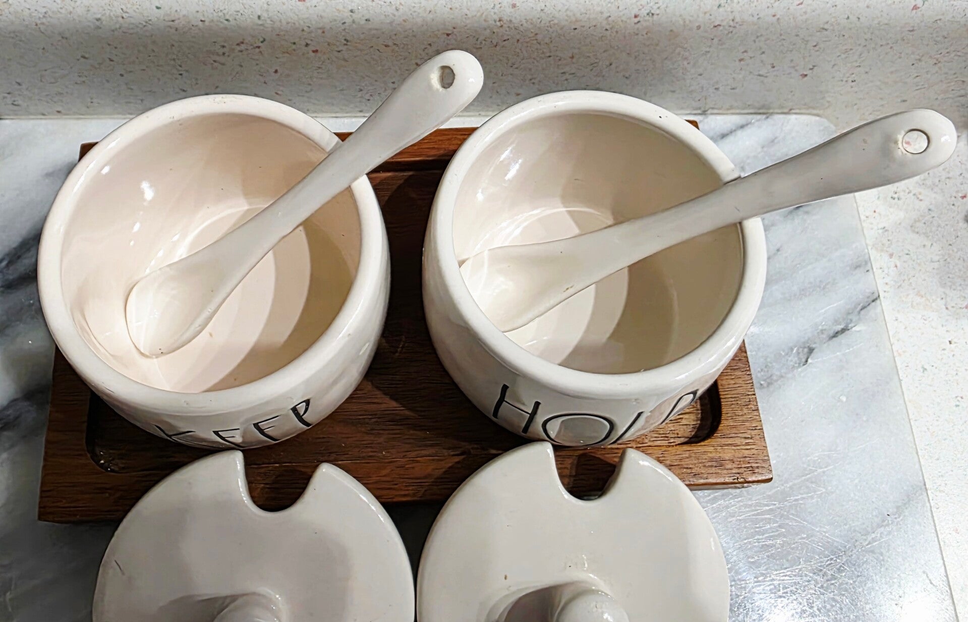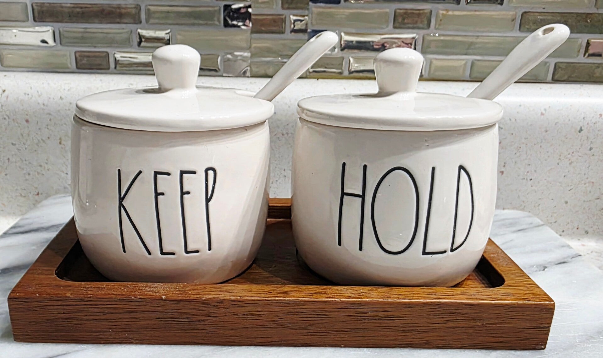 Featuring ceramic jars labeled "HOLD" and "KEEP", complete with matching lids, spoons, and a wooden base. Dishwasher-safe ceramic. Designed for storing and serving condiments, honey, or sugar. Measuring approximately 3 inches in height and 3.5 inches in diameter. Recommended for hand washing only. Like new with no chips or cracks.