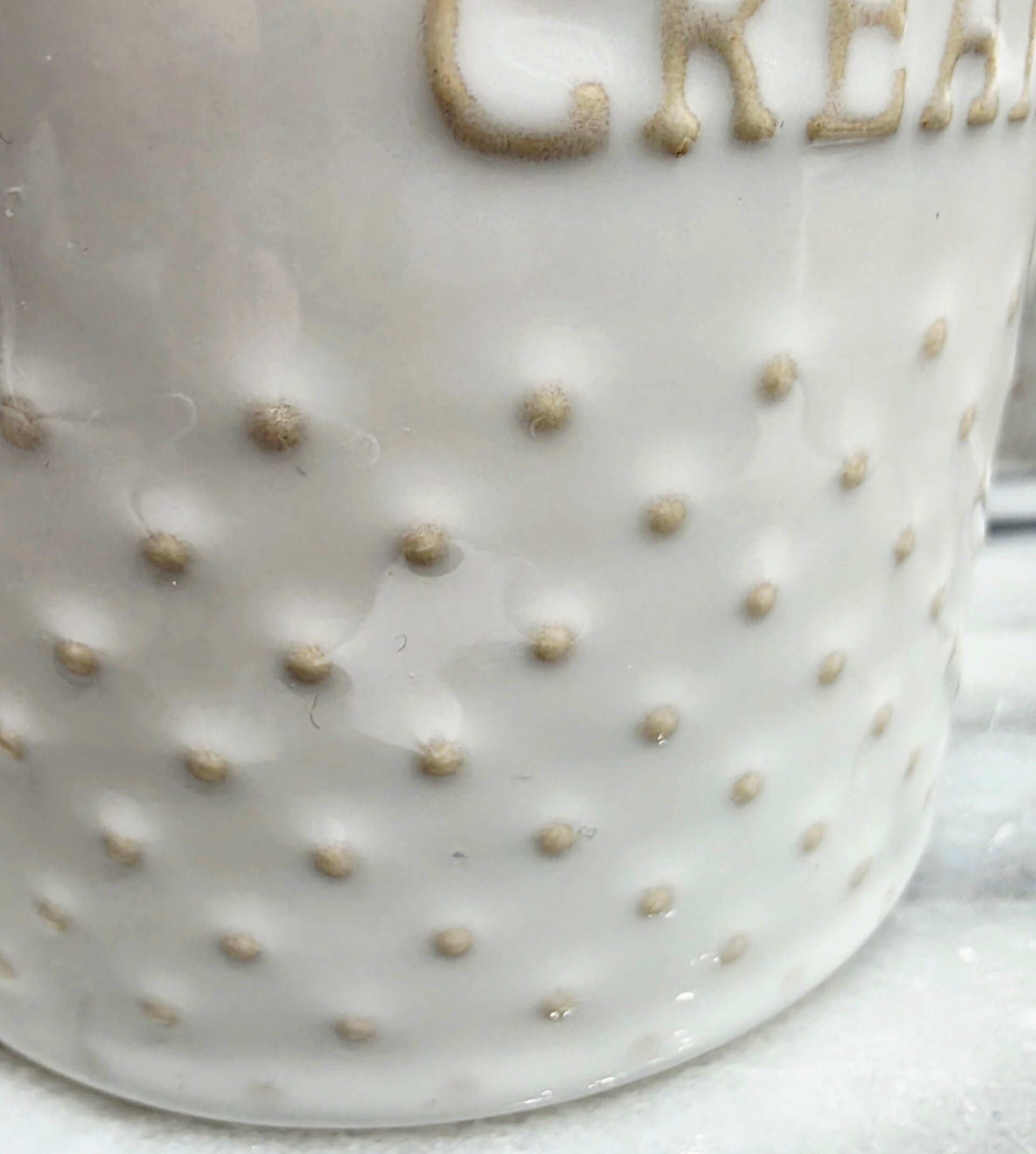 Features a white ceramic design with a raised dot (hobnail) pattern and the word "CREAM" embossed on the side. Hold approximately 14 ounces. Roughly 3 1/4 inches in height and 4 inches in width. Durable stoneware that is both dishwasher and microwave safe. Excellent condition with no chips or cracks.