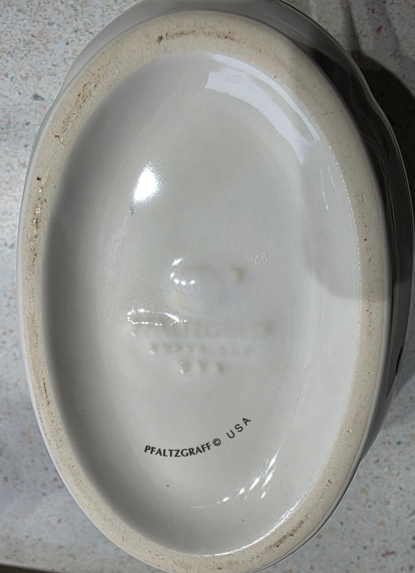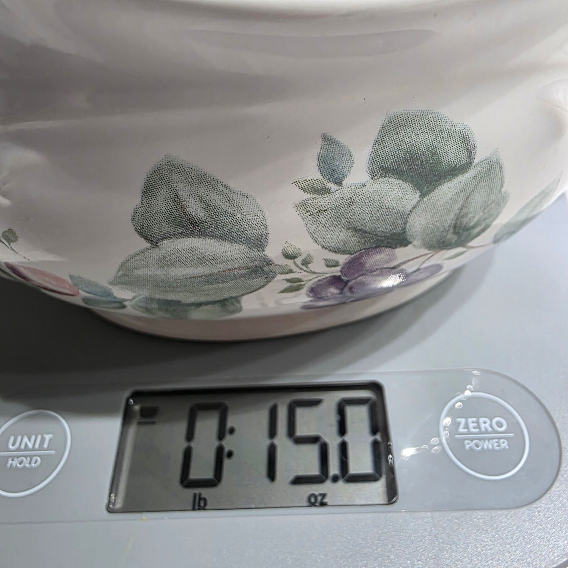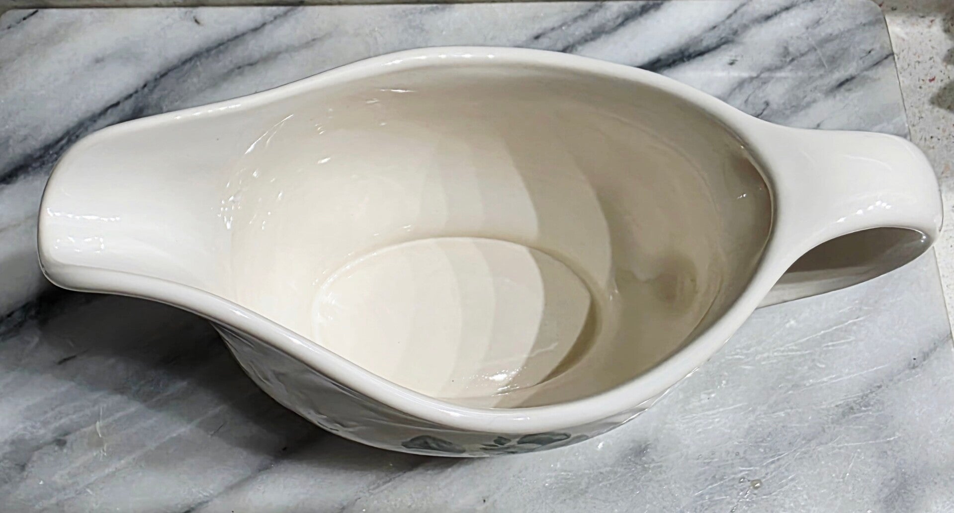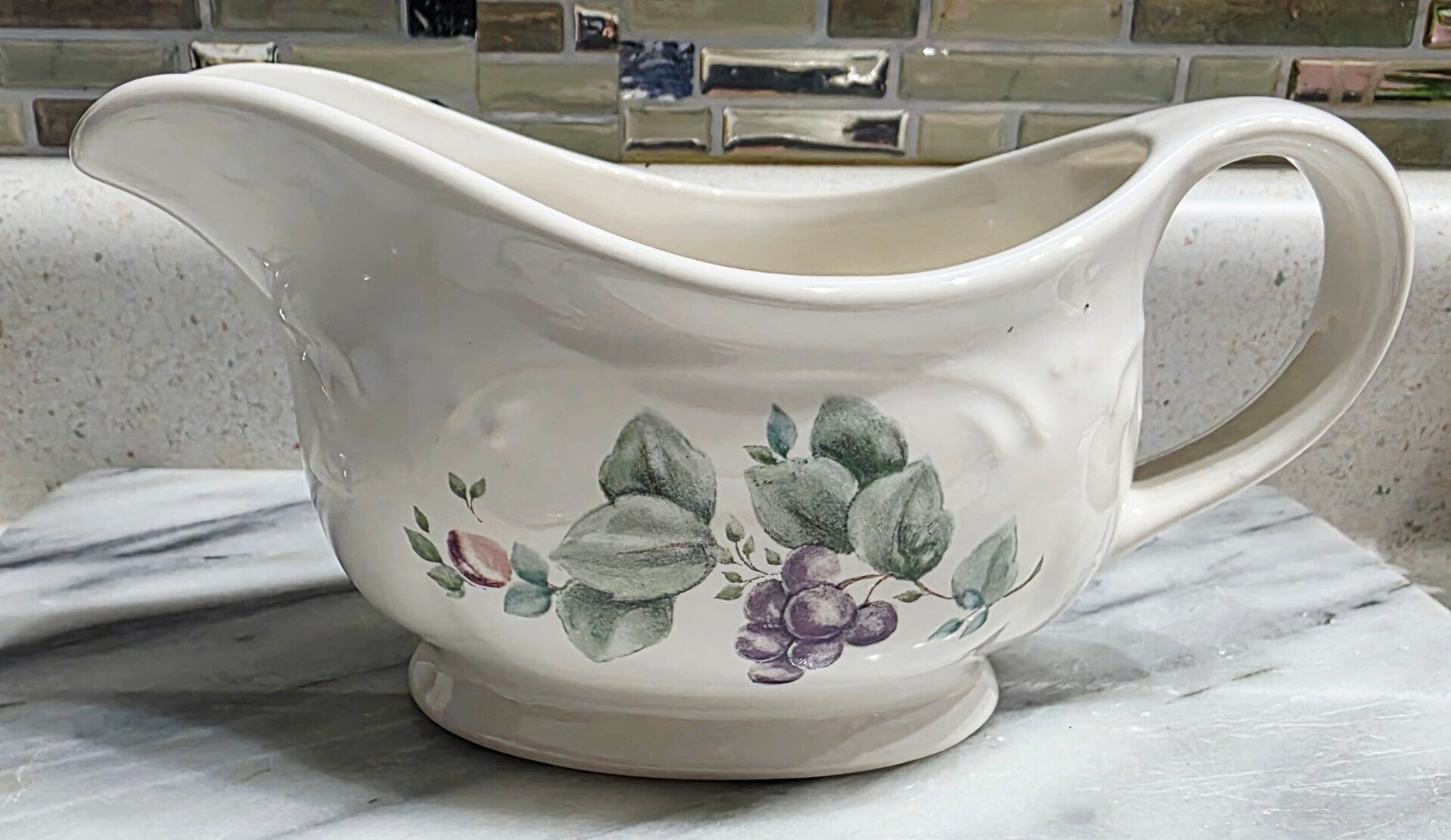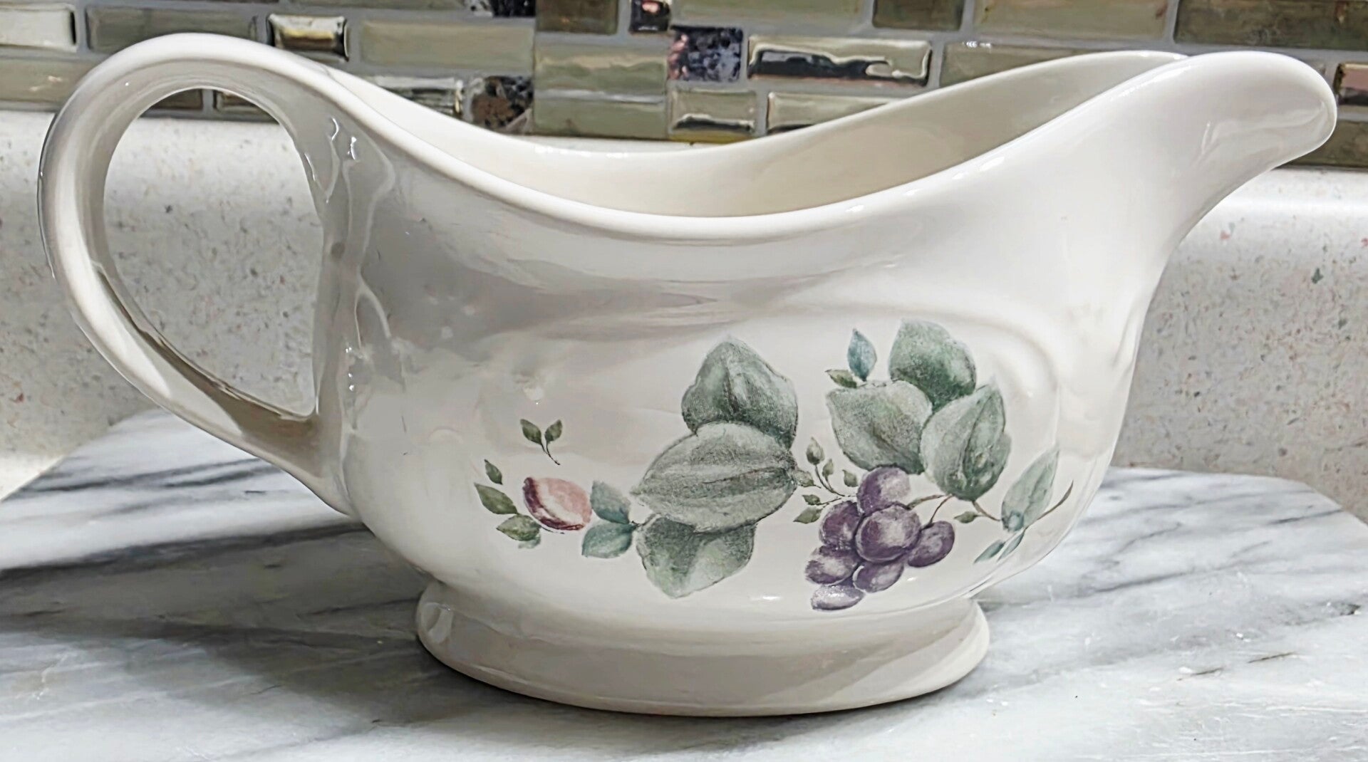 Crafted from durable stoneware and features purple grapes, pink flowers, and green leaves on a cream-colored background. These pieces were frequently manufactured in the USA and are considered collectible vintage items. The design typically includes a handle and a pouring spout for serving sauces and gravies. Measures approximately 8 inches long, 3.5 inches wide, and 3.75 inches high.
