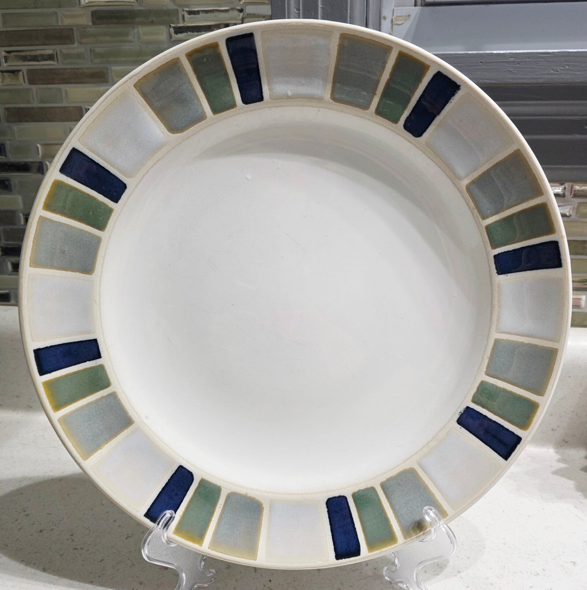 Features a contemporary design with a staggered block-colored rim in shades of blue, green, and gray. Microwave and dishwasher safe. This pattern is currently discontinued. Measures approximately 11.25 inches in diameter.
