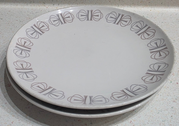 Features a geometric border of stylized pink and gray motifs. Lightweight "Whitestone" (stoneware/porcelain), making these oven, microwave and dishwasher safe.