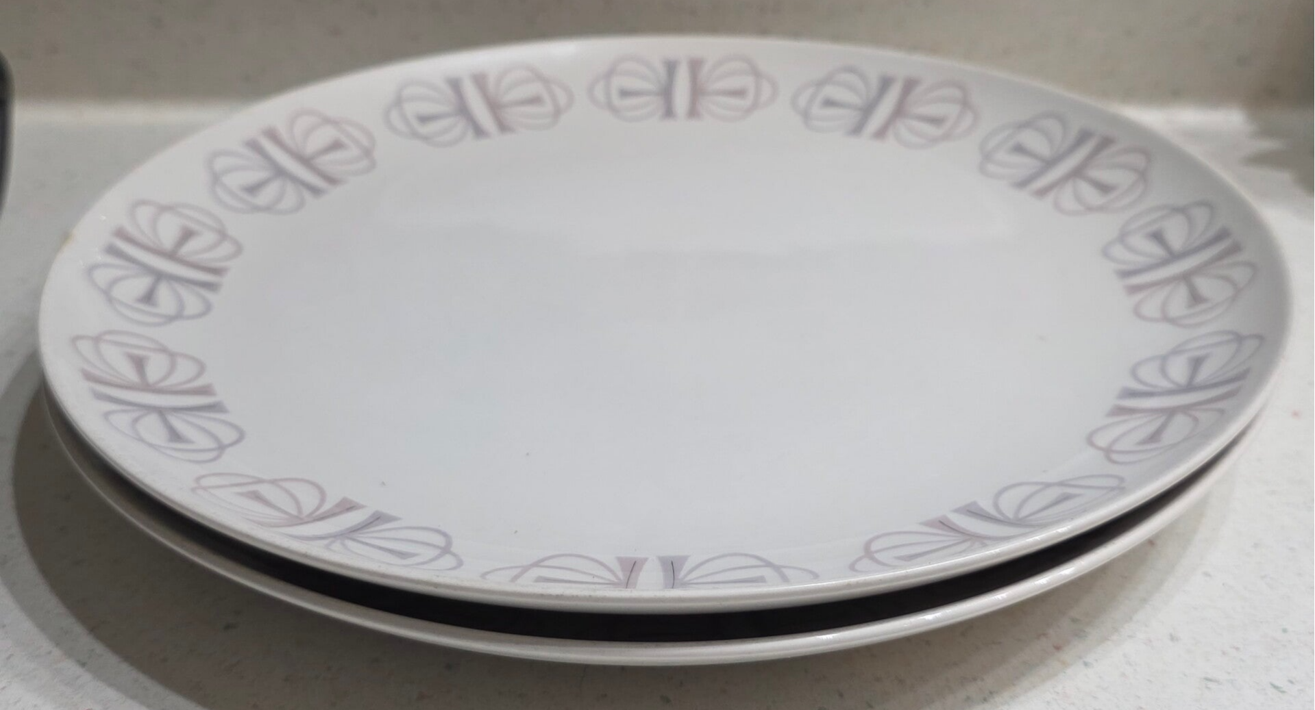 This plate features the "Merry-Go-Round" pattern, a classic mid-century modern design from the Franciscan Whitestone Ware line, (often marked "Made in Japan" on the underside). Pattern Code: FN MEGR Dimensions: 10.25-inch Materials: Ceramic / Stone Ware Heavy weighing 1 1/2 lbs. each.
