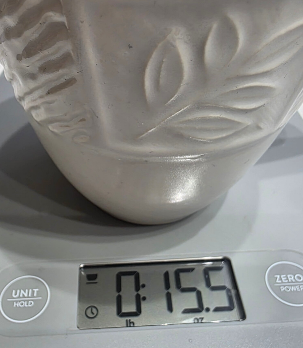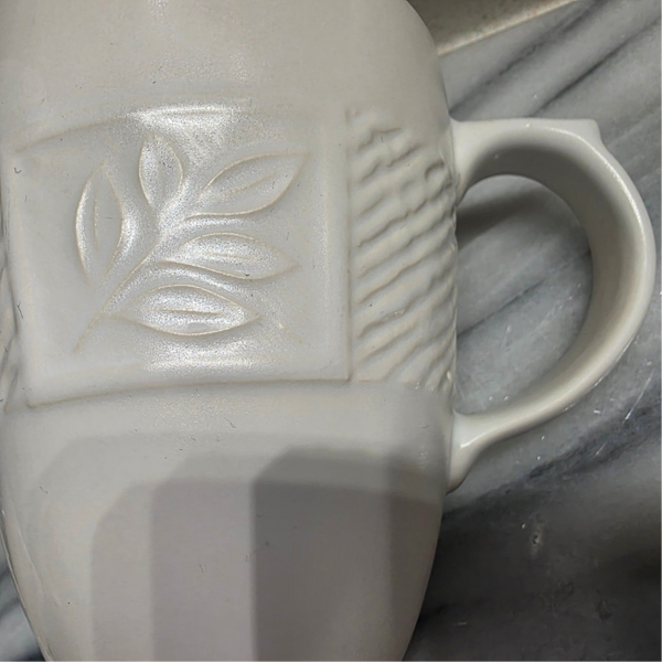 Features an embossed leaf and fern motif set within rectangular panels, complemented by sections of diagonal wavy lines. Measures approximately 4 5/8 inches tall. Made of durable stoneware that is dishwasher, microwave, and freezer safe. This pattern is currently discontinued. Heavy, weighing nearly 1lb each.