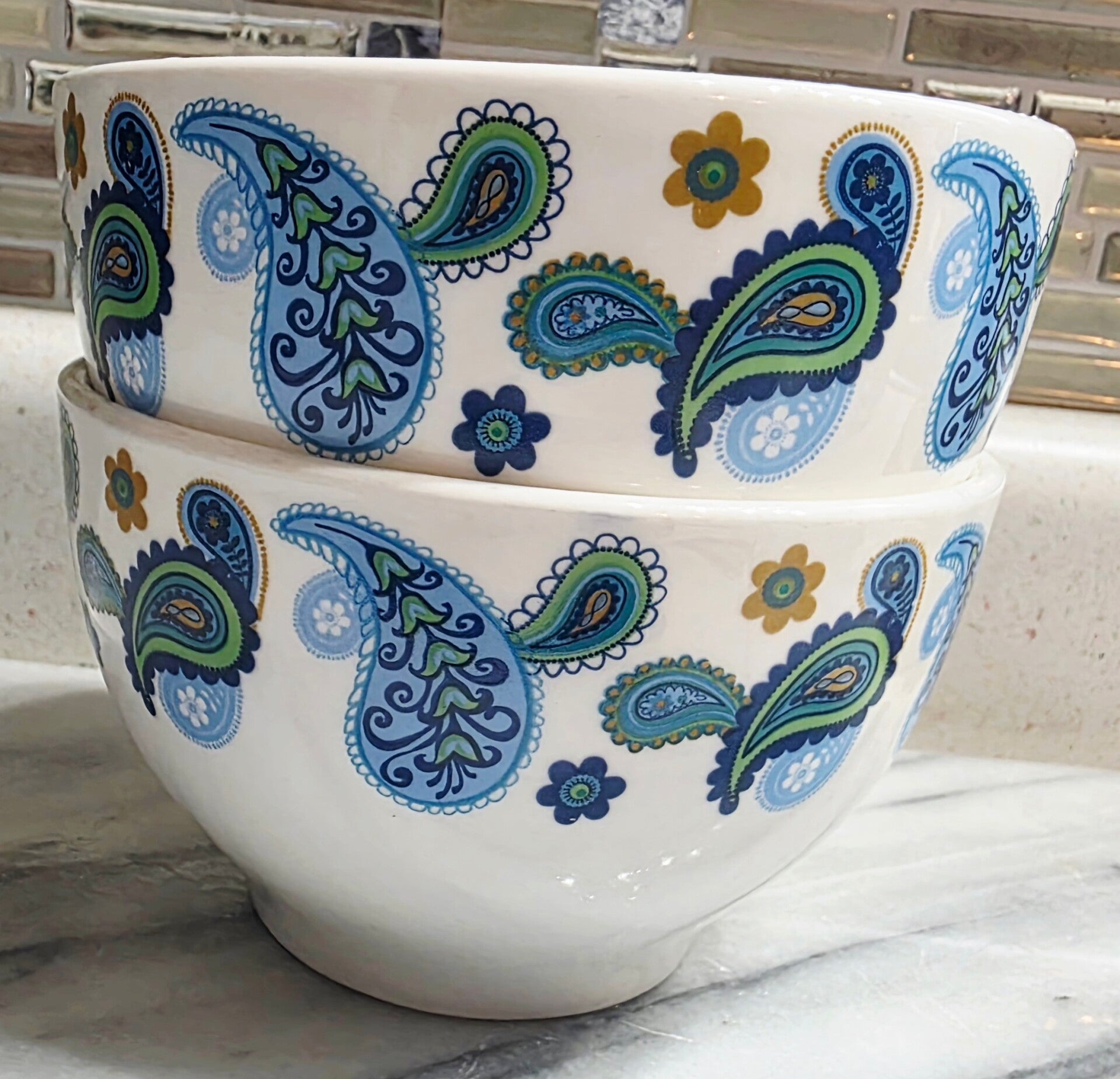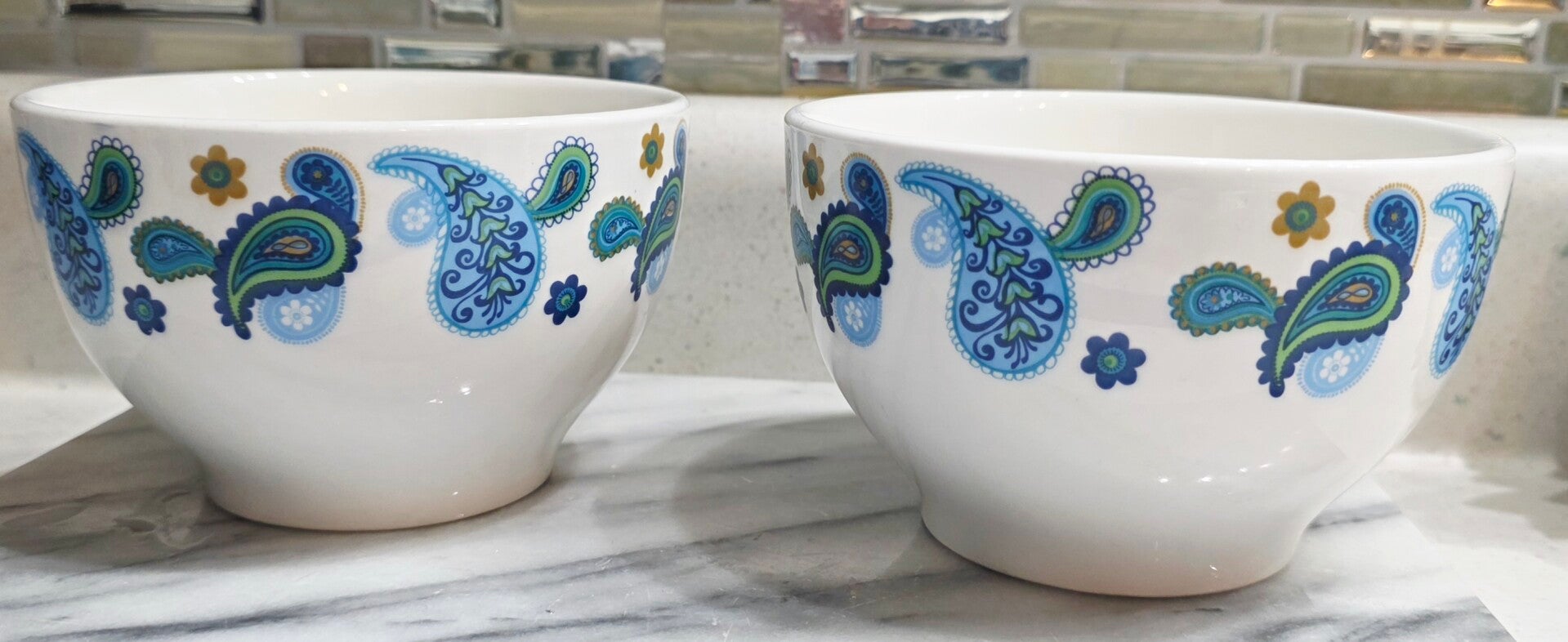 Stoneware white bowls with a blue, green, and mustard paisley pattern. Measures pproximately 5.5 inches in diameter. Microwave and dishwasher safe.