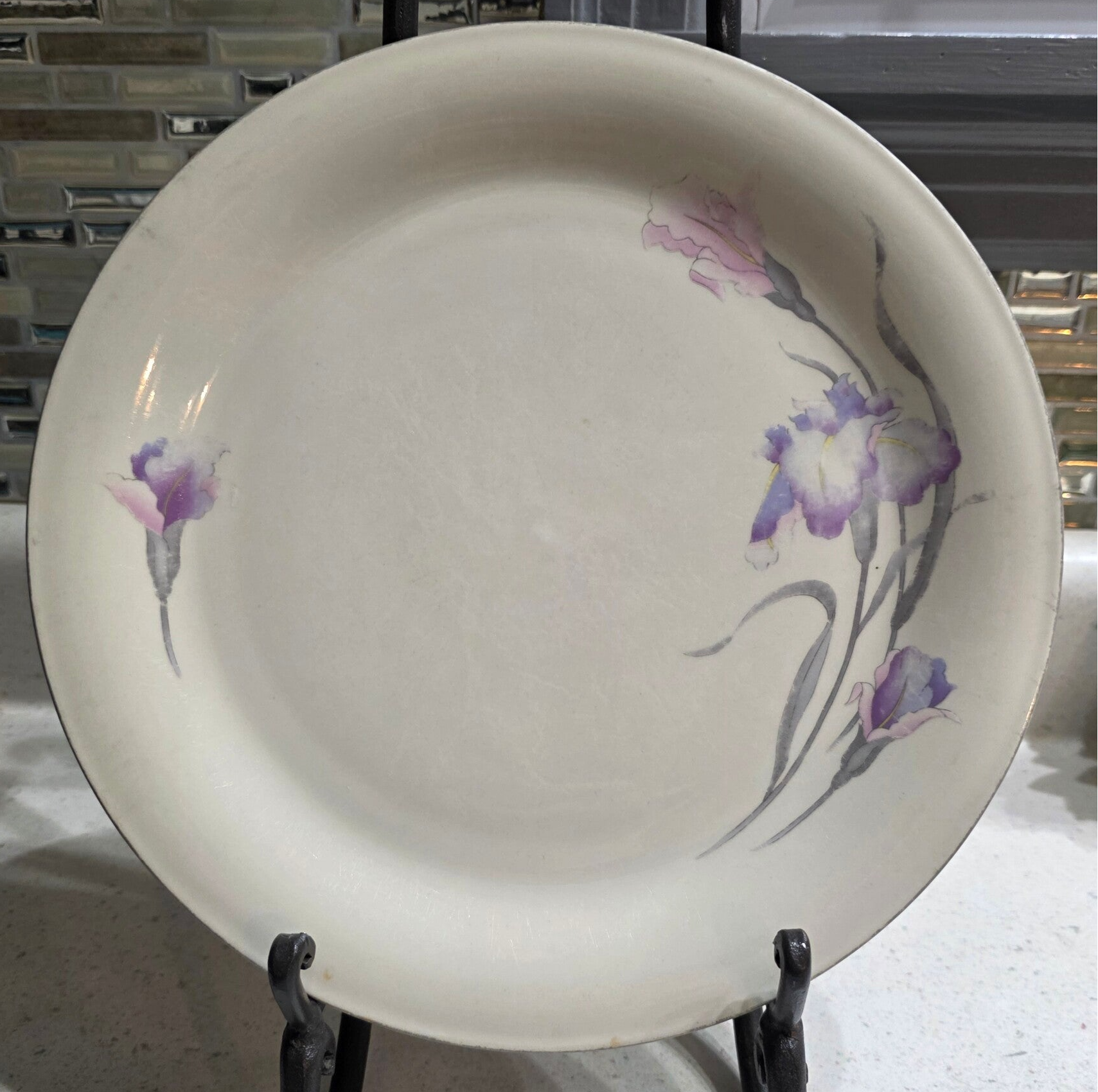 Features a pastel orchid floral design in pink and purple on a light-colored background. Made of durable stoneware suitable for everyday use. Discontinued (originally manufactured between 1988 and 1996). Show signs of regular use.