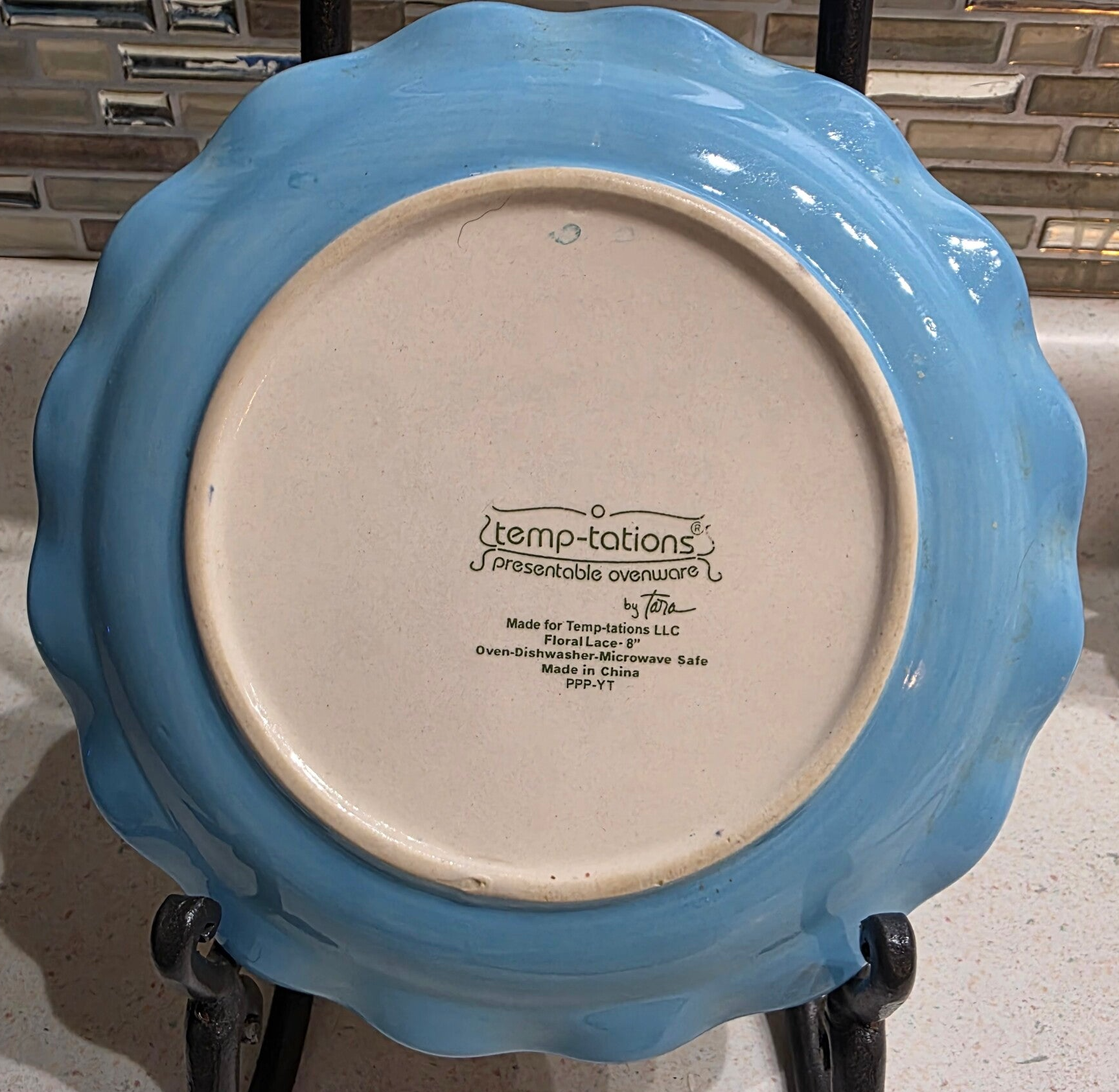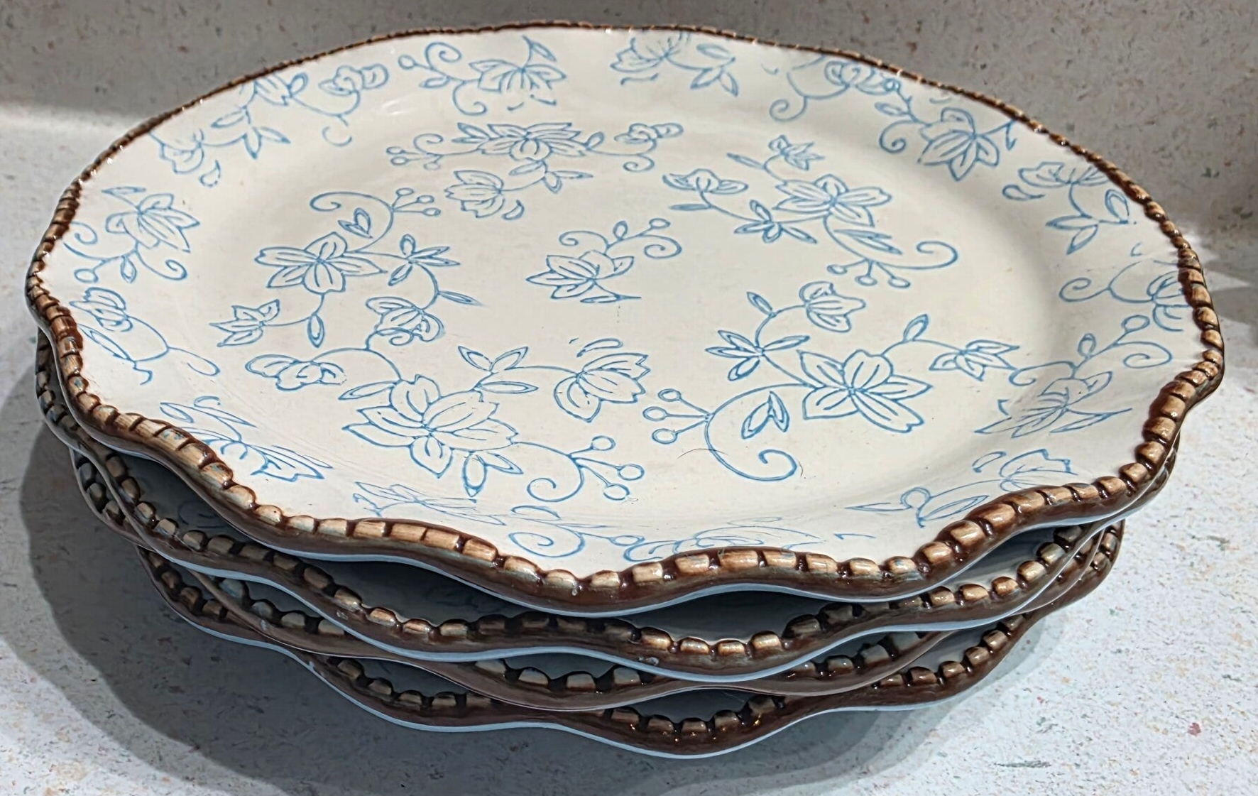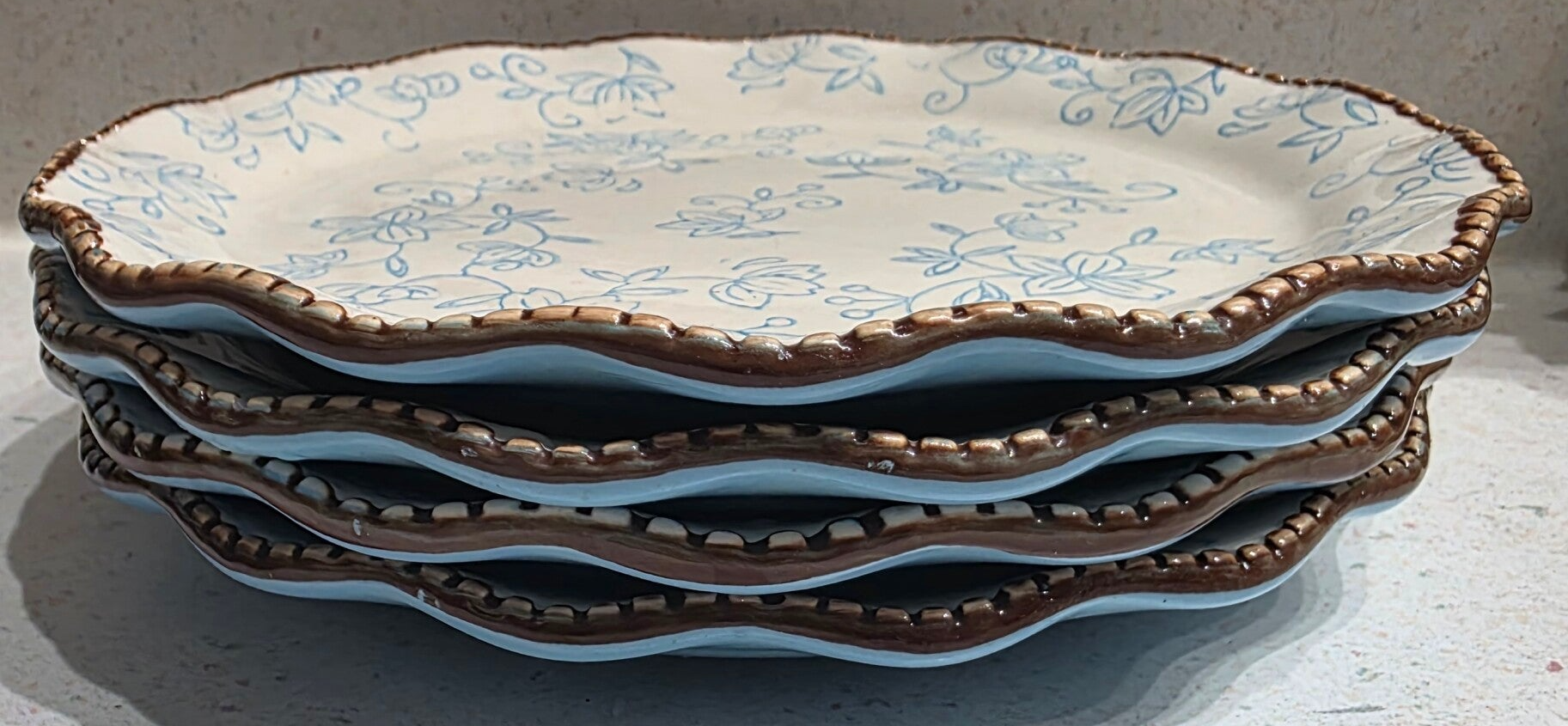 Blue floral design on a white background with a brown scalloped, beaded Made of Ceramic stoneware. Dishwasher, microwave, and oven safe. Measures 8" in diameter. Heavy stoneware, weighing 1lb each Discontinued, with production running from approximately 2011 to 2025.