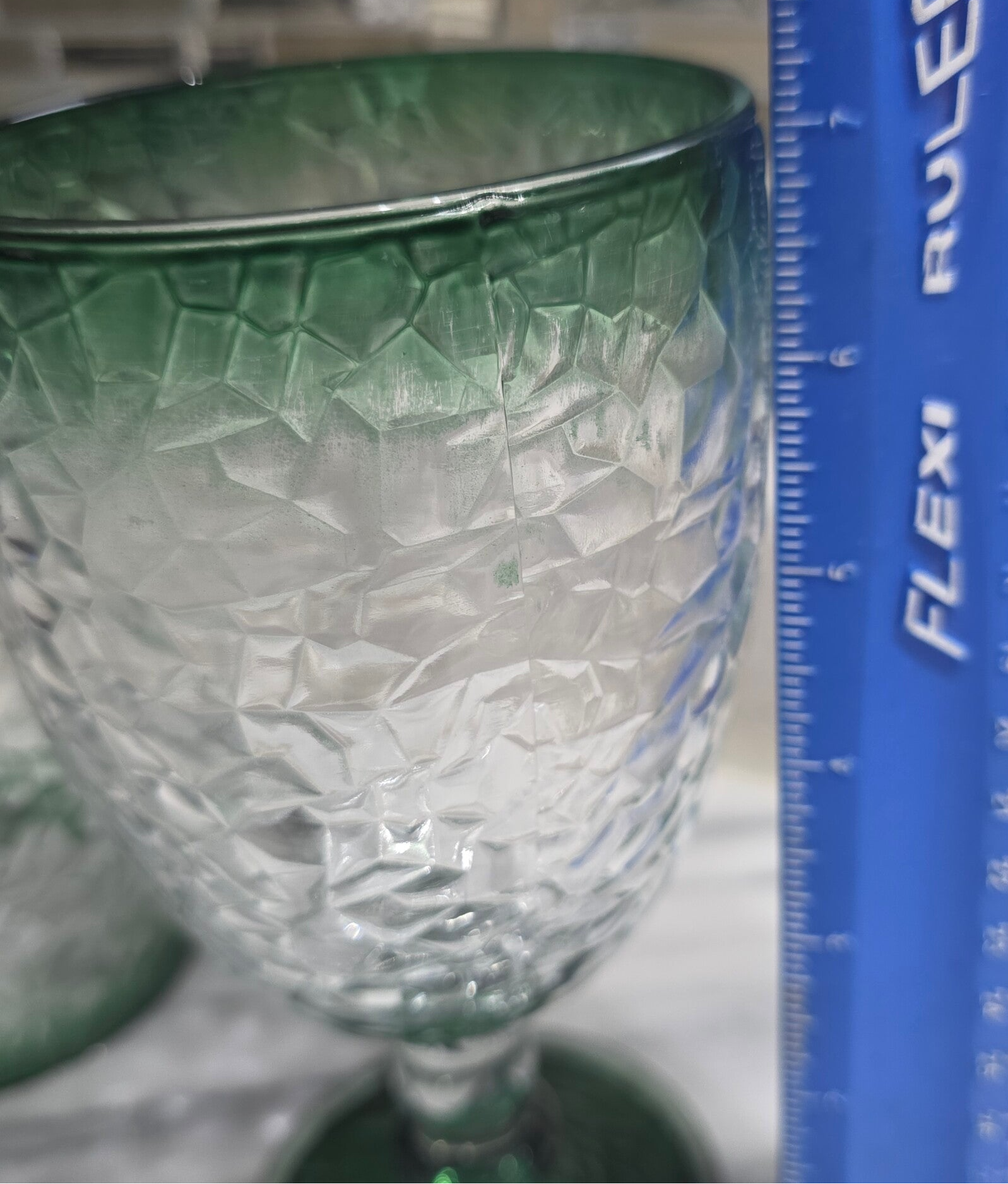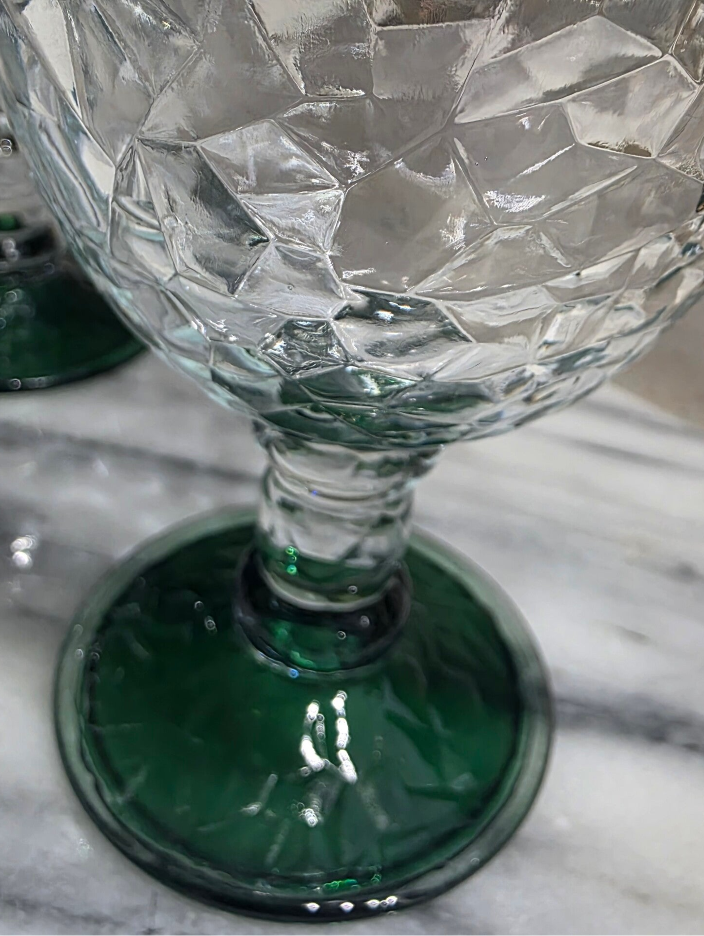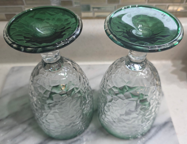 Vintage Libby Glass goblets in a crackle pattern. Distinctive "chunky" crackle or faceted texture throughout the bowl, creating a crushed-ice appearance. Clear glass with a vibrant green gradient at the rim and a solid green foot. T\