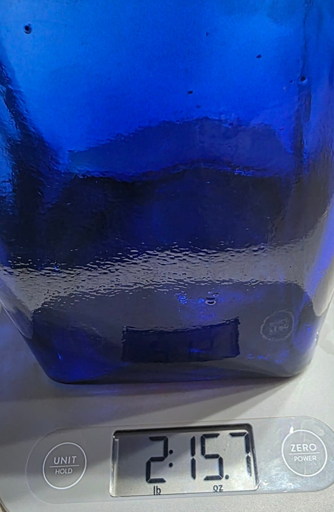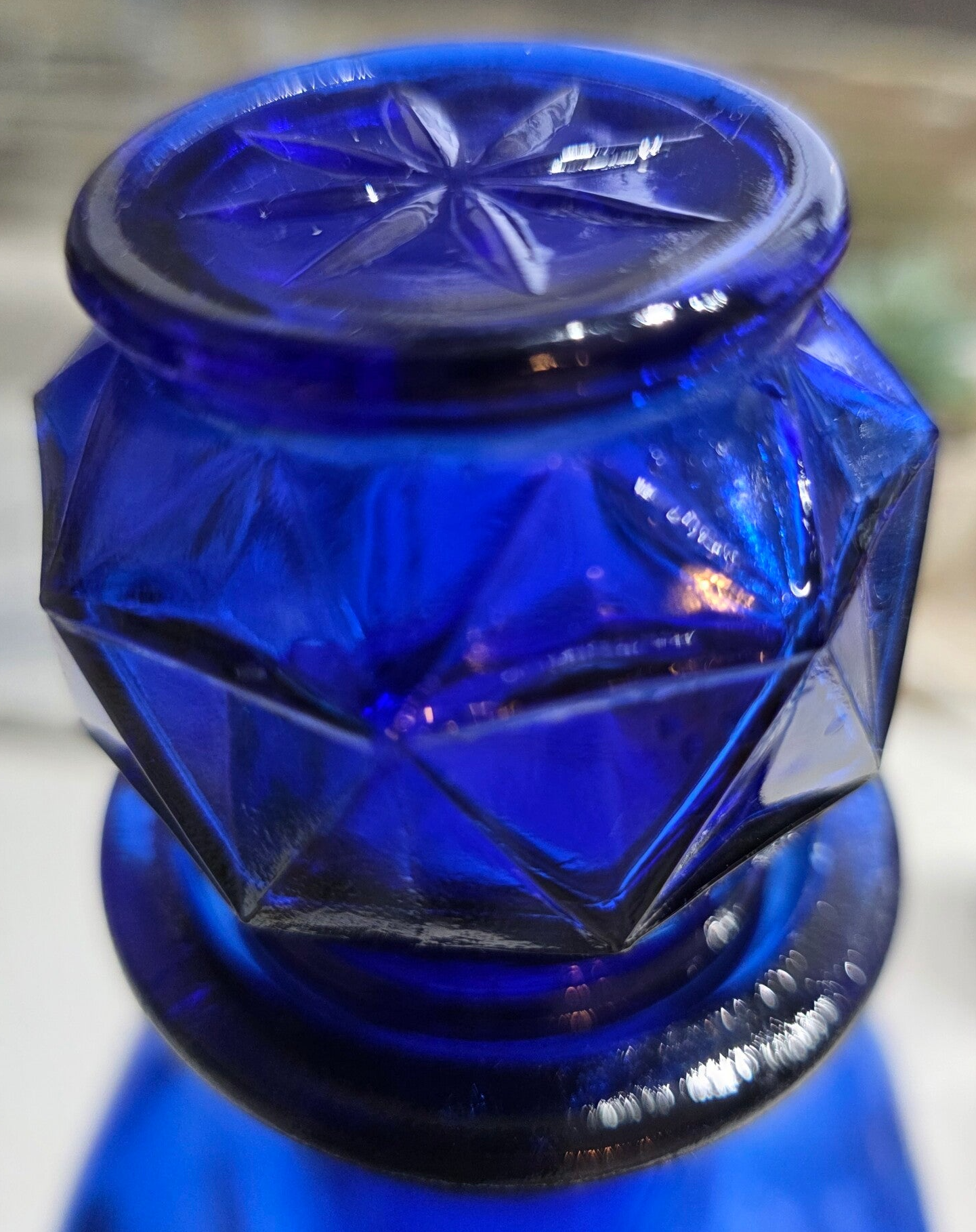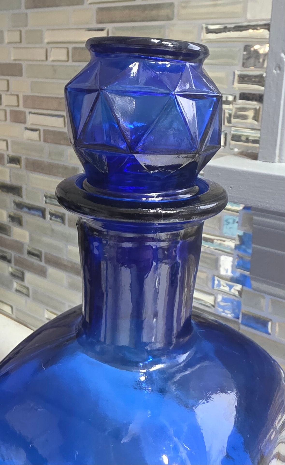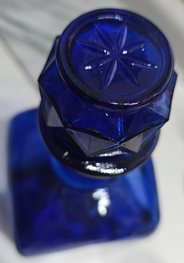 Features a distinctive faceted glass stopper and a rectangular body. Rich, deep cobalt blue glass. Measures approximately 4" wide and 11 1/2" tall (bottle only) or 13.25" tall with stopper.