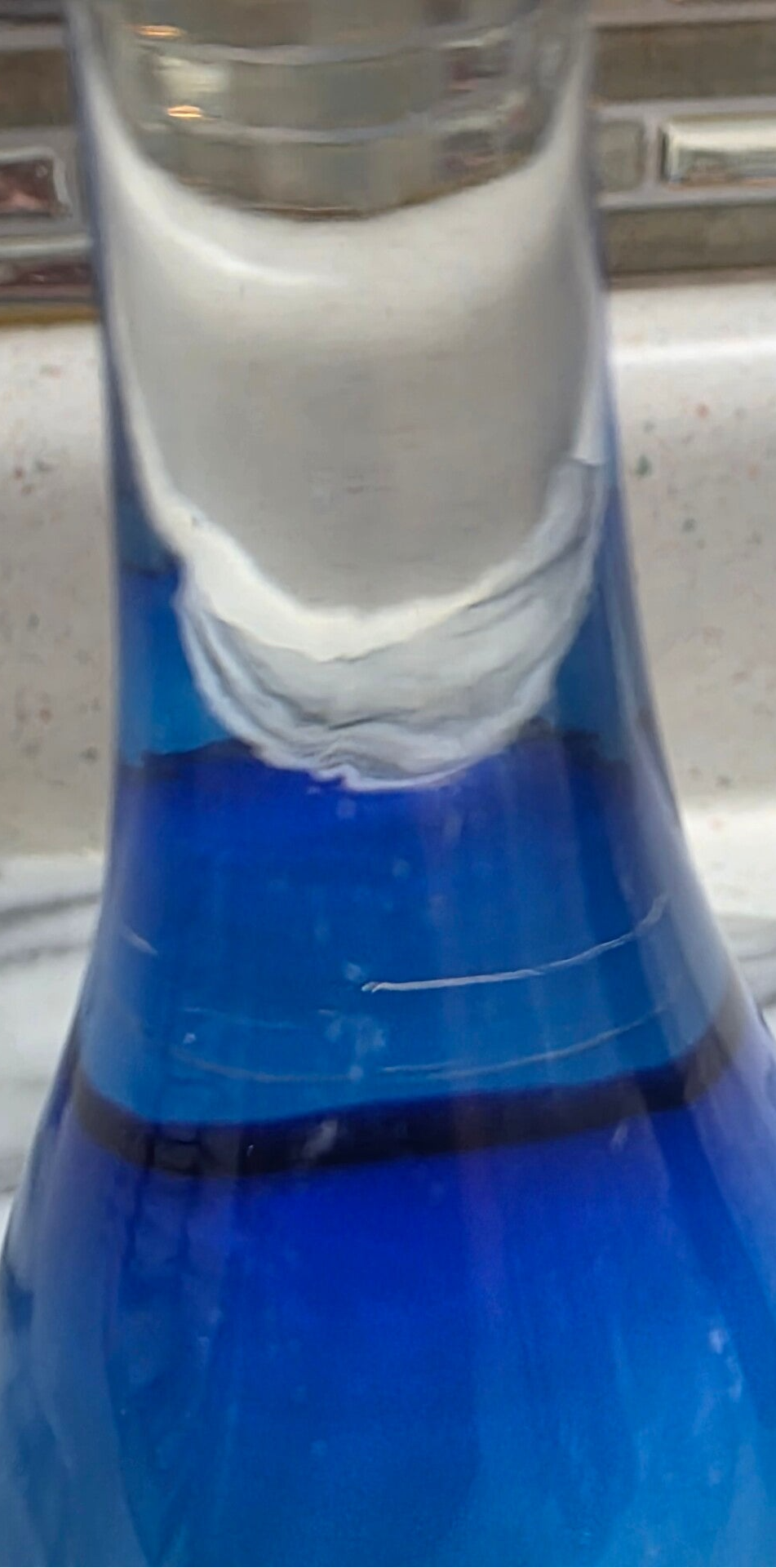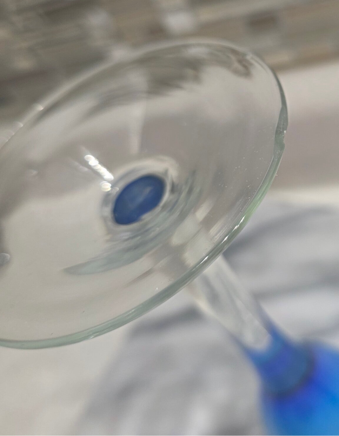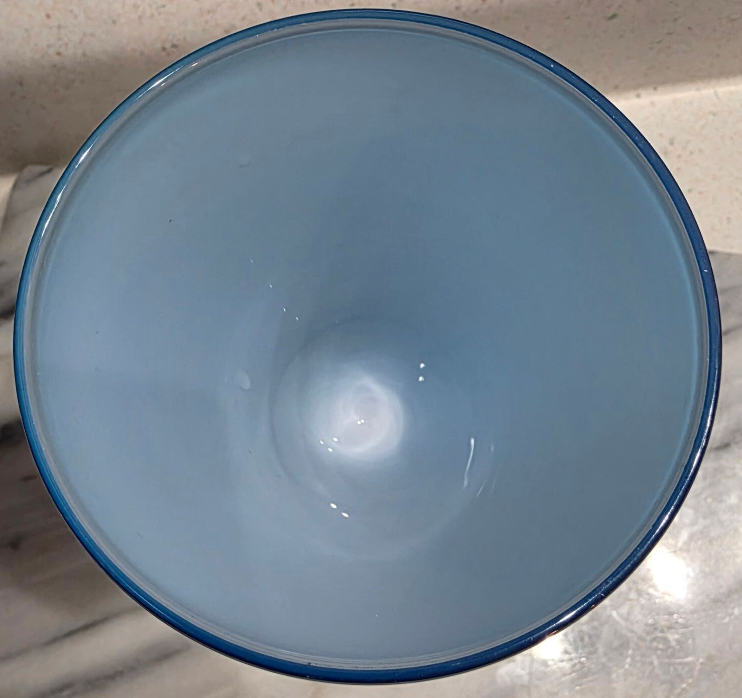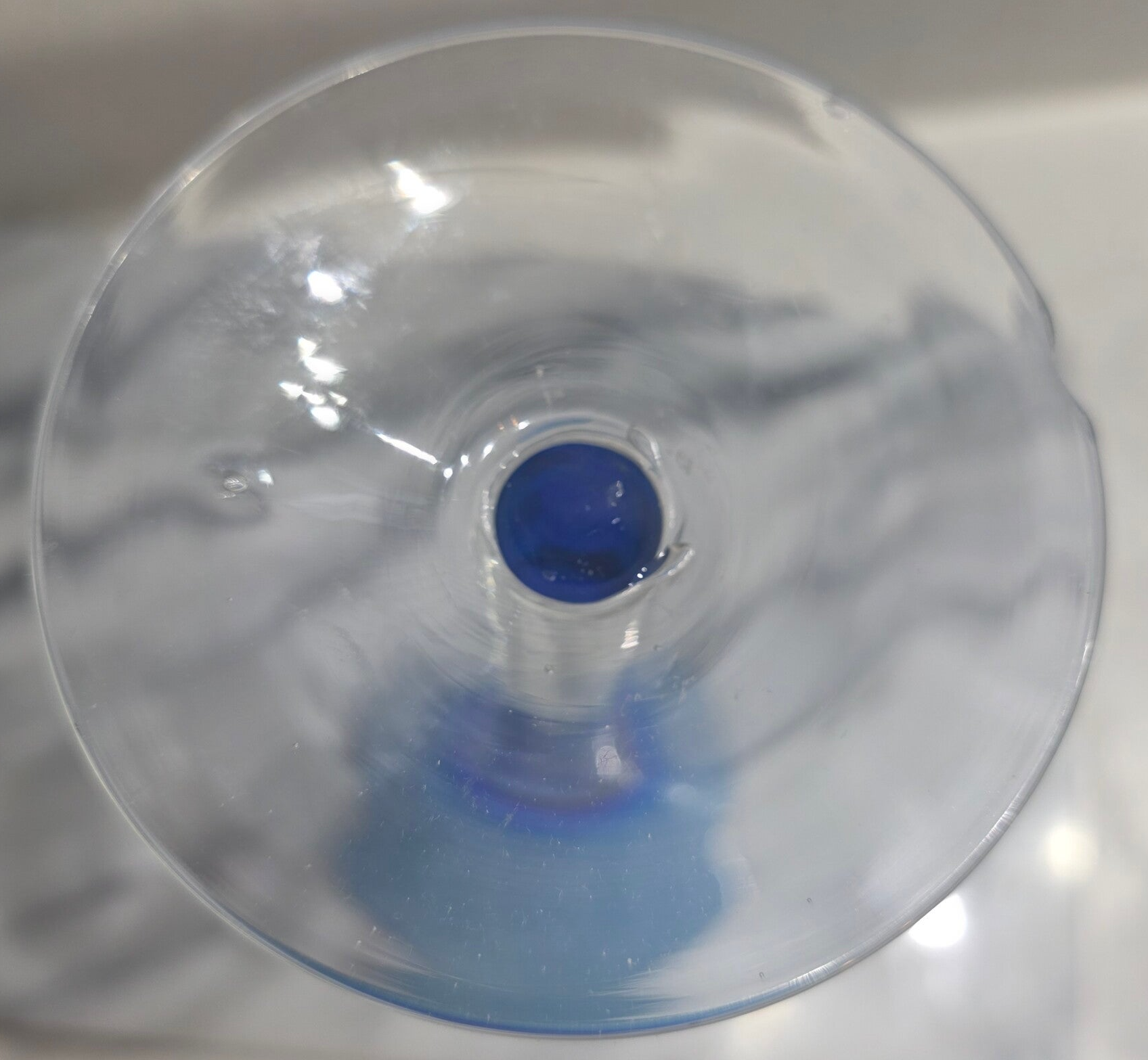This blown wine glass features a stunning cobalt blue and white cased design with a clear stem. Standing at 8 5/8”, this round glassware piece is perfect for anyone looking to add a touch of elegance to their drinkware collection. The glossy finish adds a sleek and decorative element to this stylish wine glass, making it a standout piece in any kitchen or bar setting. Small chip in base but smooth.