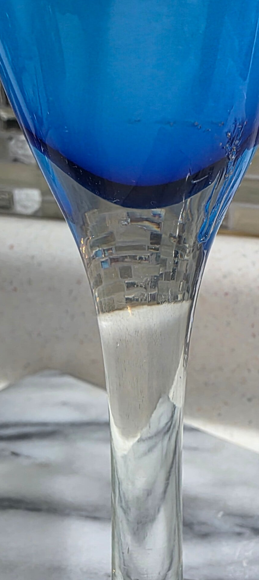 Cobalt Blue White Cased Clear Stem Blown Wine Glass, 8 5/8”