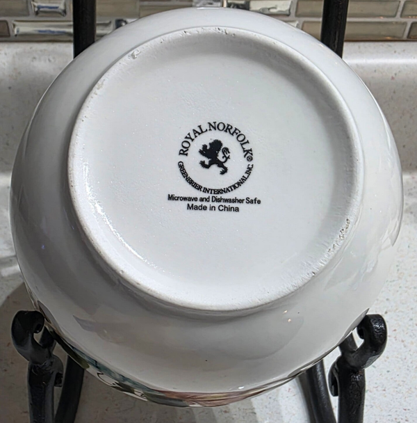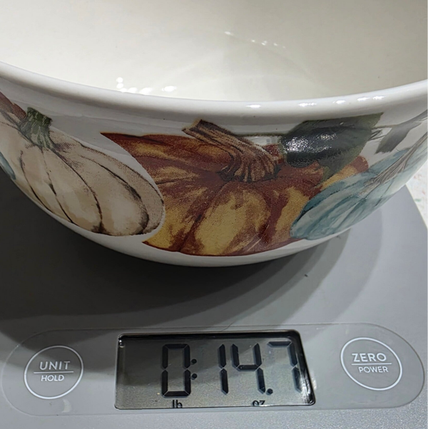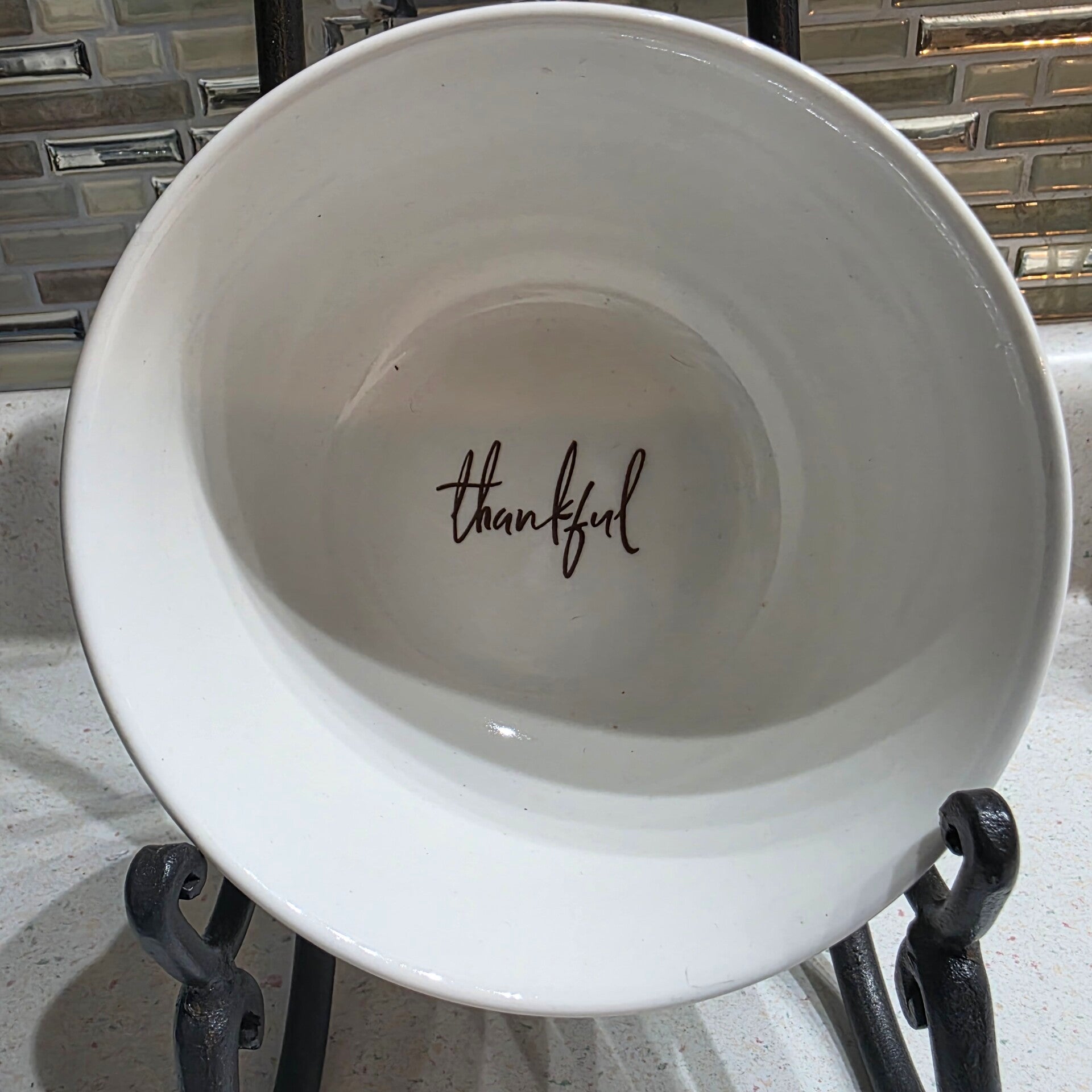 Features a watercolor-style design with orange, turquoise, and off-white pumpkins and green leaves. Measures 6 inches in width and 3 inches in height. Glazed ceramic or stoneware. Microwave and dishwasher safe. Features the word "Thankful" printed inside.