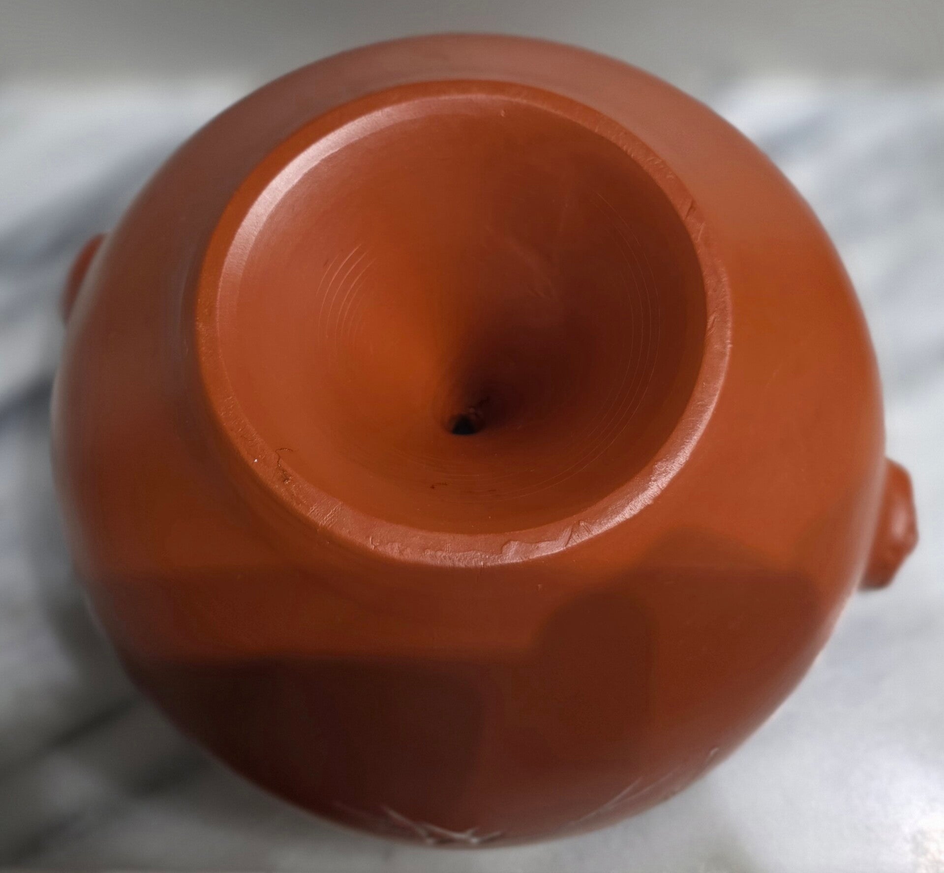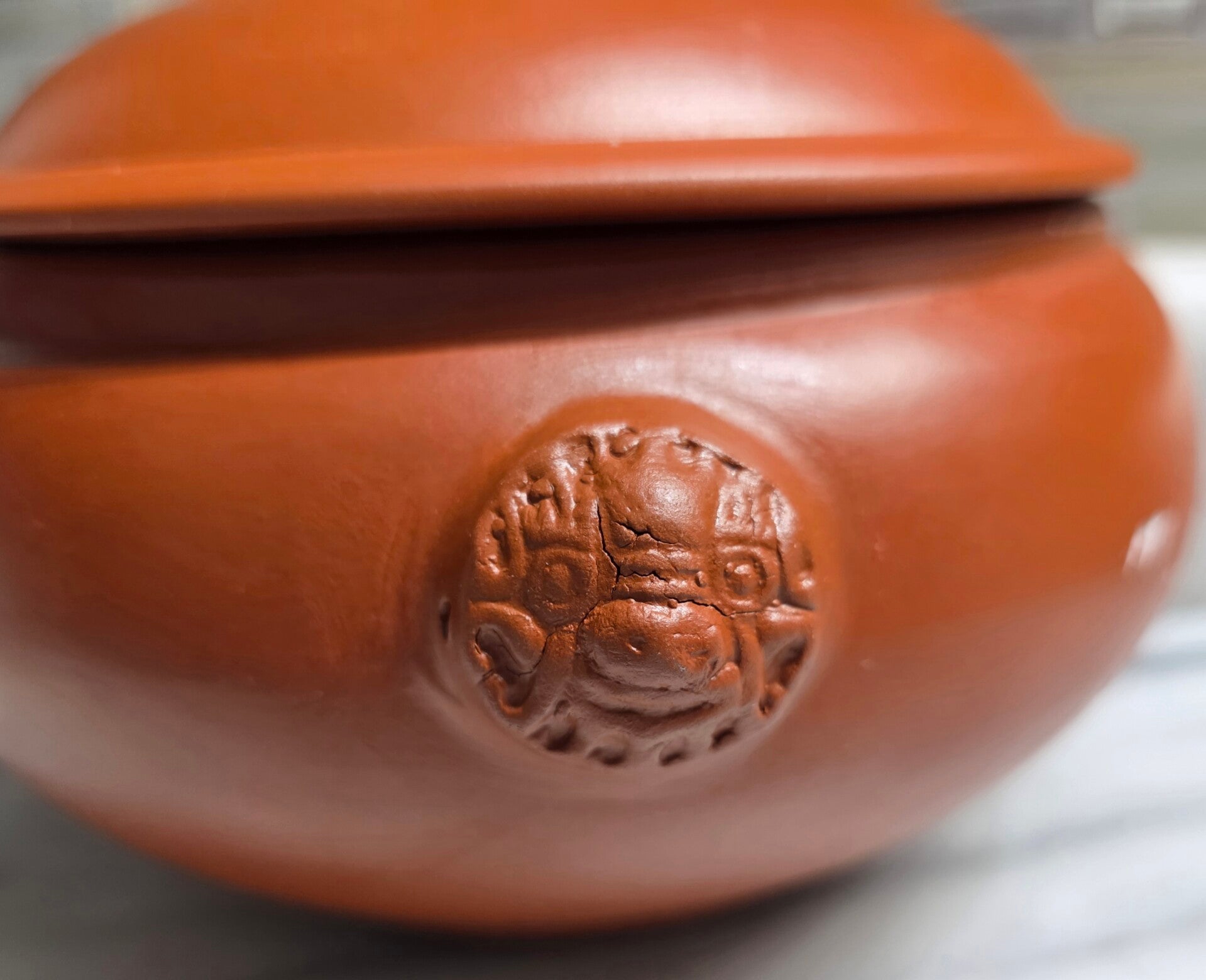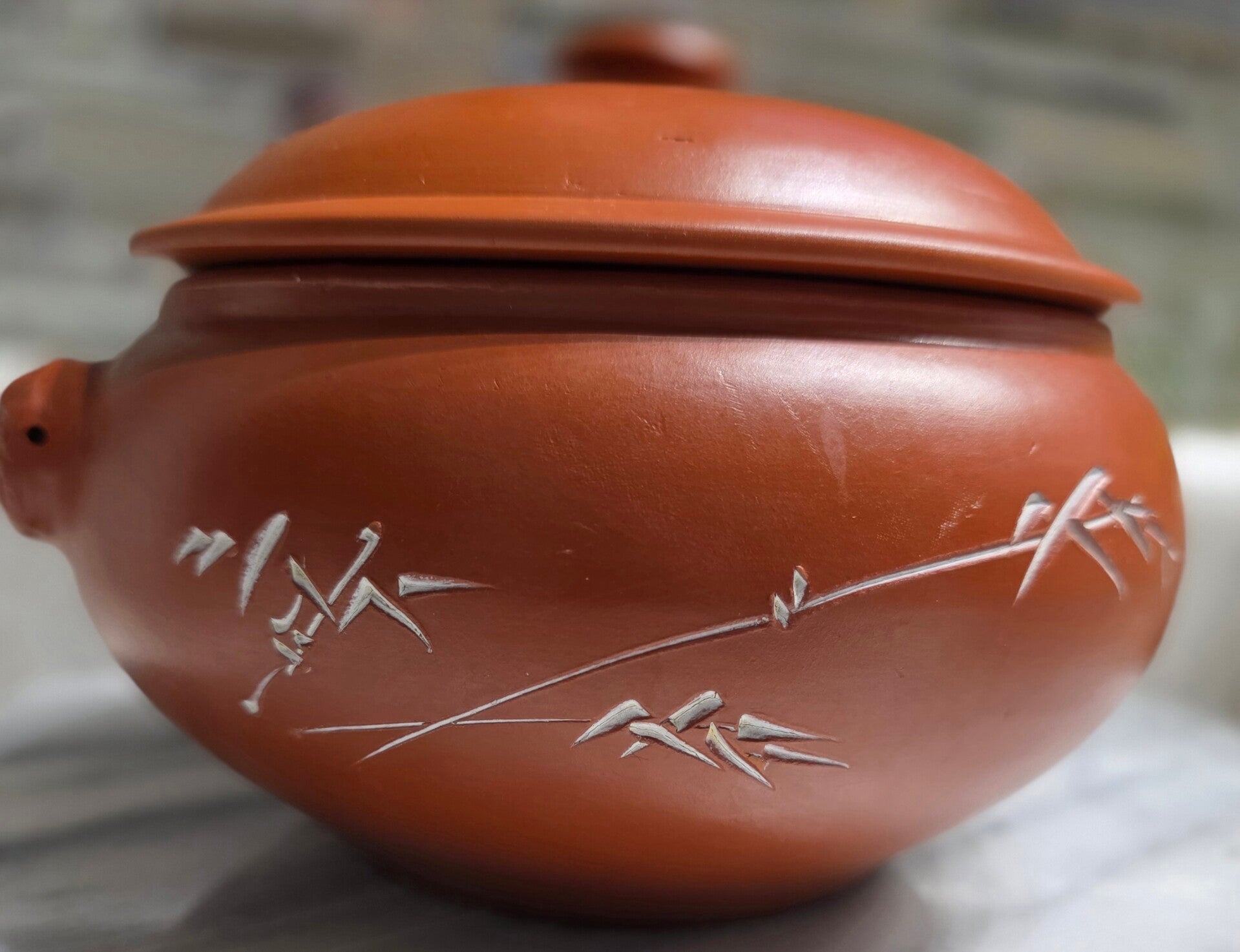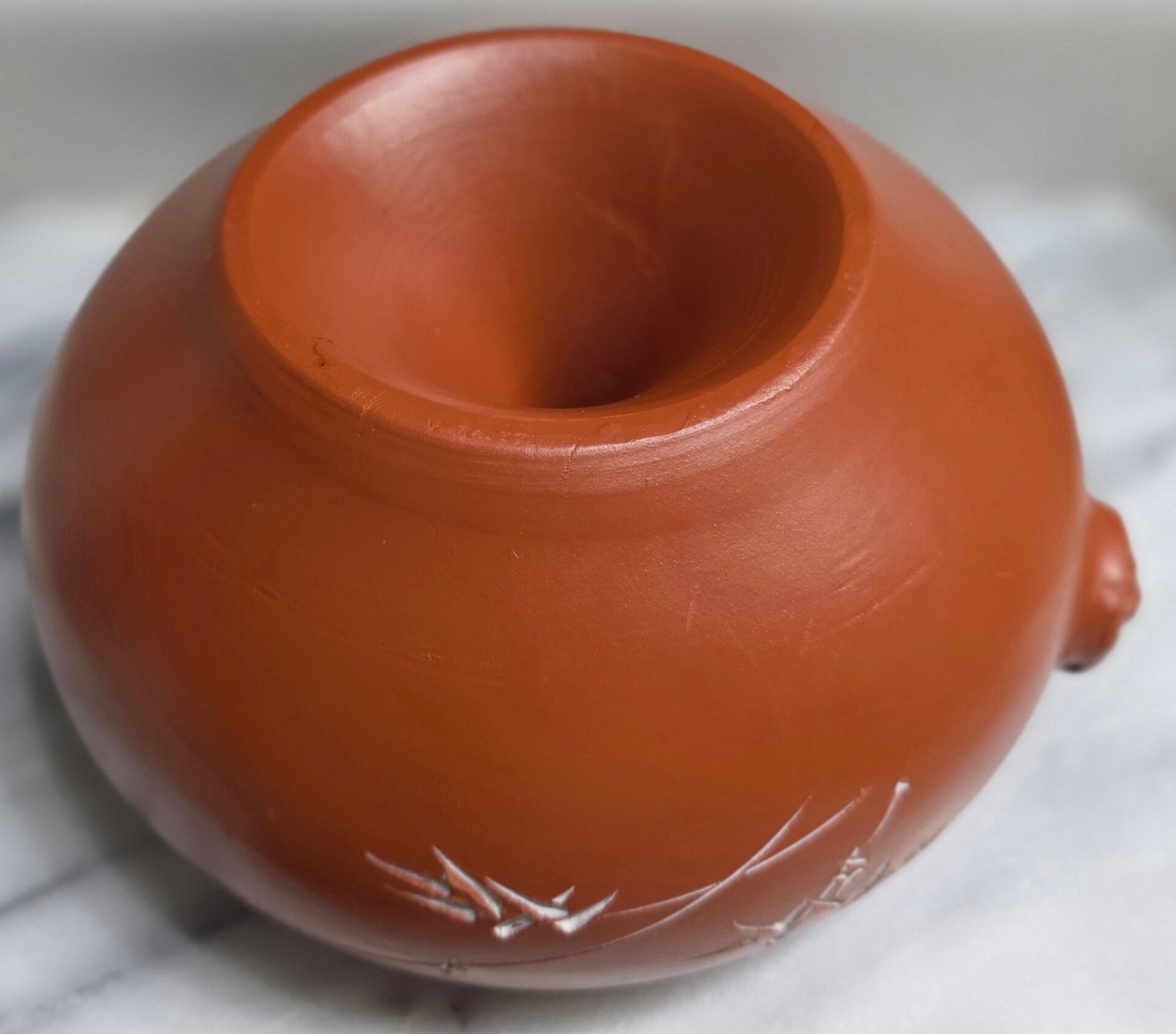 A ceramic cooking vessel crafted from unglazed red clay, renowned for its ability to absorb heat evenly and retain it for long periods. Handcrafted from purple clay (Zisha) or red clay, which is prized for its breathability and ability to retain the natural flavors of the food. The pot is distinguished by its rounded body and a funnel-shaped interior chimney (often hidden under the lid). This allows steam to enter from a separate boiling pot below, condensing into a rich, clear broth inside. Features an etched bamboo design and figural handles. This style of vessel is traditionally used for steam cooking, which helps retain the natural flavors and juices of food. Measures approximately 10 inches wide (including handles), with an 8-inch bowl diameter and standing 5.5 inches tall.