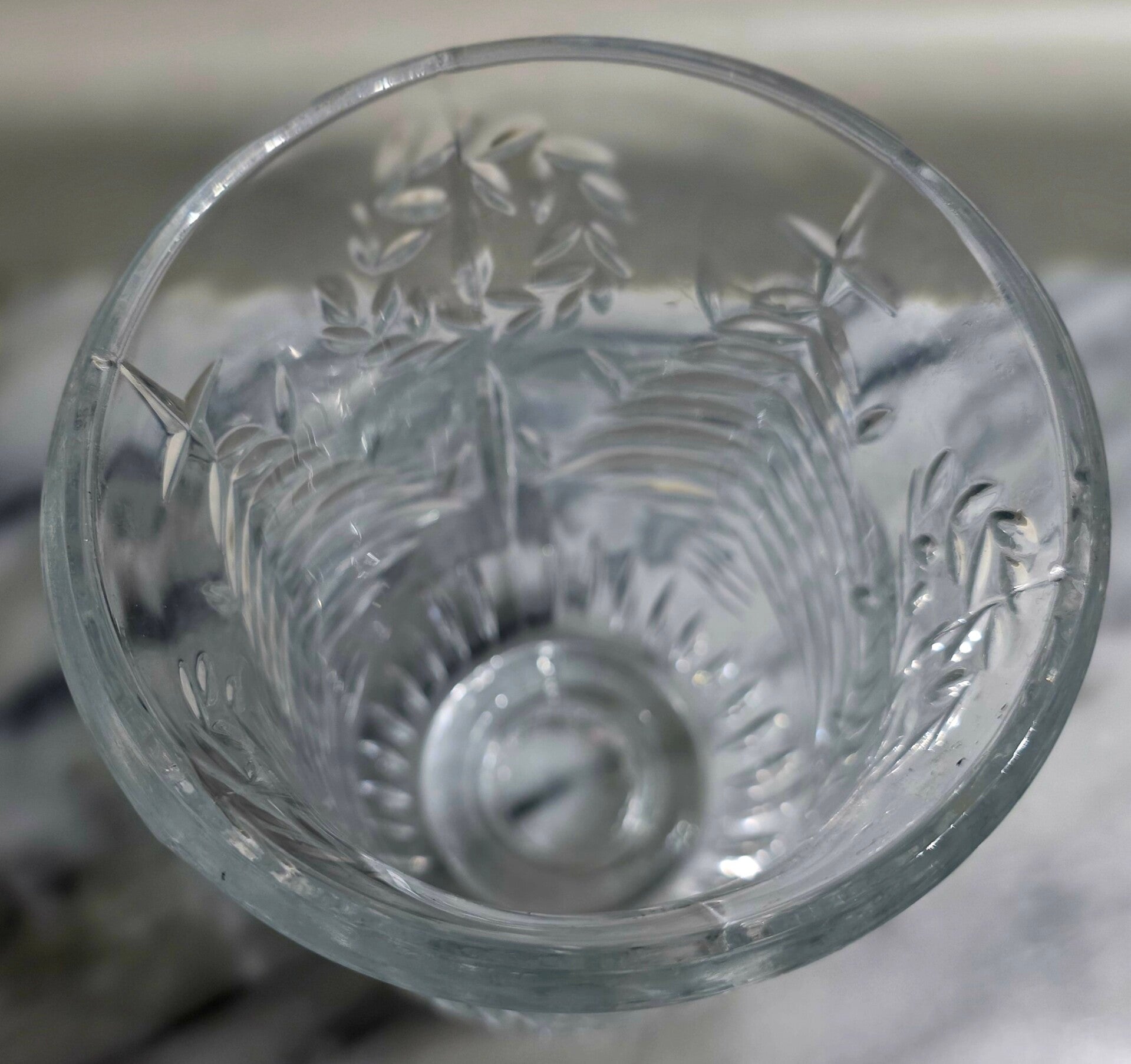 Clear 24% lead crystal featuring an etched or embossed Christmas tree pattern. Stands around 6 to 7.5 inches tall with a flared top. Designed as a replacement globe for hurricane lamps, candle holders, or sconces.