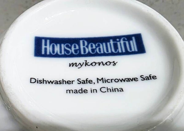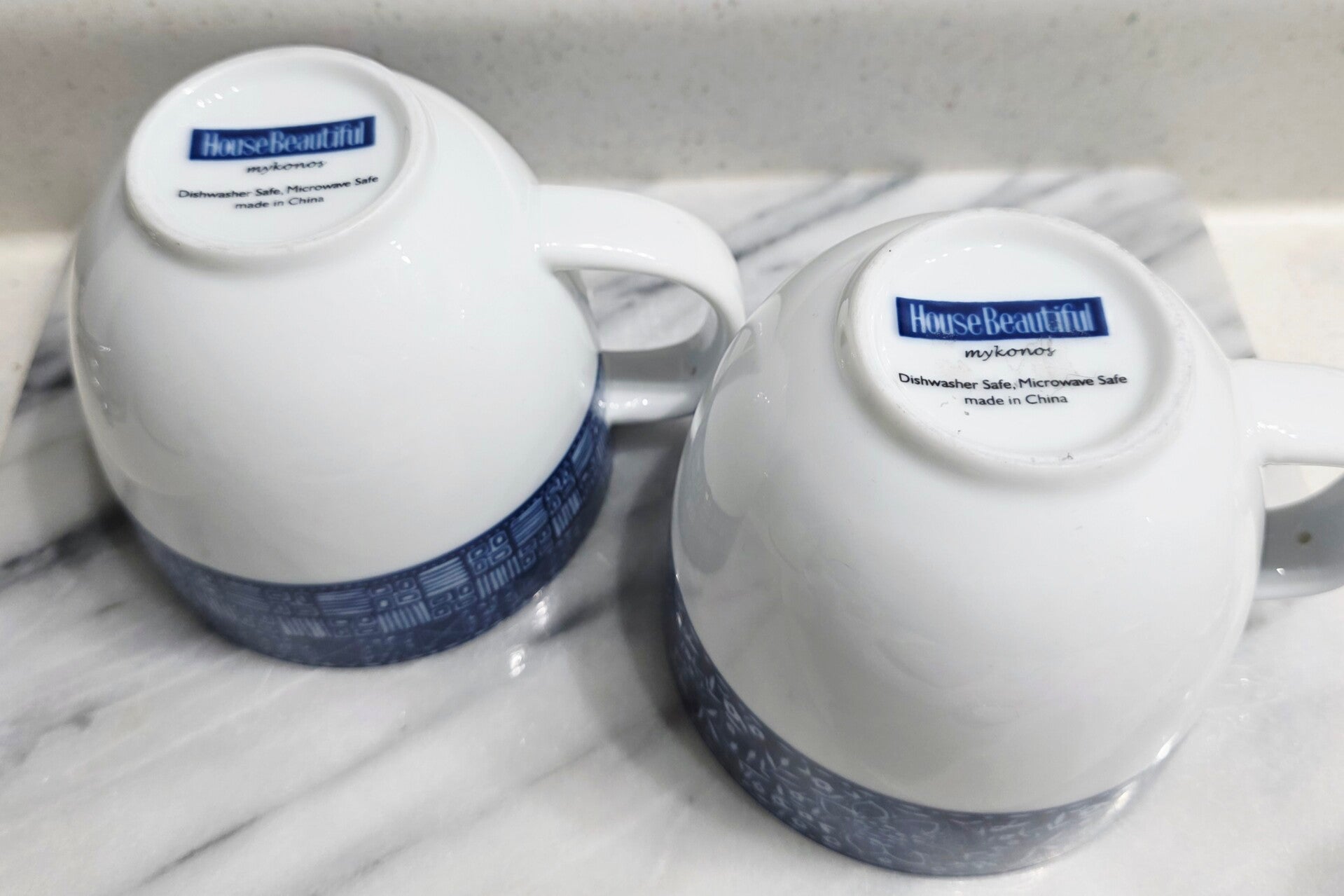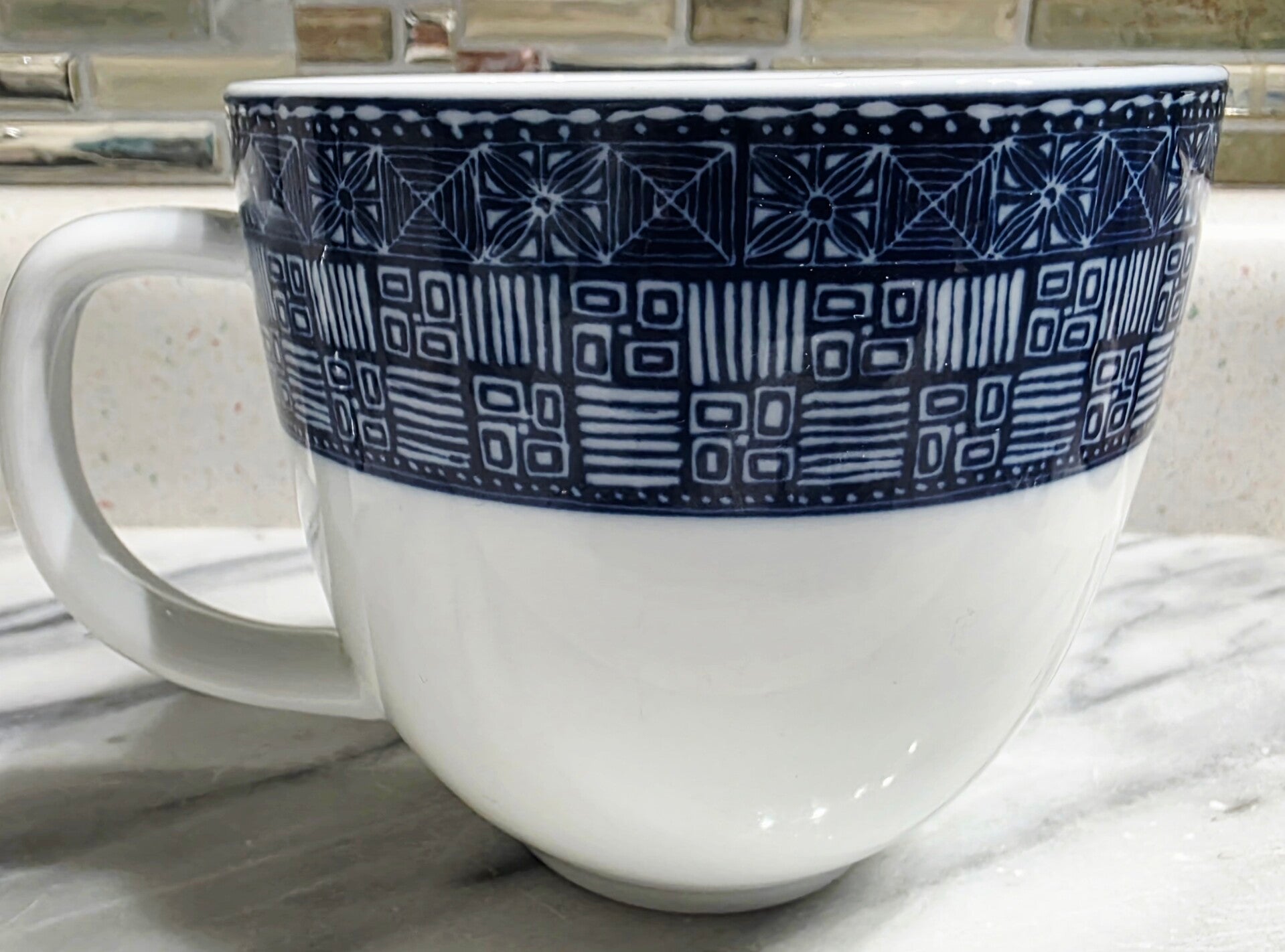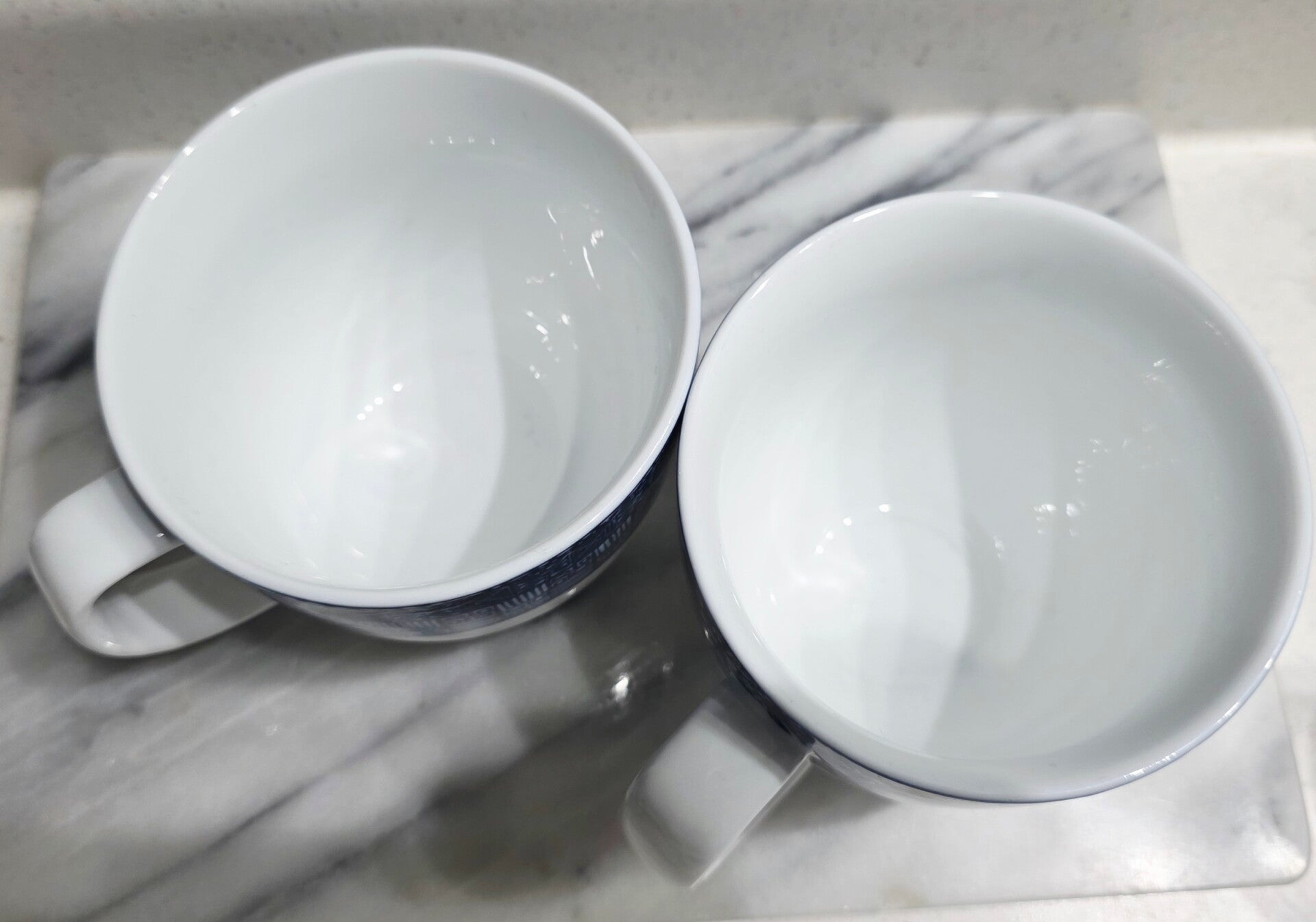They feature a smooth, glossy white glaze that serves as a canvas for the deep blue decorative bands. The material is designed to effectively retain the temperature of both hot and cold beverages. Microwave and dishwasher safe and heavy, weighing over 1lb.each.