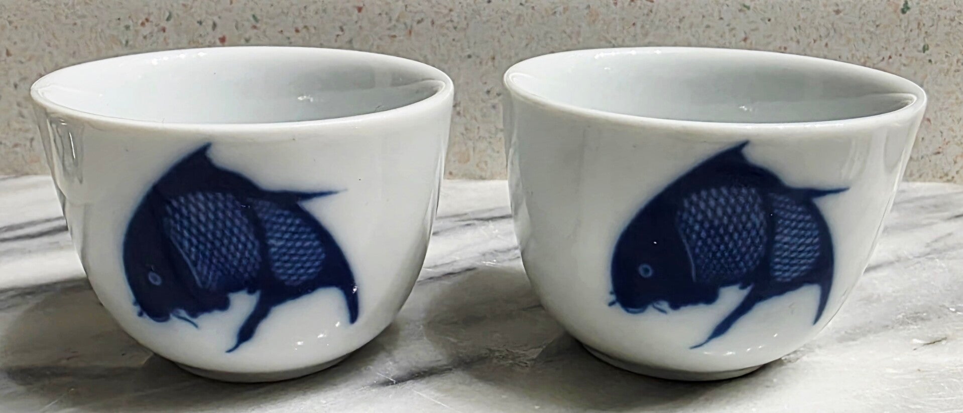 Chinese Cobalt Blue Koi Porcelain Sake or Tea Cups-Set of 2